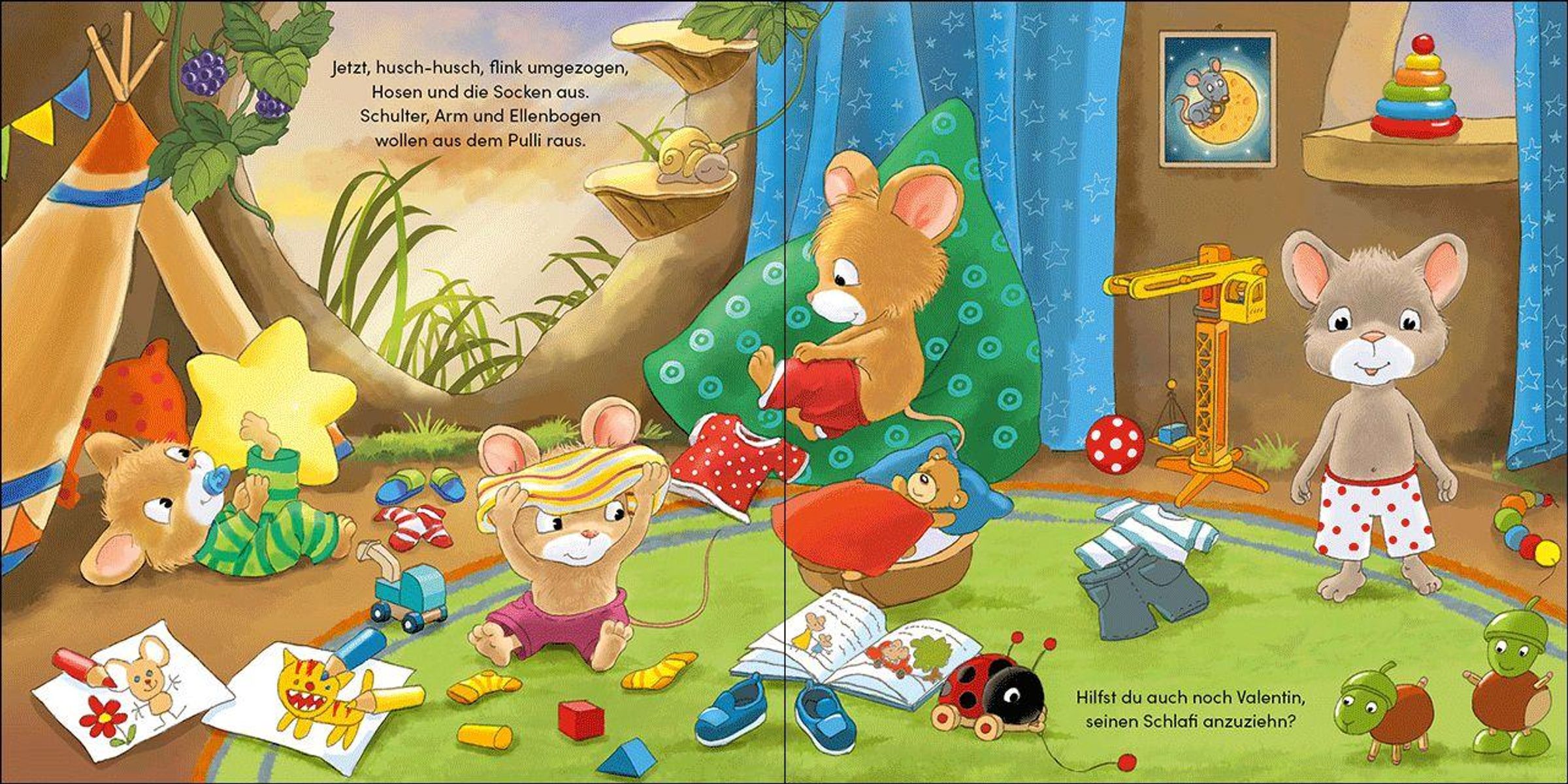 Alltagsnahe Szenen, die jede Familie kennt: Schlafanzug anziehen, Zähne putzen, Kuscheltier suchen, Nachtlicht anschalten und gemütlich einkuscheln