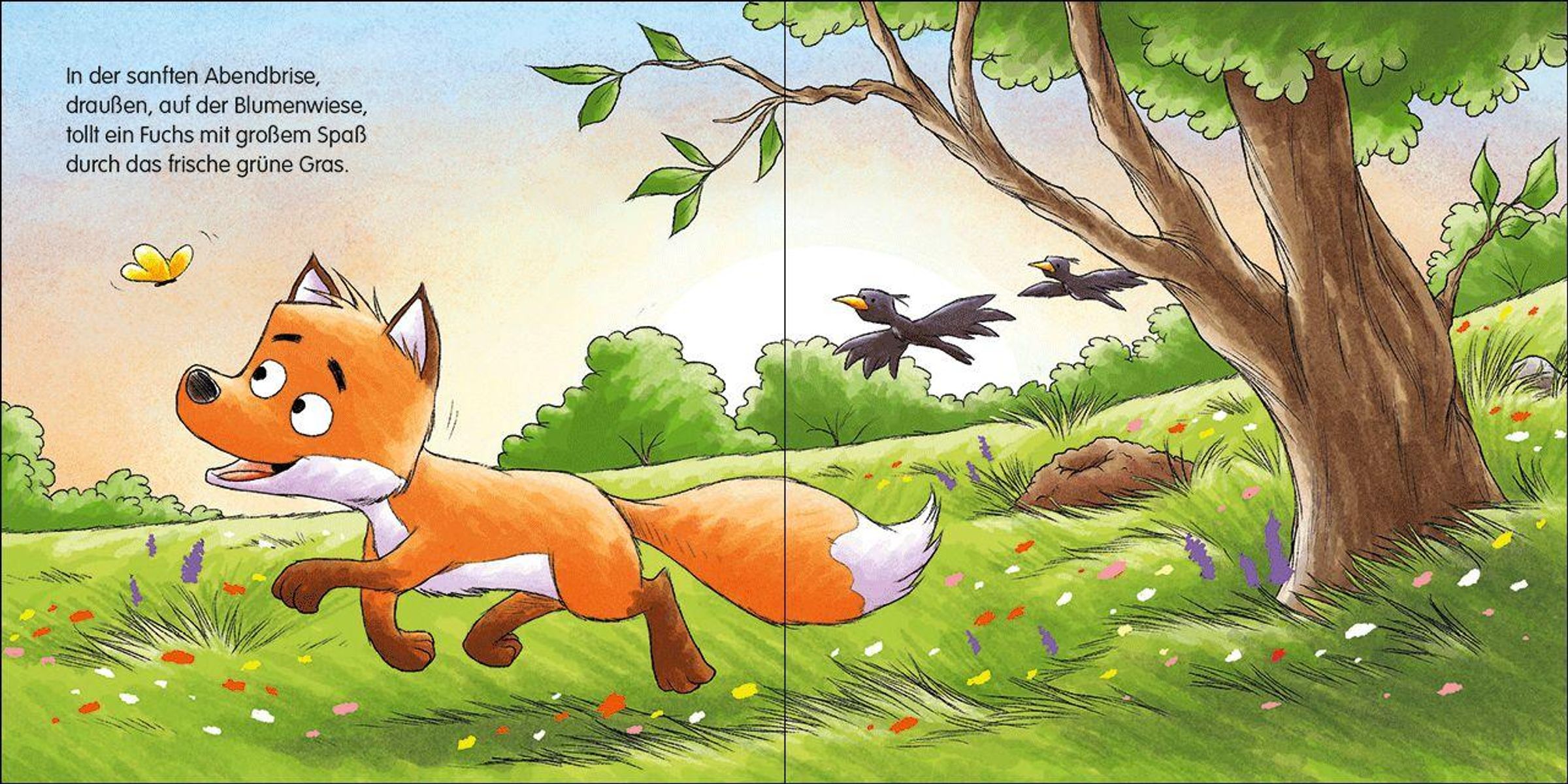 Der Abend zieht herauf und der kleine Fuchs wird müde. Doch bevor er sich schlafen legt, besucht er noch das Eichhörnchen, das Rotkehlchen und die Maulwürfe, und wünscht allen "Gute Nacht".