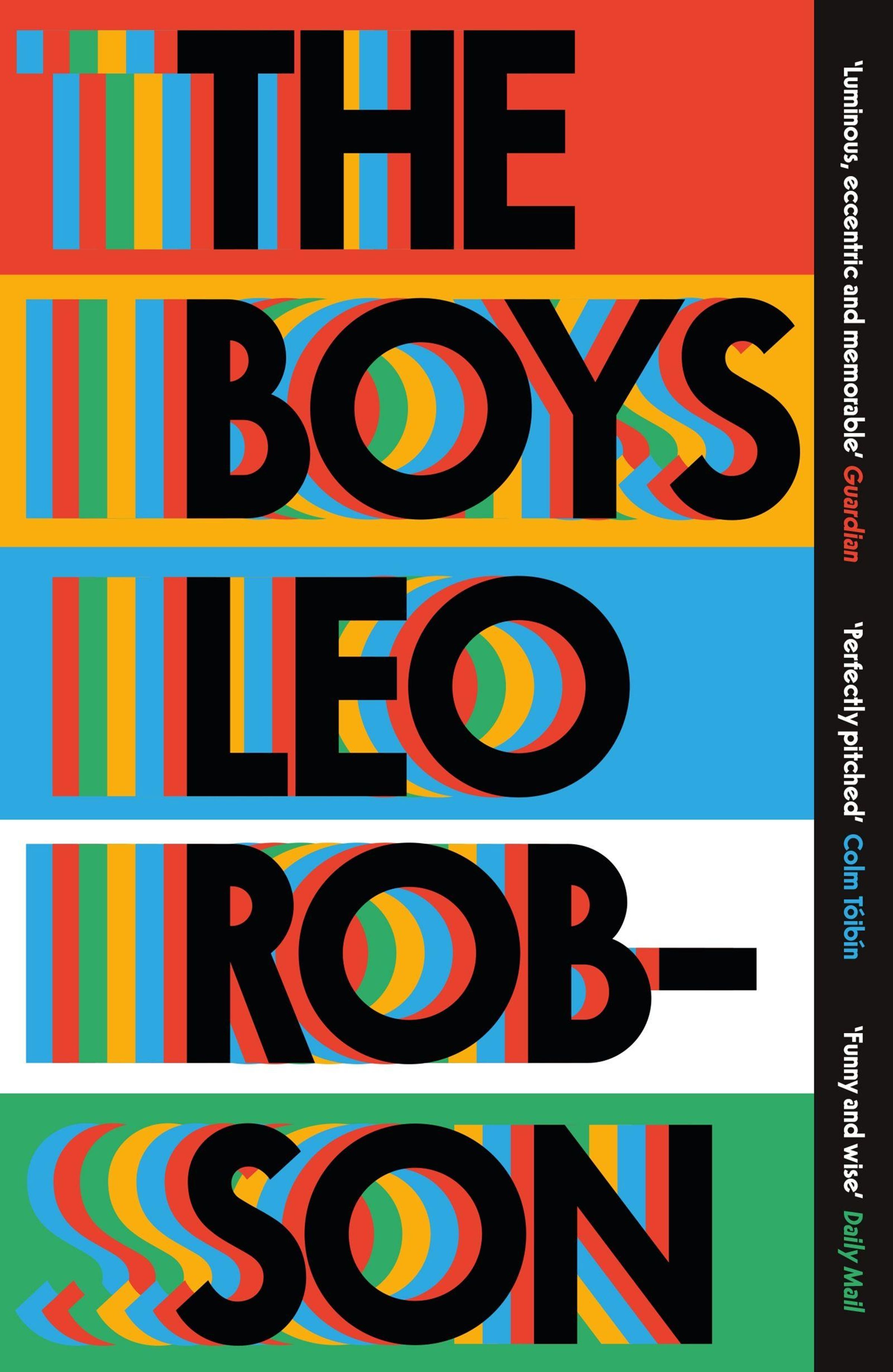 "The Boys Leo Robson" in großen schwarzen Buchstaben, vor buntem, gestreiftem Hintergrund. Zitate am rechten Rand., Buch