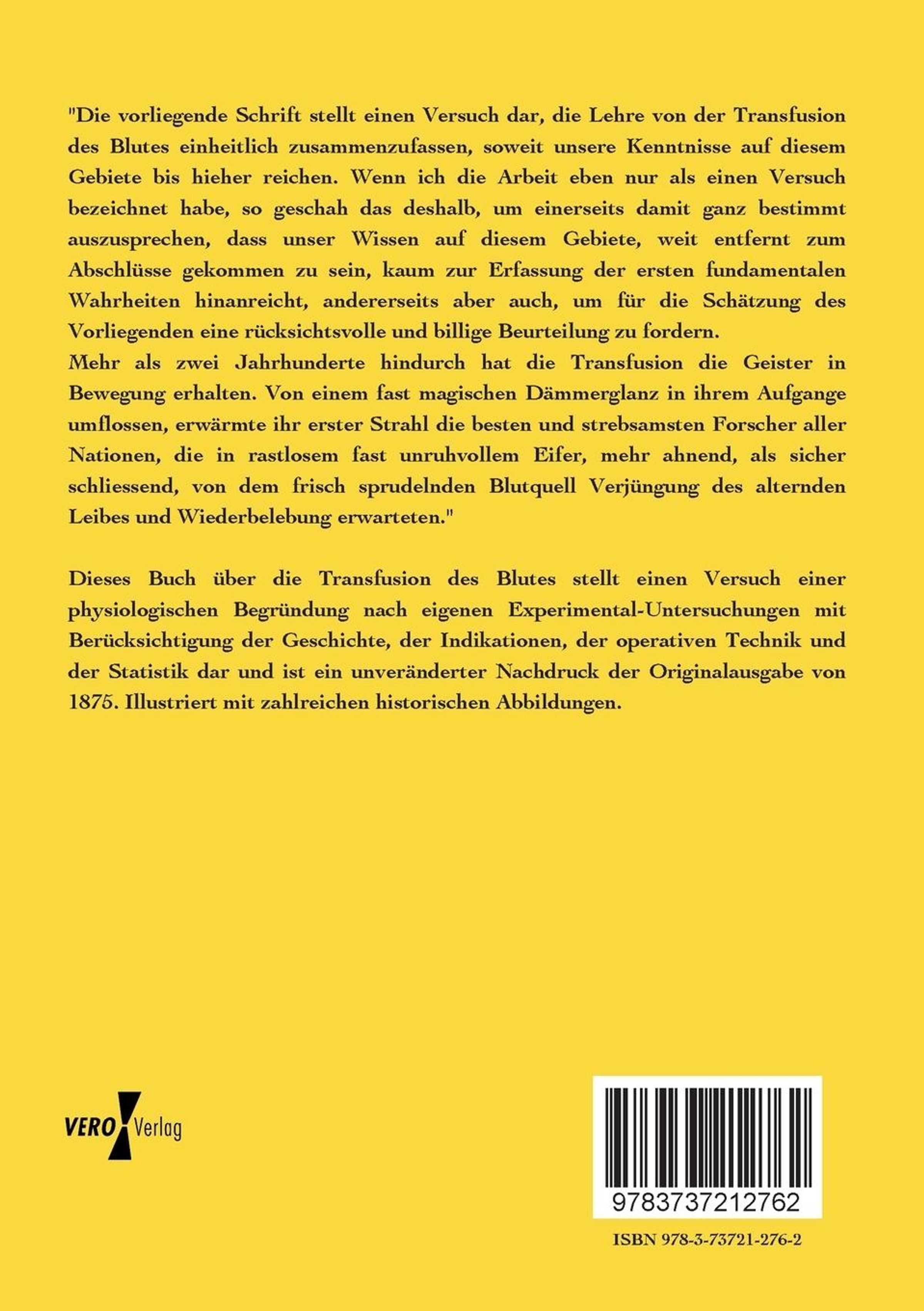 Dieses Buch über die Transfusion des Blutes stellt einen Versuch einer physiologischen Begründung nach eigenen Experimental-Untersuchungen mit Berücksichtigung der Geschichte, der Indikationen, der operativen Technik und der Statistik dar und ist ein unveränderter Nachdruck der Originalausgabe von 1875. Illustriert mit zahlreichen historischen Abbildungen.