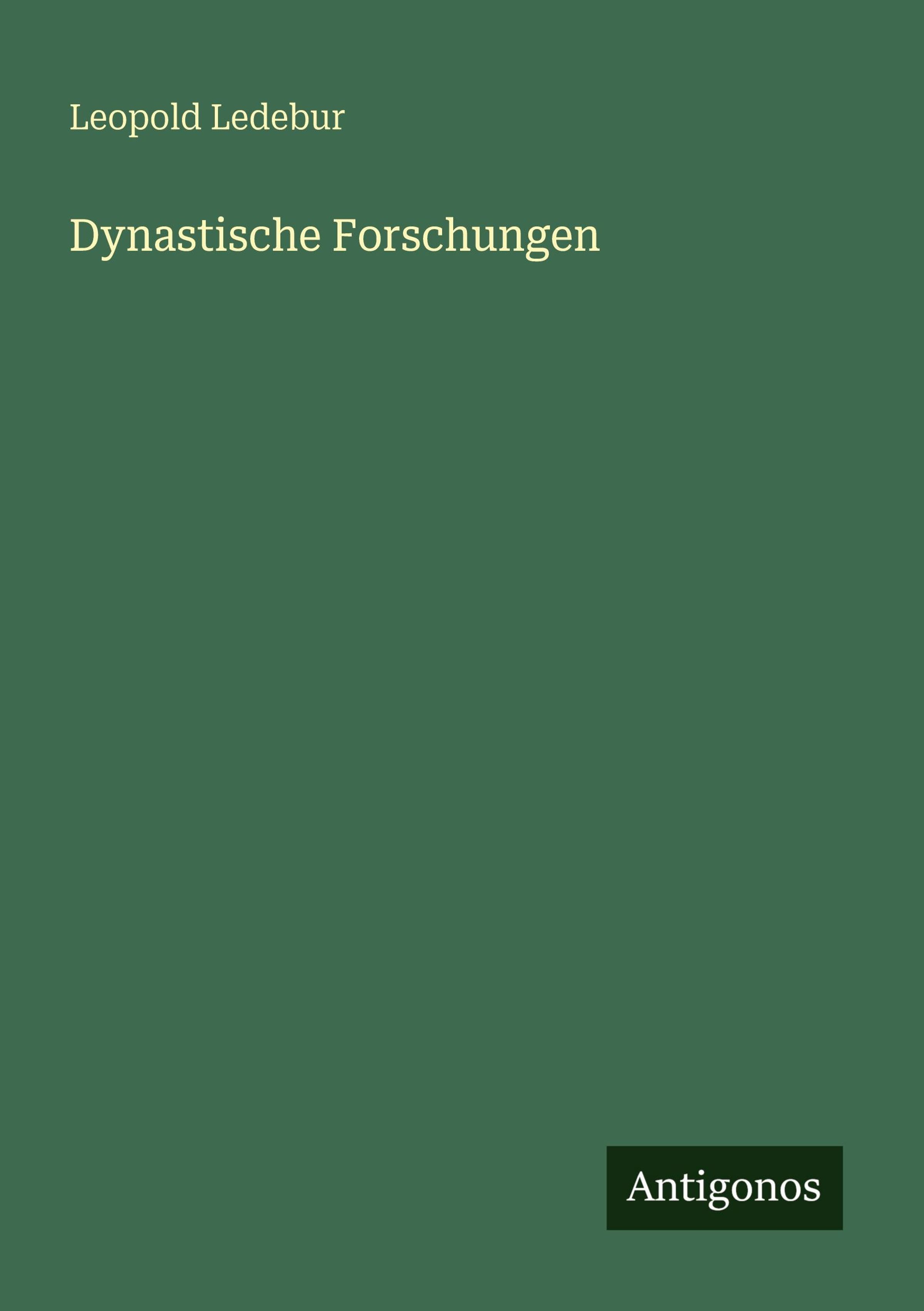 Oben steht "Leopold Ledebur", darunter "Dynastische Forschungen". Unten rechts ist das Logo "Antigonos". Hintergrund in Olivgrün., Buch