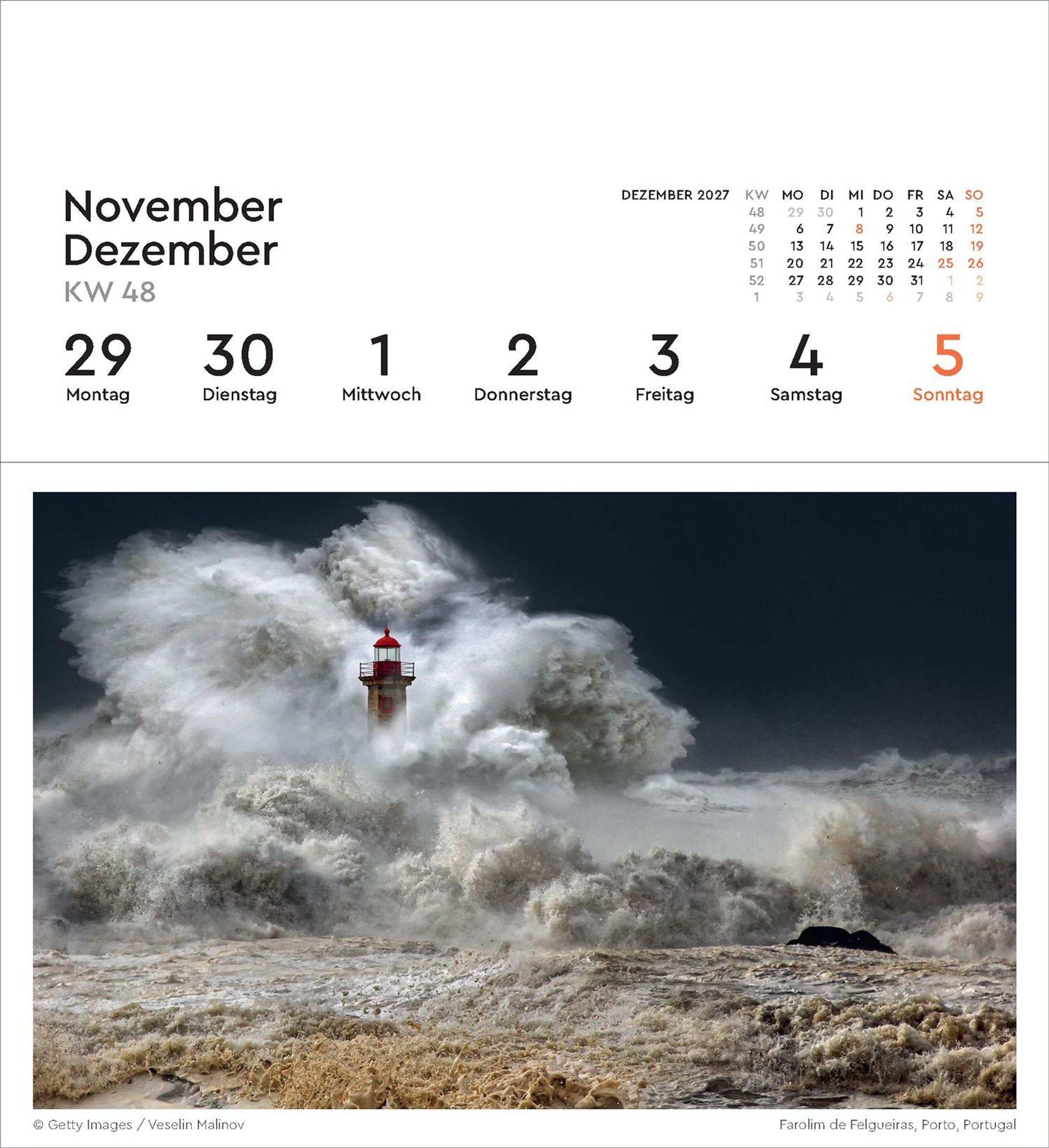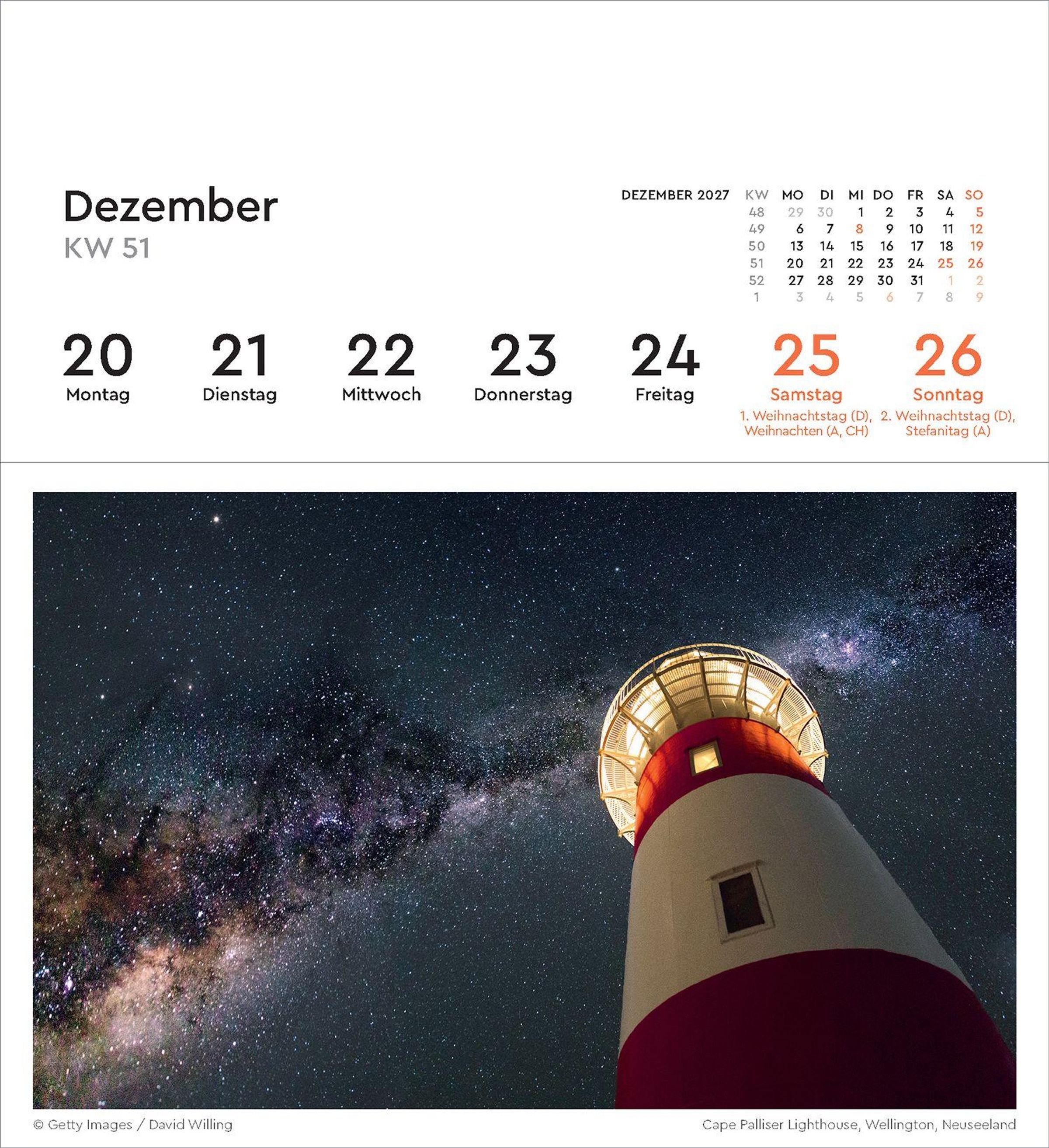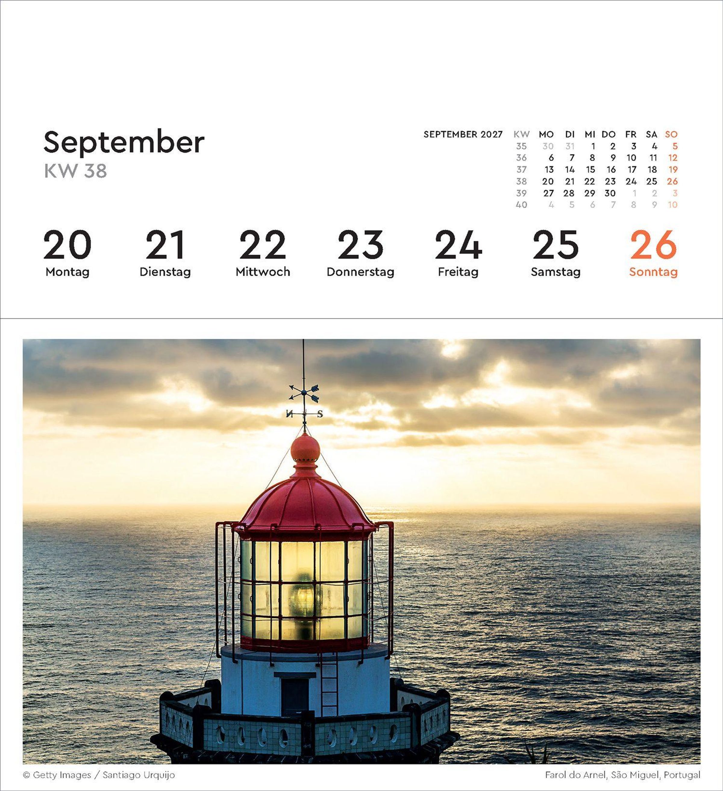 2027 Leuchttürme. Wochenkalender mit 53 abtrennbaren Grußkarten. Leuchtturm auf Felsen im Meer mit Sonnenuntergang., Kalender