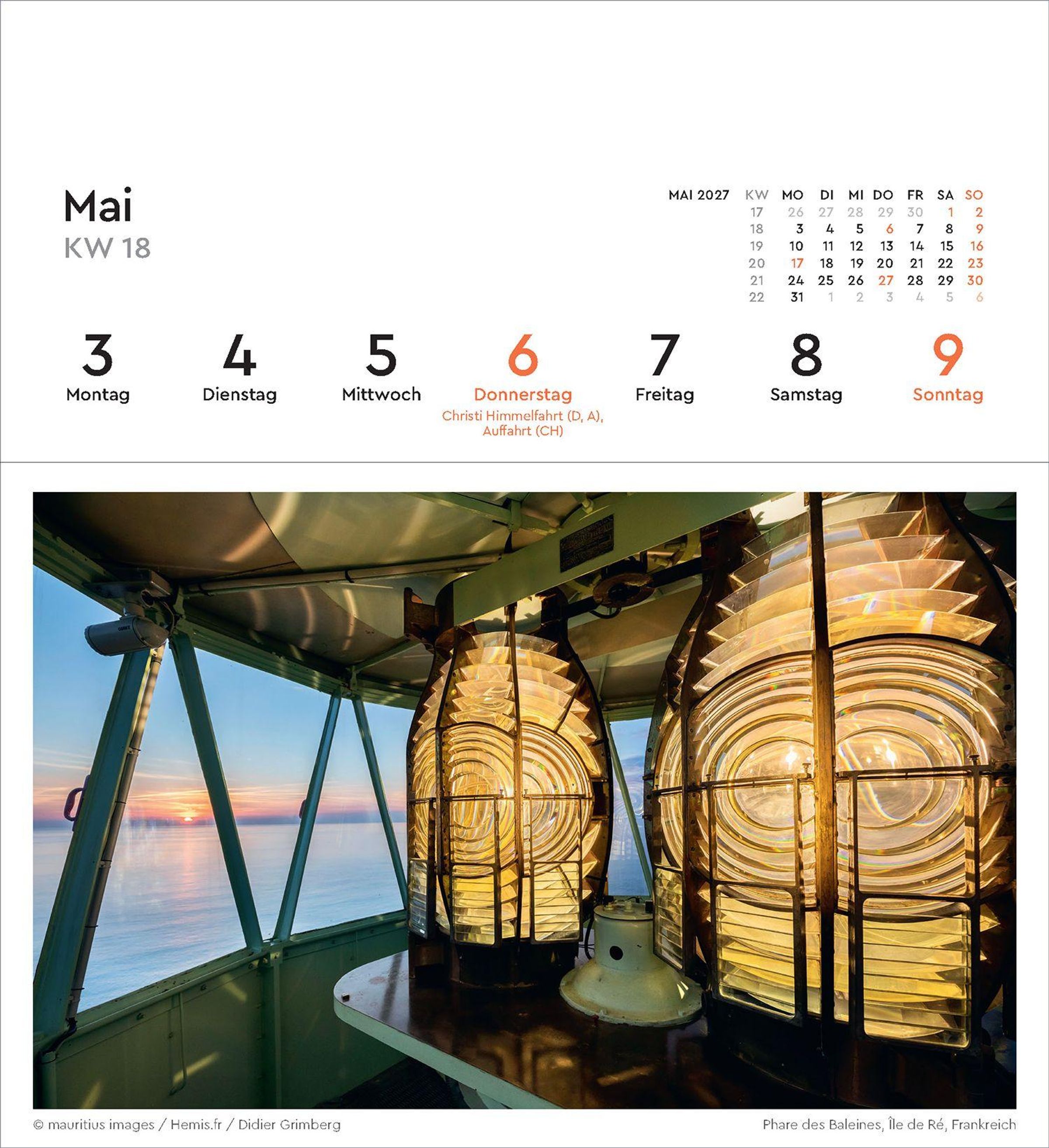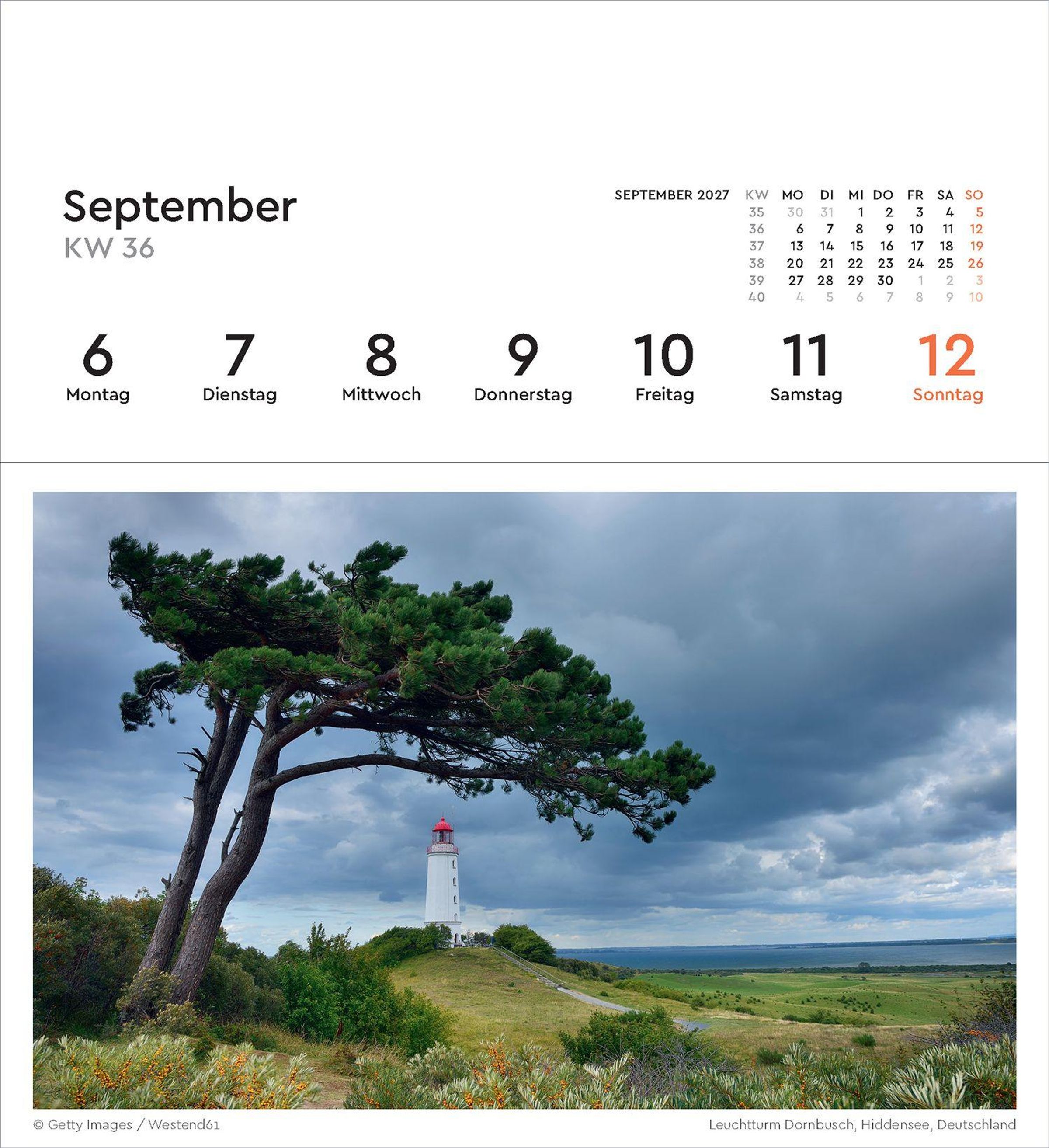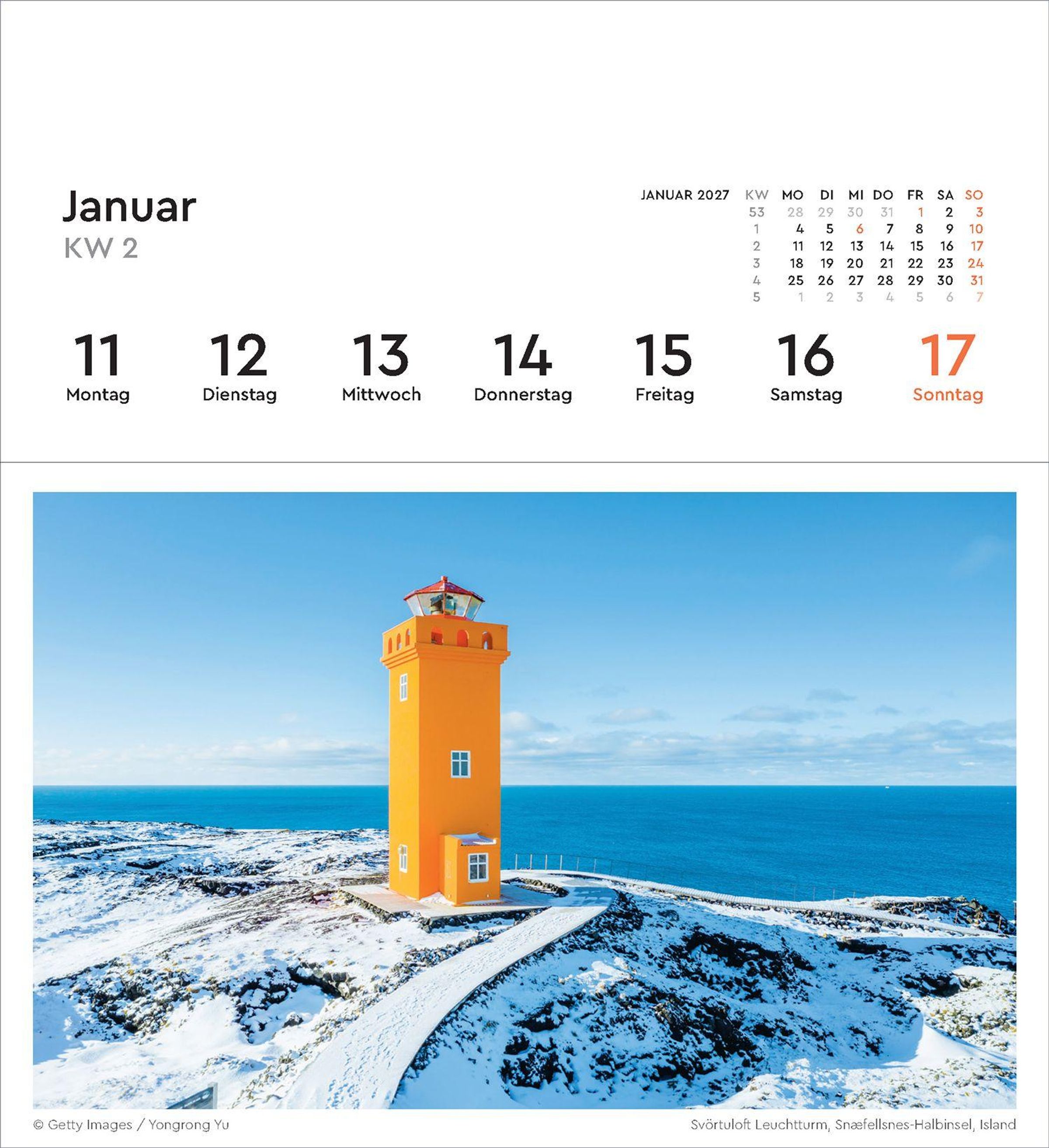 2027 Leuchttürme. Wochenkalender mit 53 abtrennbaren Grußkarten. Leuchtturm auf Felsen im Meer mit Sonnenuntergang., Kalender