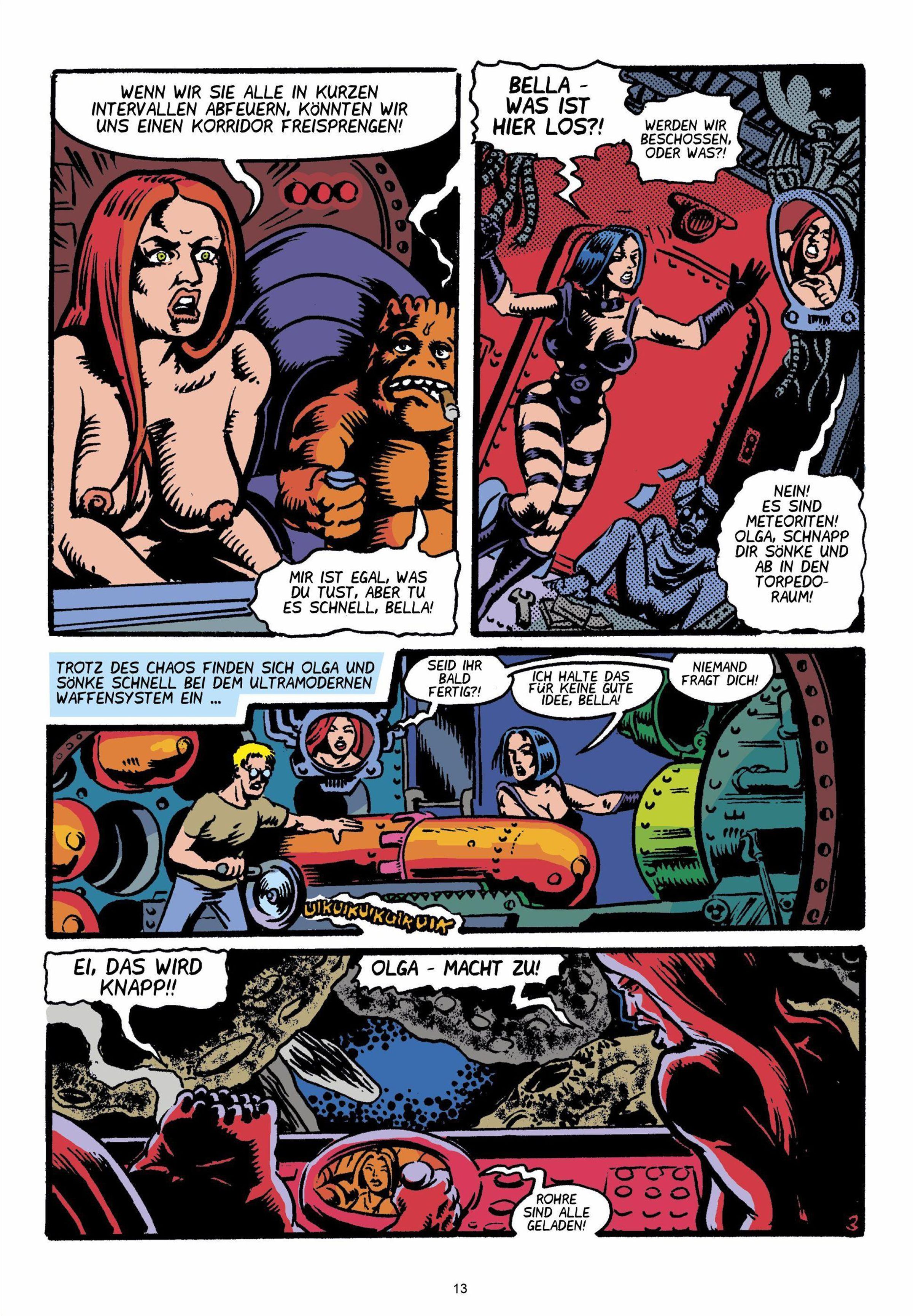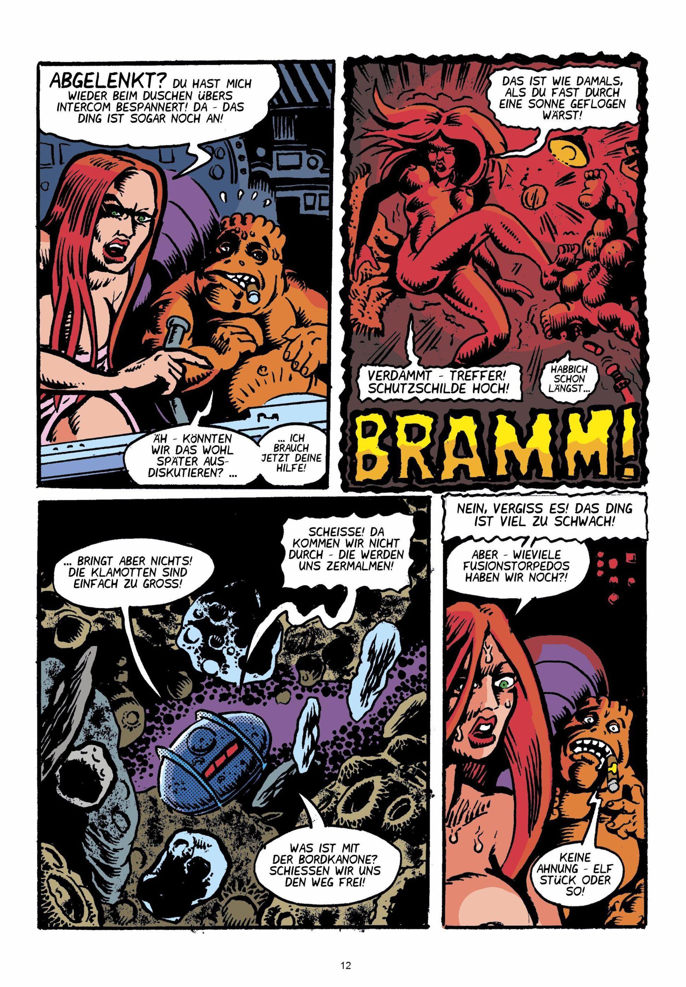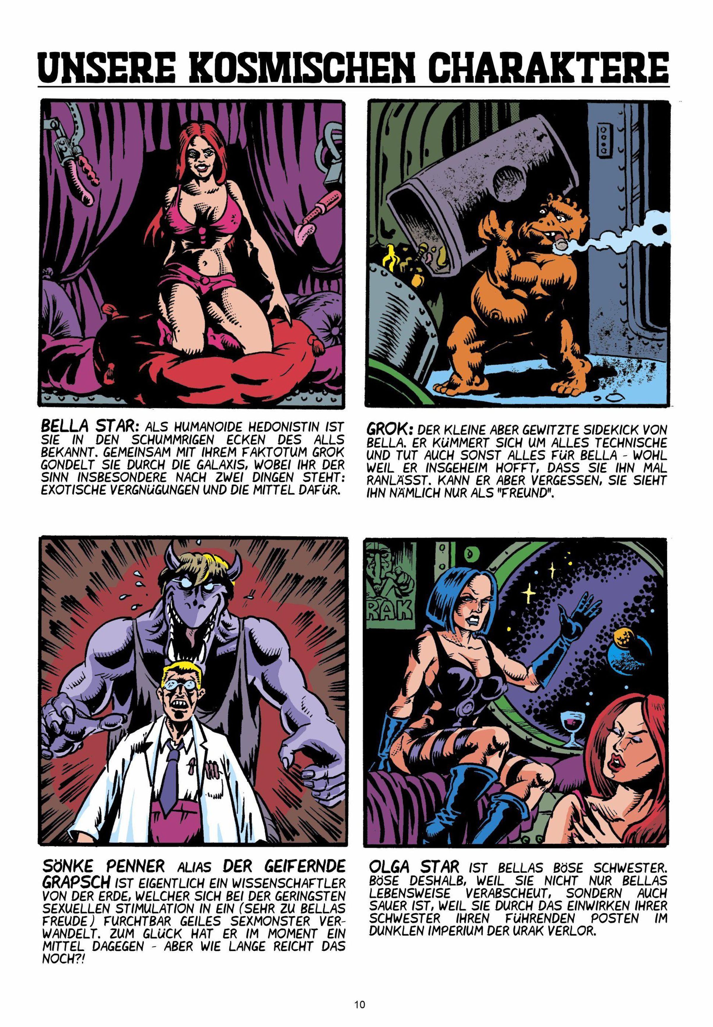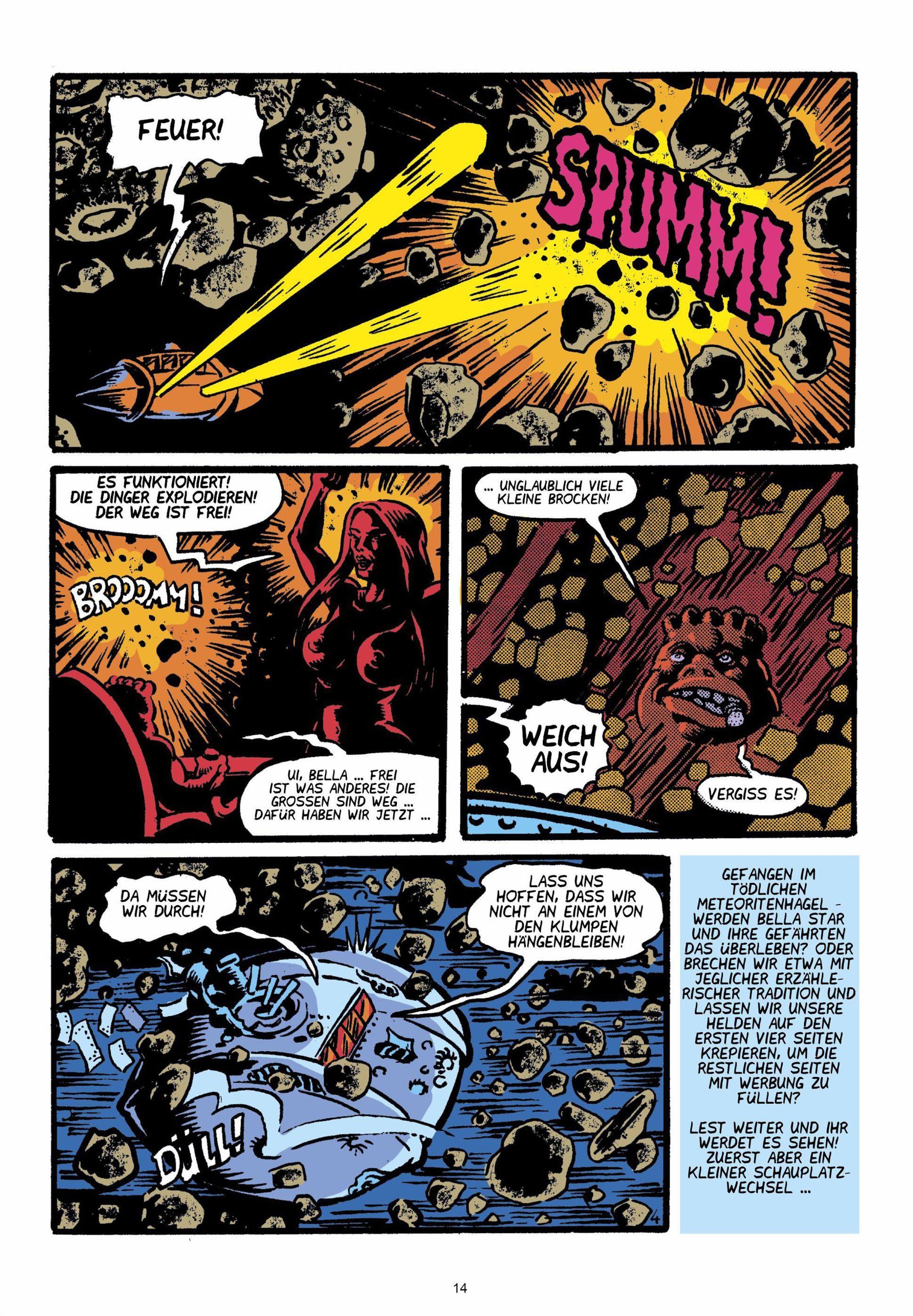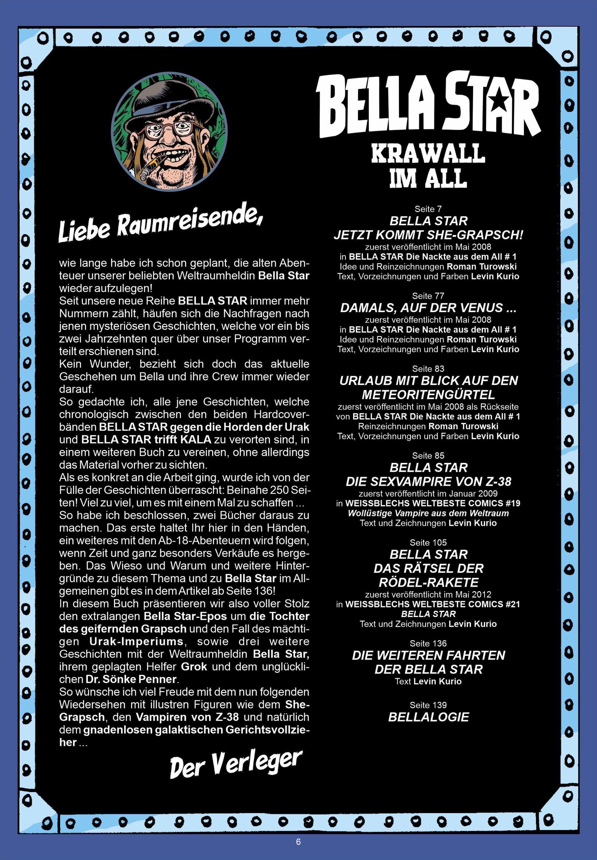 KRAWALL IM ALL!Galaktische Imperien drohen mit planetaren Riesenkanonen, blutdürstige Weltraumvampire lauern auf kargen Planetoiden und wollen mehr, mächtige uralte Artefakte zerlegen einem die neue Untertasse, wenn es nicht gerade Asteroidenschauer tun. Und dann haben sich in dem ganzen Müll an Bord auch noch Riesenspinnen eingenistet!Ja, bei Bella Star und ihrer Crew, vornehmlich ihrem kurz geratenen Co-Piloten Grok und Dr. Sönke Penner alias der geifernde Grapsch, bleibt kein Glubschauge trocken!In diesem Band sind nun die Bella Star-Abenteuer aus den schon seit Ewigkeiten vergriffenen WEISSBLECH Comics-Publikationen BELLA STAR Die Nackte aus dem All # 1, WWC #19 Wollüstige Vampire aus dem Weltraum und WWC #21 BELLA STAR endlich nachgedruckt. Ein Fest für Freunde undergroundiger Sci-Fi in Nietenoptik, in herrlich bunten Comicfarben auf extraholziges Papier gedruckt - ein Knaller für jeden Pulpfreund!