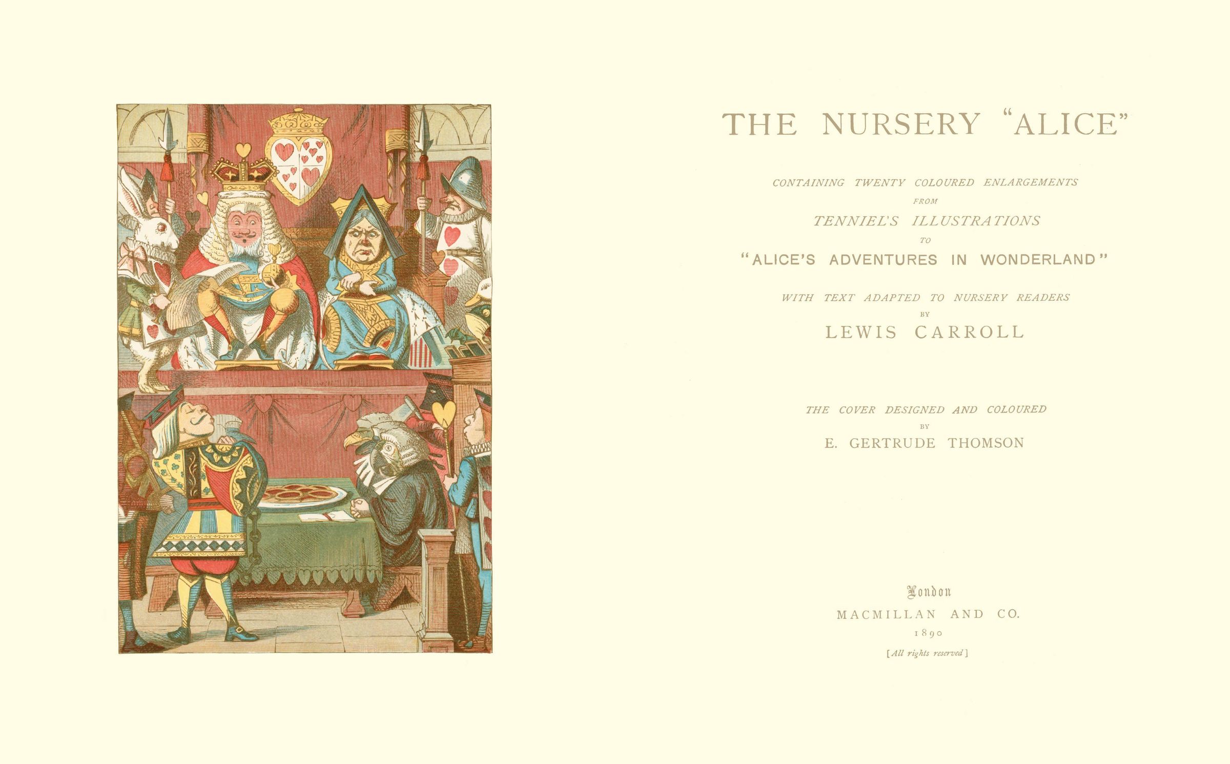 The Nursery Alice , originally published by Macmillan & Co. in 1890, was the very first colour edition of Alice's Adventures in Wonderland . It was intended, wrote Carroll, "to be read by Children aged from Nought to Five. To be read? Nay, not so! Say rather to be thumbed, to be cooed over, to be dogs'-eared, to be rumpled, to be kissed . . ."