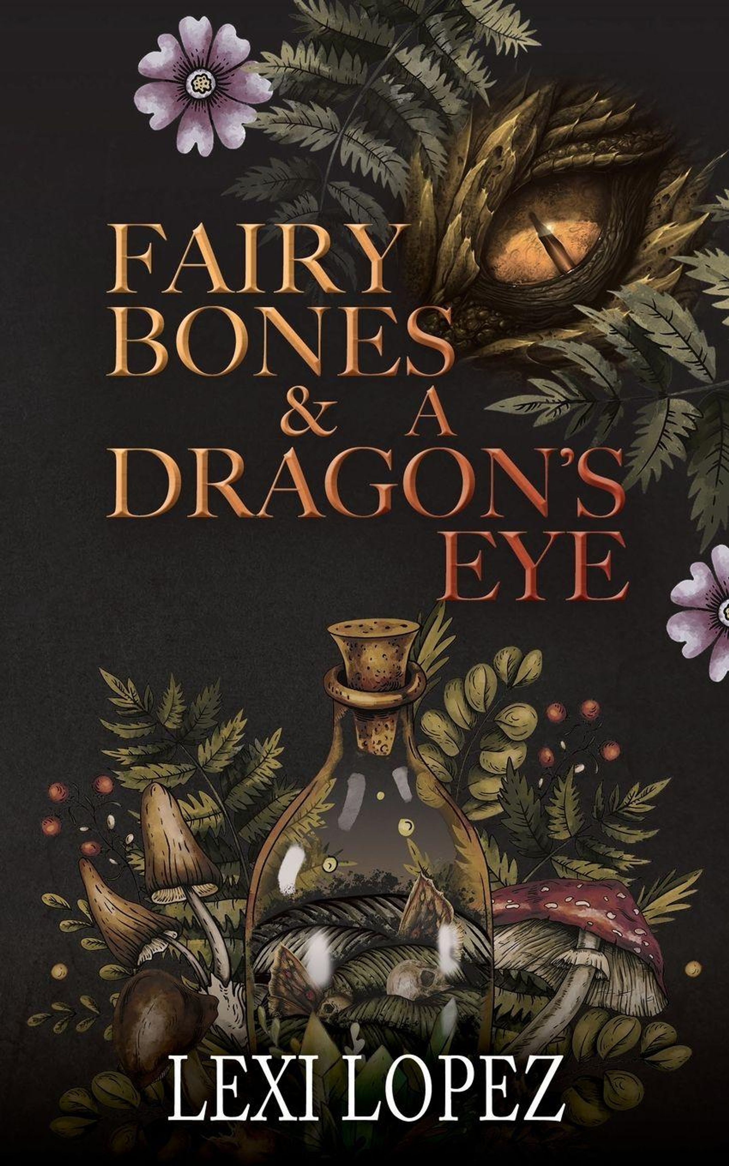 Der Text lautet: "FAIRY BONES & A DRAGON'S EYE" und "LEXI LOPEZ". Eine Illustration mit Blumen, Farnen und Pilzen., Buch