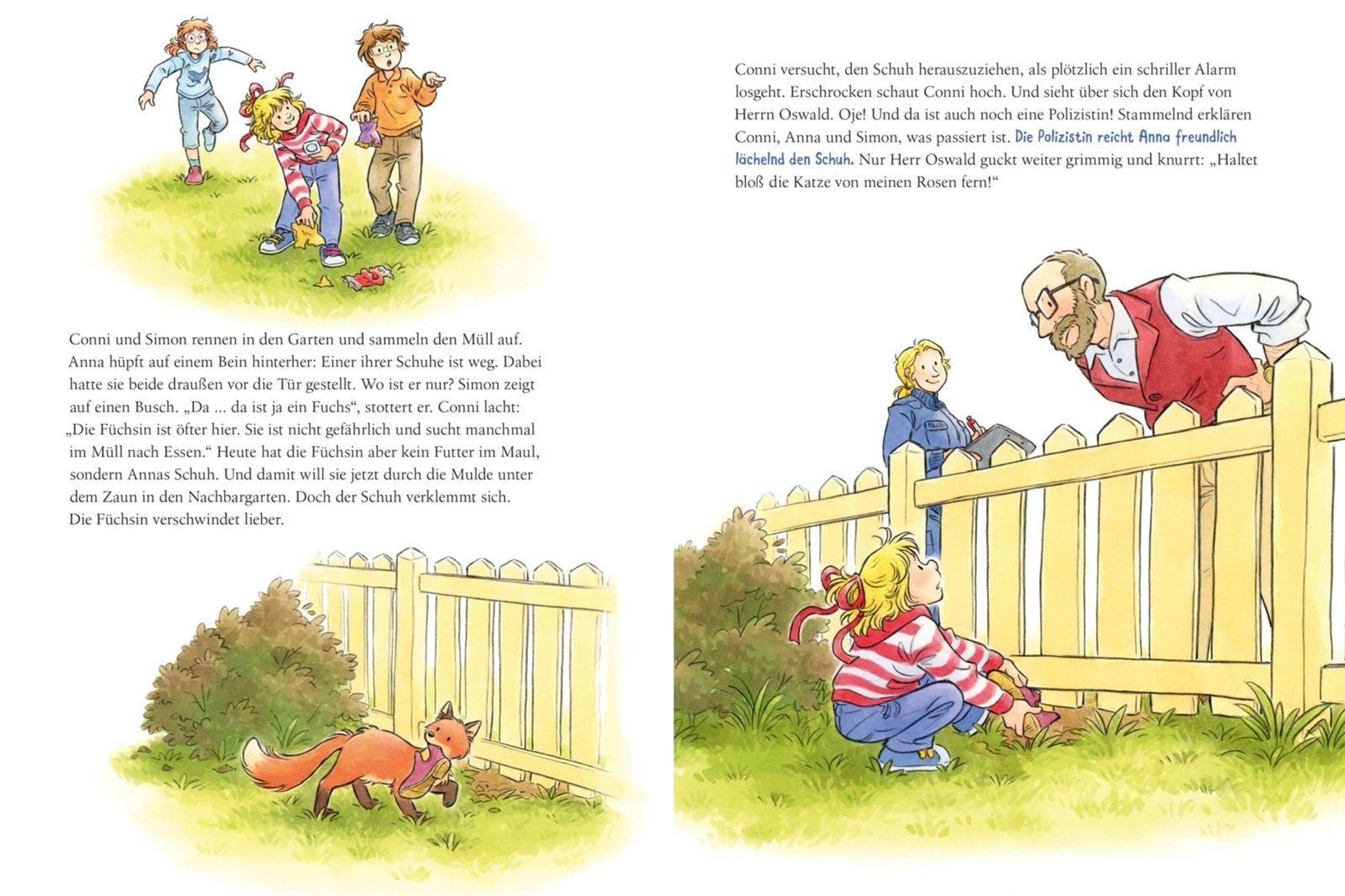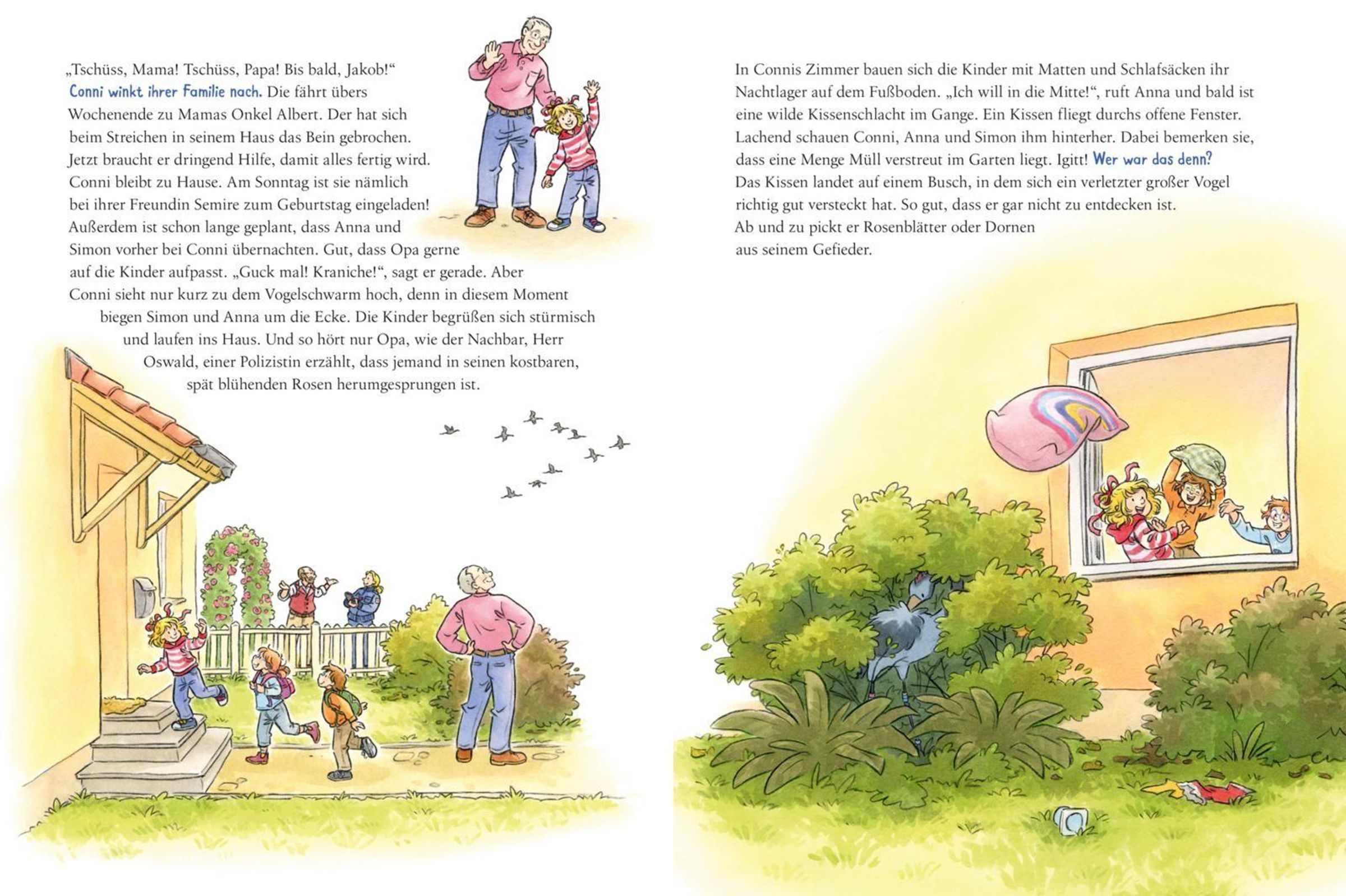 Conni, Simon und Anna erleben ein aufregendes Wochenende! Opa ist zum Aufpassen da, weil Connis Eltern mit Jakob verreist sind, und Anna und Simon dürfen bei Conni übernachten: mit Matratzenlager, Kissenschlacht und Spaghetti zum Abendessen ... Das allein ist ja schon toll genug! Aber es wird noch abenteuerlicher: Klaus, ein verletzter Kranich, stattet Conni und ihren Freund*innen in der Nacht einen Besuch ab! Conni, Anna und Simon suchen sich Hilfe bei einer Tierschützerin und einem Ornithologen. Sie dürfen den Kranich gesund pflegen, damit er mit seinem Schwarm in den Süden ziehen kann. Connis mürrischer Nachbar Herr Oswald allerdings ist darüber gar nicht glücklich ... Aus Sorge um seine Rosen vertreibt er Klaus! Die Kinder begeben sich natürlich sofort auf die Suche nach ihm. Und auch Herr Oswald sieht seinen Fehler ein und sorgt nach einer Entschuldigung mit berherztem Einsatz dafür, dass sich für Klaus alles zum Guten wendet.