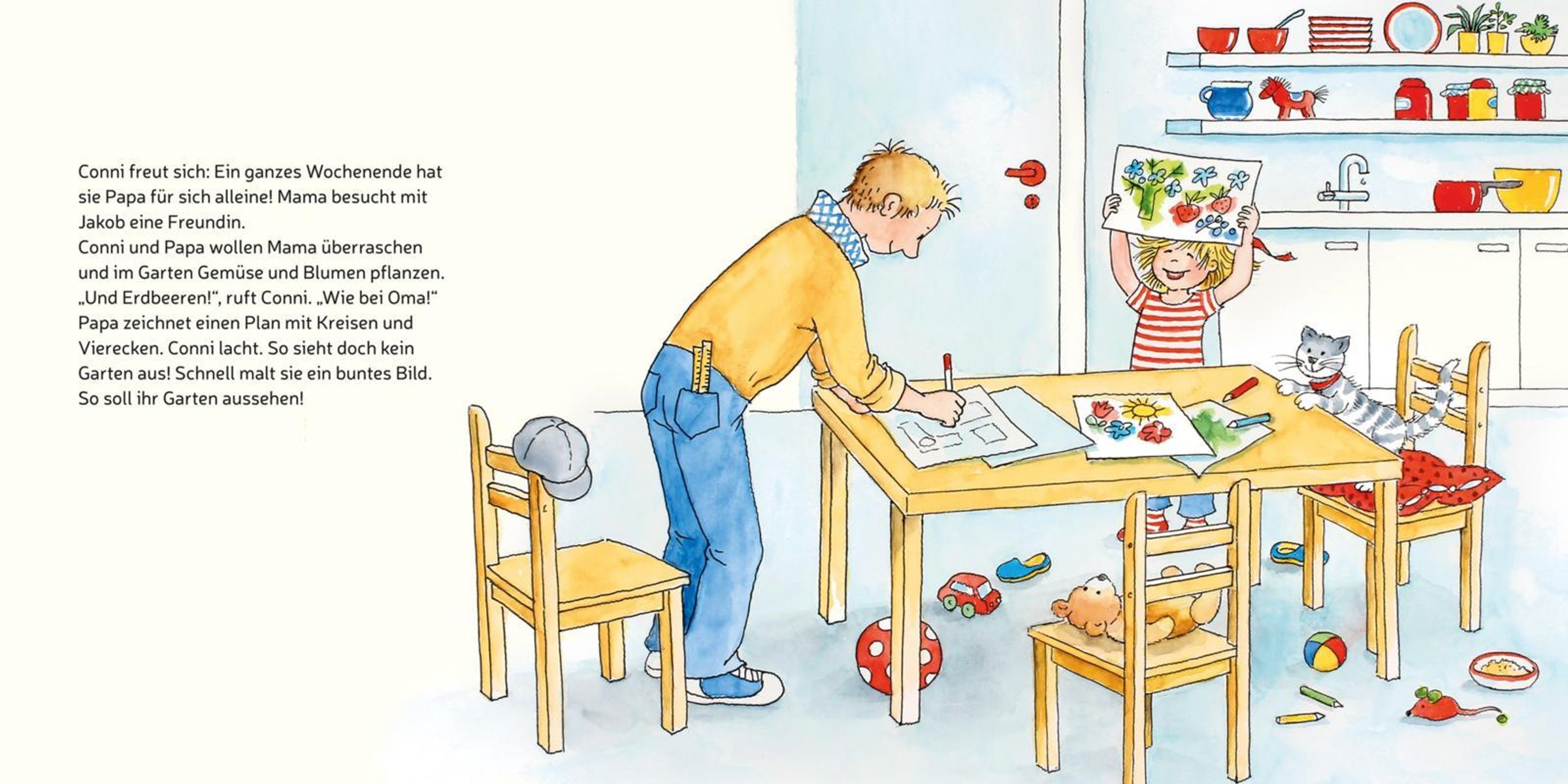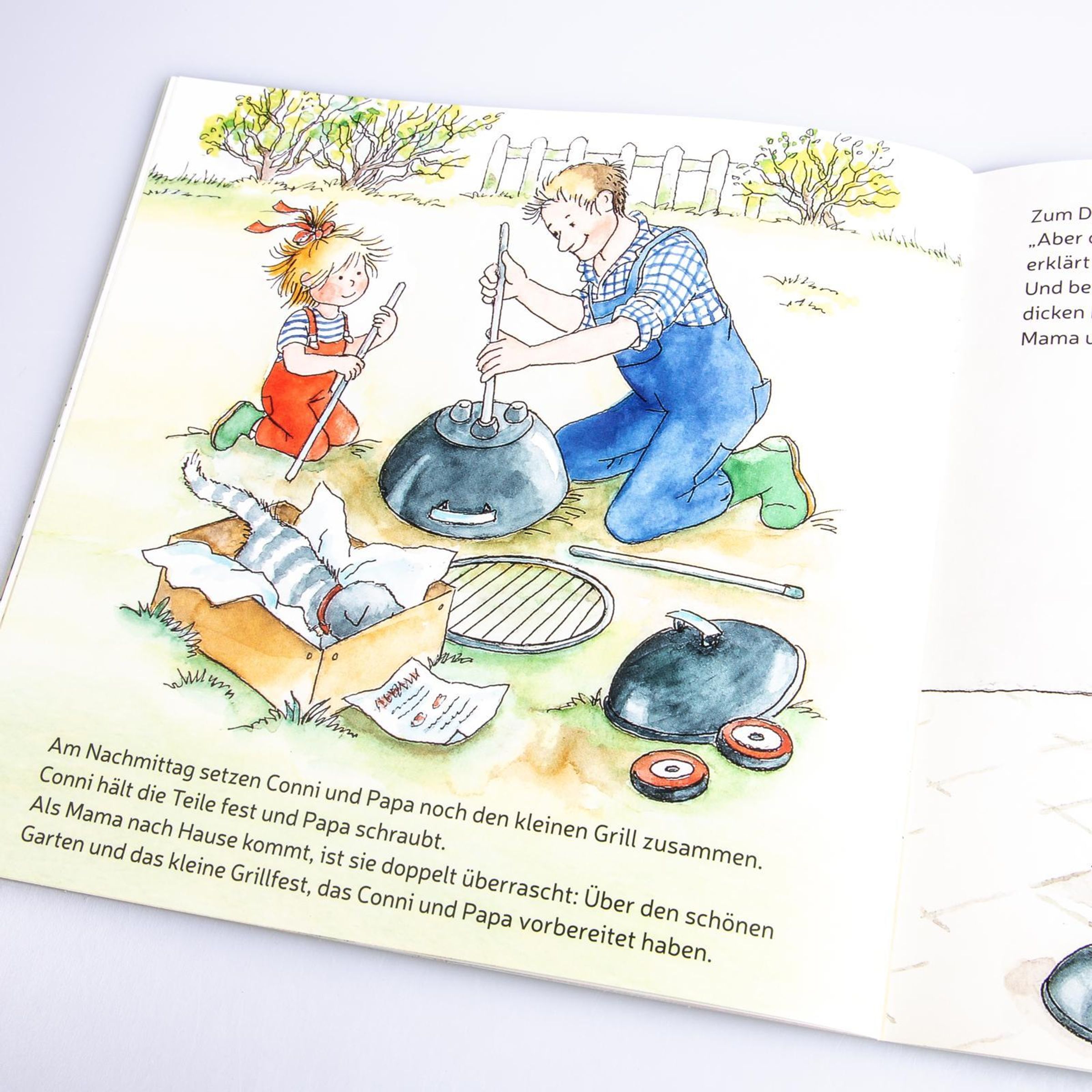 Wie gut, dass Papa Conni hat! Gemeinsam flicken sie ein Fahrrad, fahren in den Baumarkt und legen ein Beet im Garten neu an. Und als Mama und Jakob zurückkommen, wird gegrillt! Conni ist richtig stolz, dass sie Papa so gut helfen konnte. Und Papa freut sich, dass er eine so große Tochter hat.