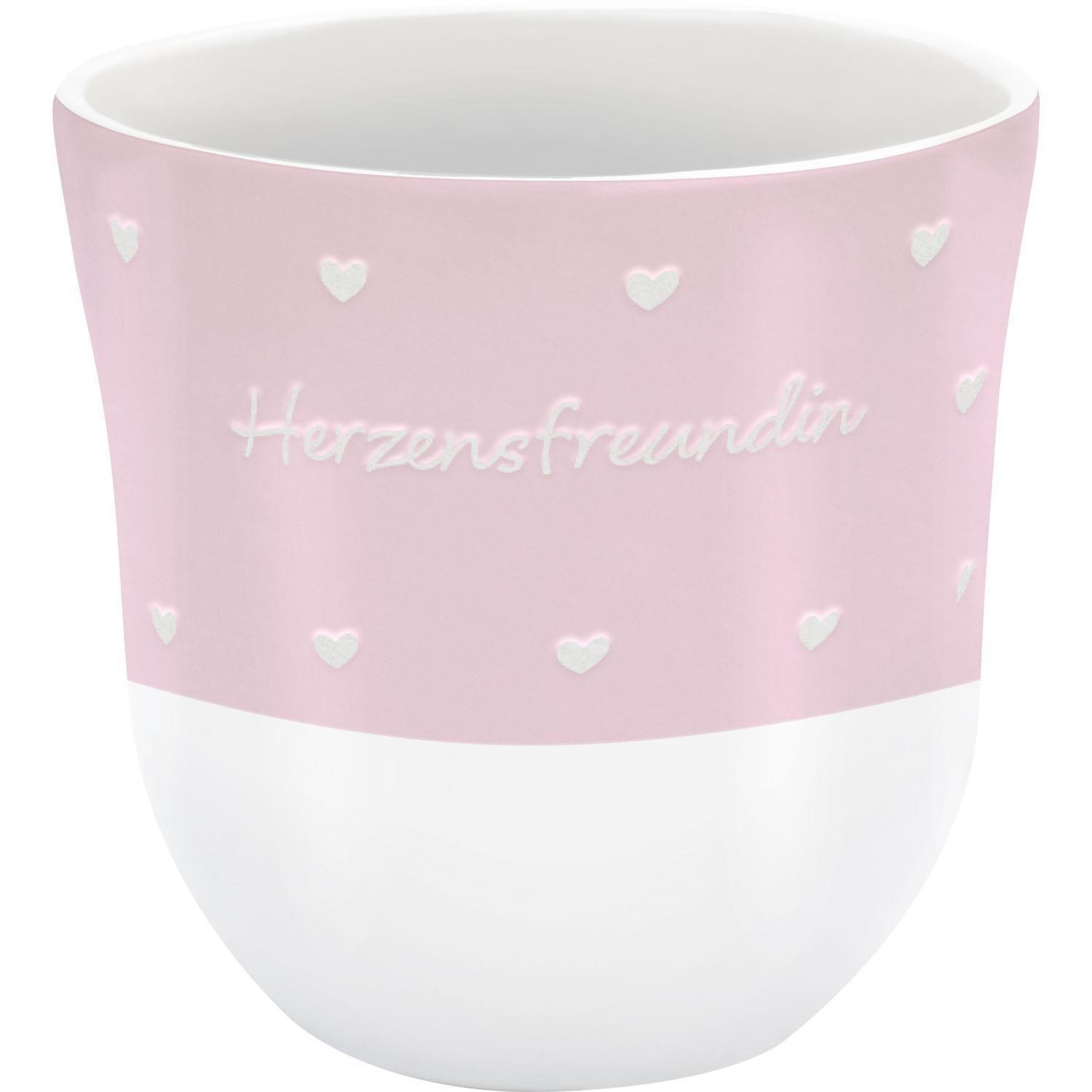 "Herzensfreundin" steht auf einem rosa-weißen Becher, umgeben von einer Verpackung mit weißen Herzen., Diverse