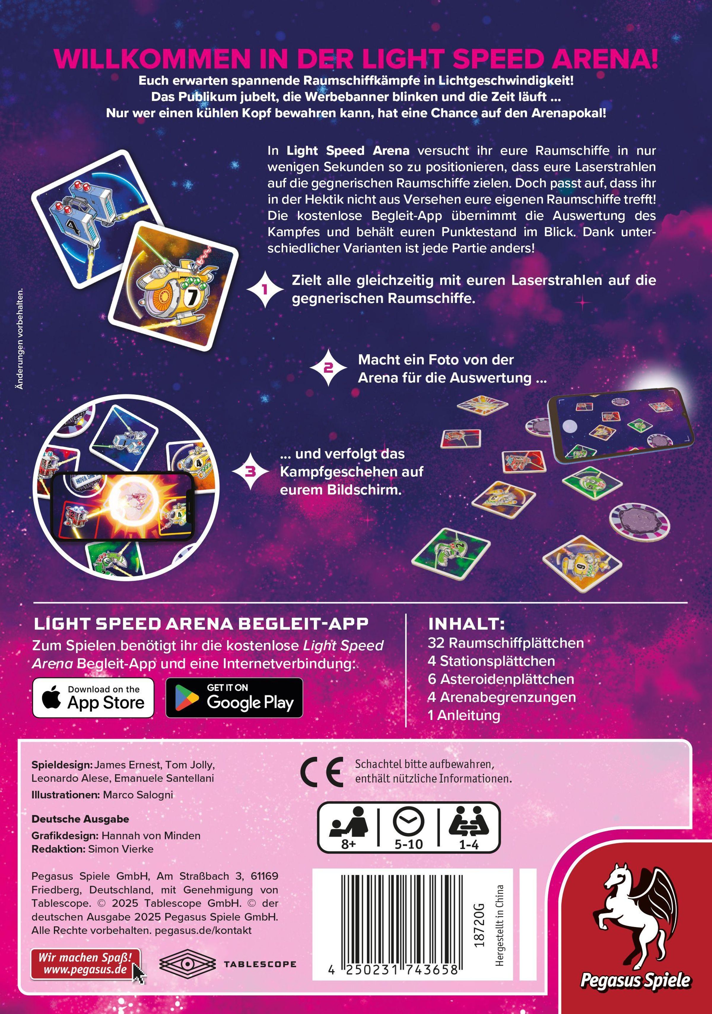 Light Speed Arena ist ein rasantes Weltraum-Kampfspiel, bei dem alle Spielenden gleichzeitig ihre Raumschiffe in einer chaotischen Arena platzieren und versuchen, mit Laserstrahlen gegnerische Schiffe oder Asteroiden zu treffen. Wer schafft es, genau zu zielen, Mineralien zu sammeln und am Ende die meisten Punkte zu ergattern? Mit der begleitenden App wird das Spielfeld nach jeder Partie einfach gescannt: Treffer, zerstörte Schiffe und gesammelte Ressourcen werden automatisch erkannt. Dank der Scan&Play-Mechanik wird das Ergebnis direkt auf dem Bildschirm gezeigt, sodass eine aufwändige Spielauswertung nicht nötig ist. Wer die meisten Punkte erzielt, beeindruckt das Publikum und wird als strahlende*r Sieger*in die Arena verlassen!