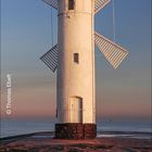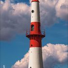 "LILLE EILAND 2027 LEUCHTTÜRME" oben, „Elektrischer Leuchtturm Borkum, erbaut 1890“ unten; roter, weißer Leuchtturm vor blauem Himmel, darunter eine Karte., Kalender