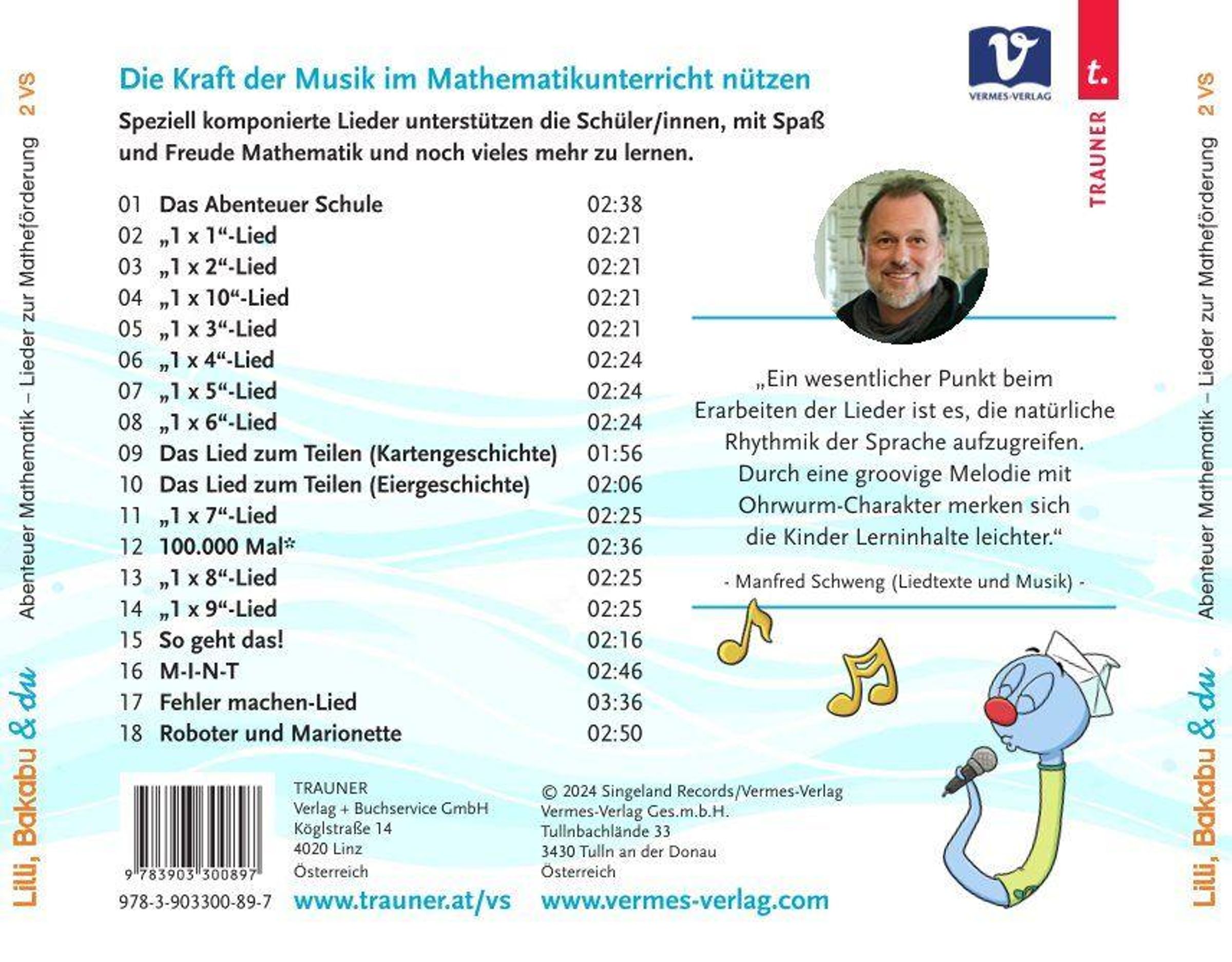 Musik und Bewegung sind bei "Lilli, Bakabu & du" die verlässlichen Partner auf dem Weg zum Lernerfolg. Der musikalische Ohrwurm Bakabu hilft, die Kraft der Musik für den Mathematikunterricht zu nützen. Die 18 speziell komponierten Lieder zur Matheförderung unterstützen Schüler: innen ab der 2. Klasse dabei, mit Spaß und Freude Rechnen und noch vieles mehr zu lernen. Die Bakabu-Songs von Manfred Schweng haben garantiert den Ohrwurm-Effekt, und gesungener Text bleibt länger und leichter im Gedächtnis. Durch die groovigen Melodien merken sich die Kinder Lerninhalte leichter. Ein wesentlicher Punkt beim Erarbeiten der Lieder ist es auch, die natürliche Rhythmik der Sprache aufzugreifen.