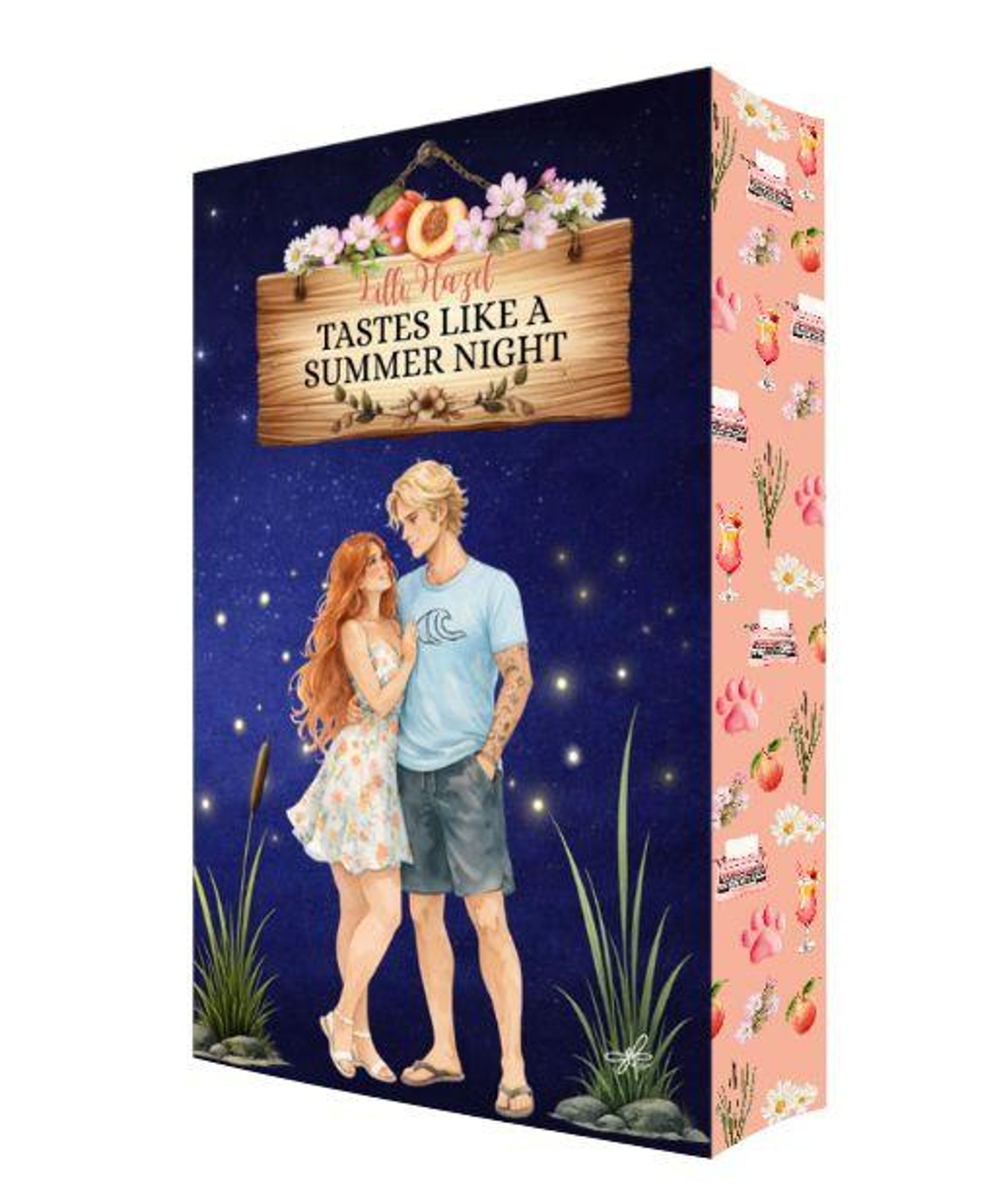 Ein Holzschild mit "Tastes Like a Summer Night", darunter ein Paar in Sommerkleidung vor einem sternenklaren Hintergrund., Buch