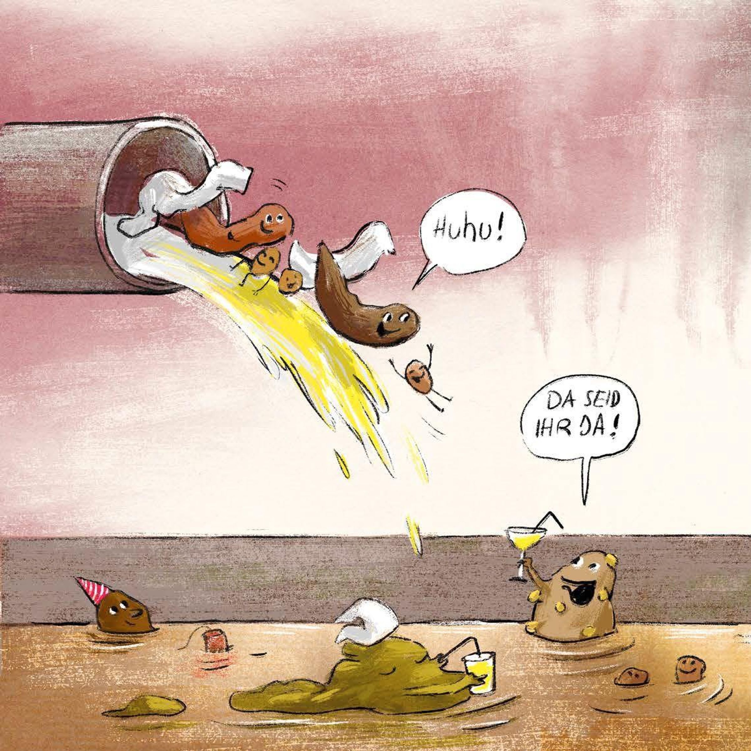 Erwachsene in ihrer Naivität meinen, so ein Klogang endete mit Abputzen, Spu¿le, Klosäubern und Händewaschen. In Wirklichkeit ist es aber viel spannender: Eine Kackwurst ist selten allein, in unserem Fall sind es drei kleine und zwei große - eine ganze Familie, und wenn sie hinuntergespu¿lt werden, stoßen sie unten im Kanal auf viele andere Kackwu¿rste. Was noch von der Klobu¿rste runtergeht, macht unsere Kackwu¿rste noch ein bisschen schicker, und wenn die Kackwurstparty im Kanal beginnt, kom- men noch die ganzen Seifenblasen vom Händewaschen dazu. Und klar ... damit die Kackwu¿rste ihren Spaß haben, mu¿ssen wir ordentlich Klo und Hände säubern.