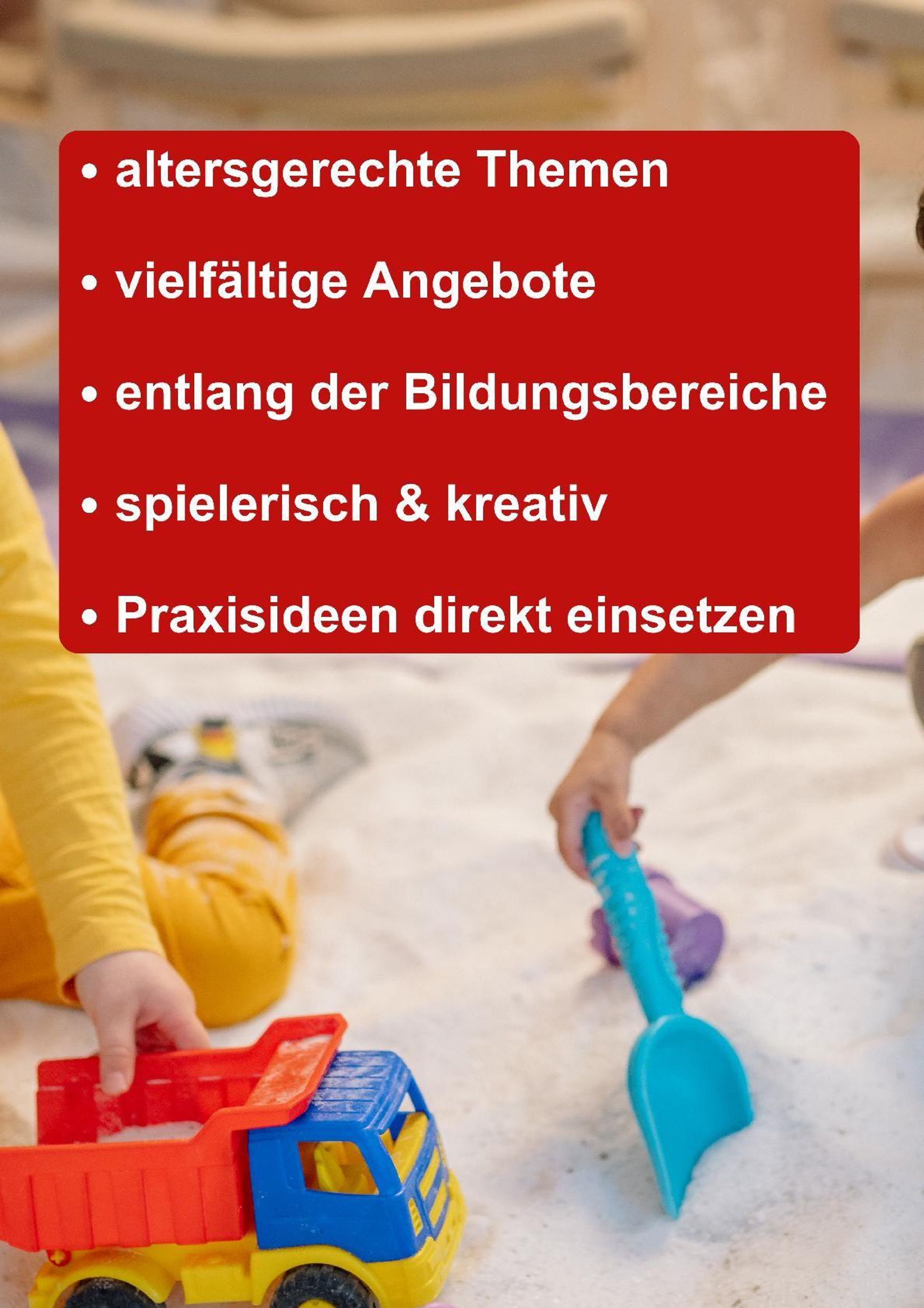 Spielerische Bewegungsangebote fördern zum Beispiel die motorischen und haptischen Fähigkeiten der Kinder. Andere Angebote regen die Kinder zum Sprechen und Singen an. Altersgerechte kreative Ideen zur ästhetischen Erziehung sowie zu weiteren Bildungsbereichen runden die Projektmappe ab.
