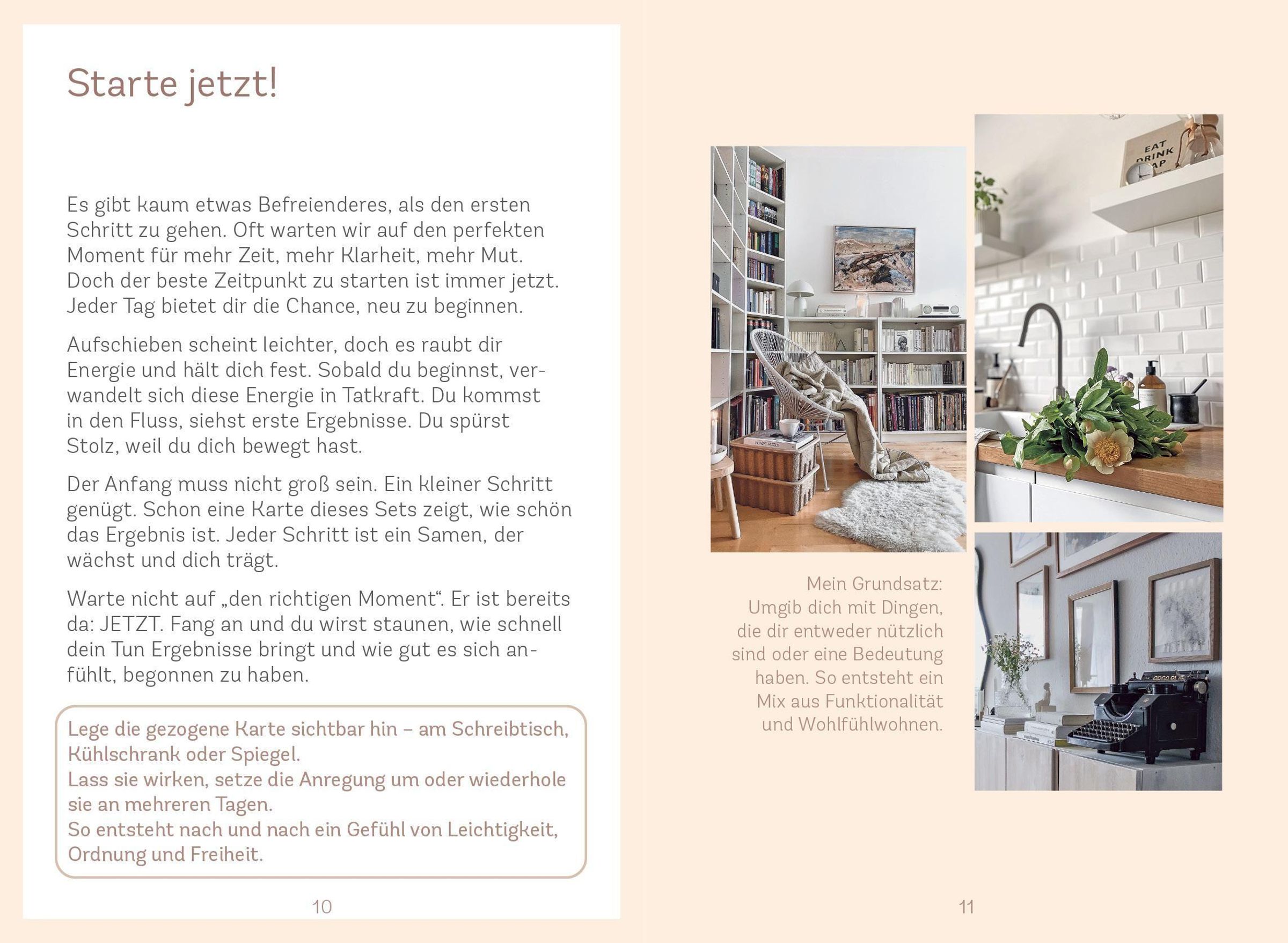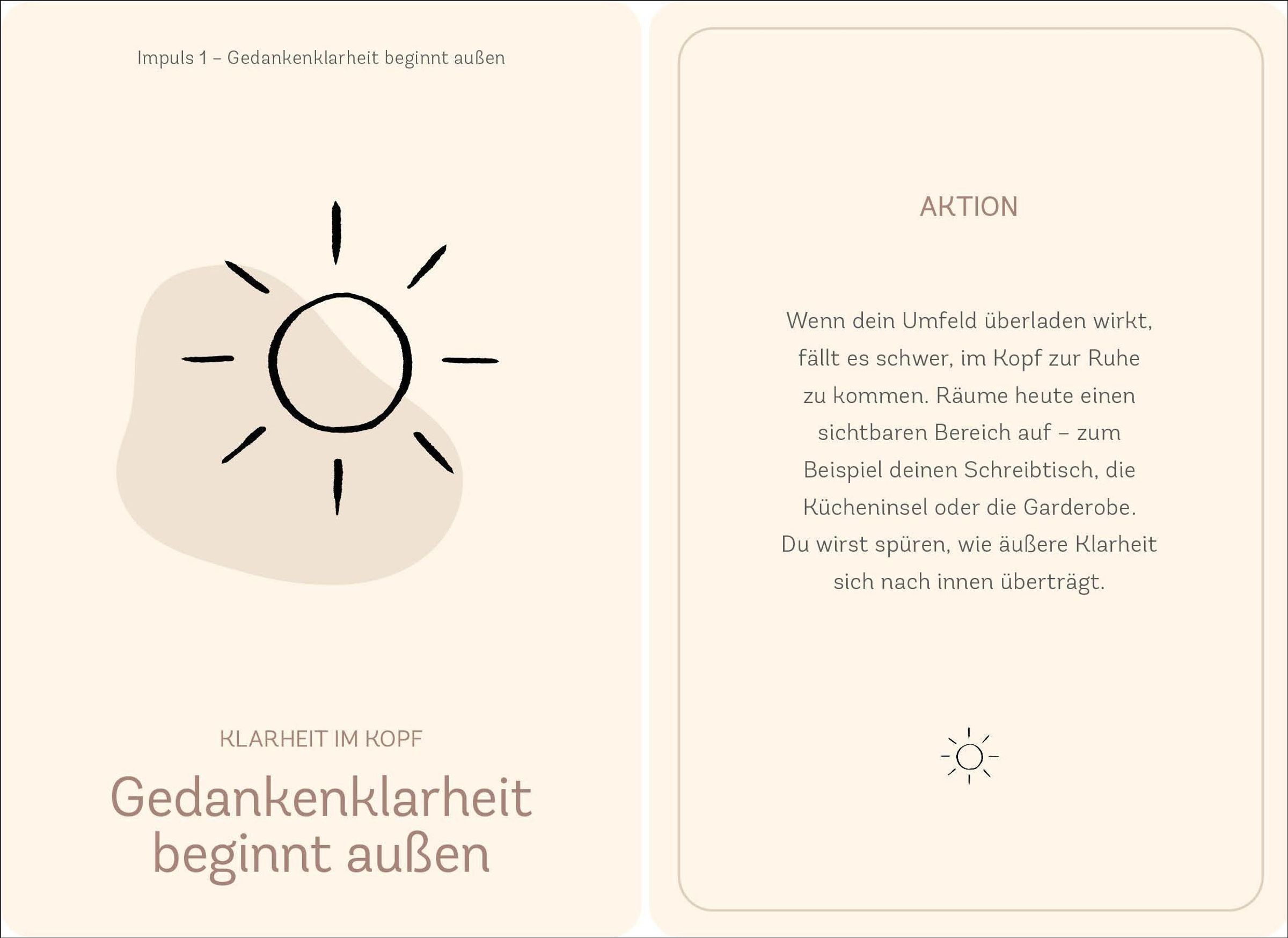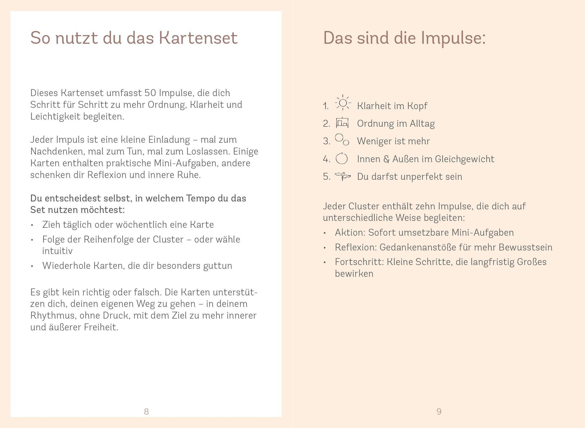 Das Ordnung-Kartenset inkl. Booklet begleitet Schritt für Schritt zu mehr Struktur und Klarheit im Alltag. Jede Karte liefert Impulse, kleine Aufgaben oder Denkanstöße, die dabei helfen, Ballast loszulassen, Räume bewusst zu gestalten und innere Ruhe zu finden. Ordnung wird hier nicht als starres Konzept verstanden, sondern als flexibler Begleiter für ein leichteres, freieres Leben - ganz ohne Perfektionsdruck.