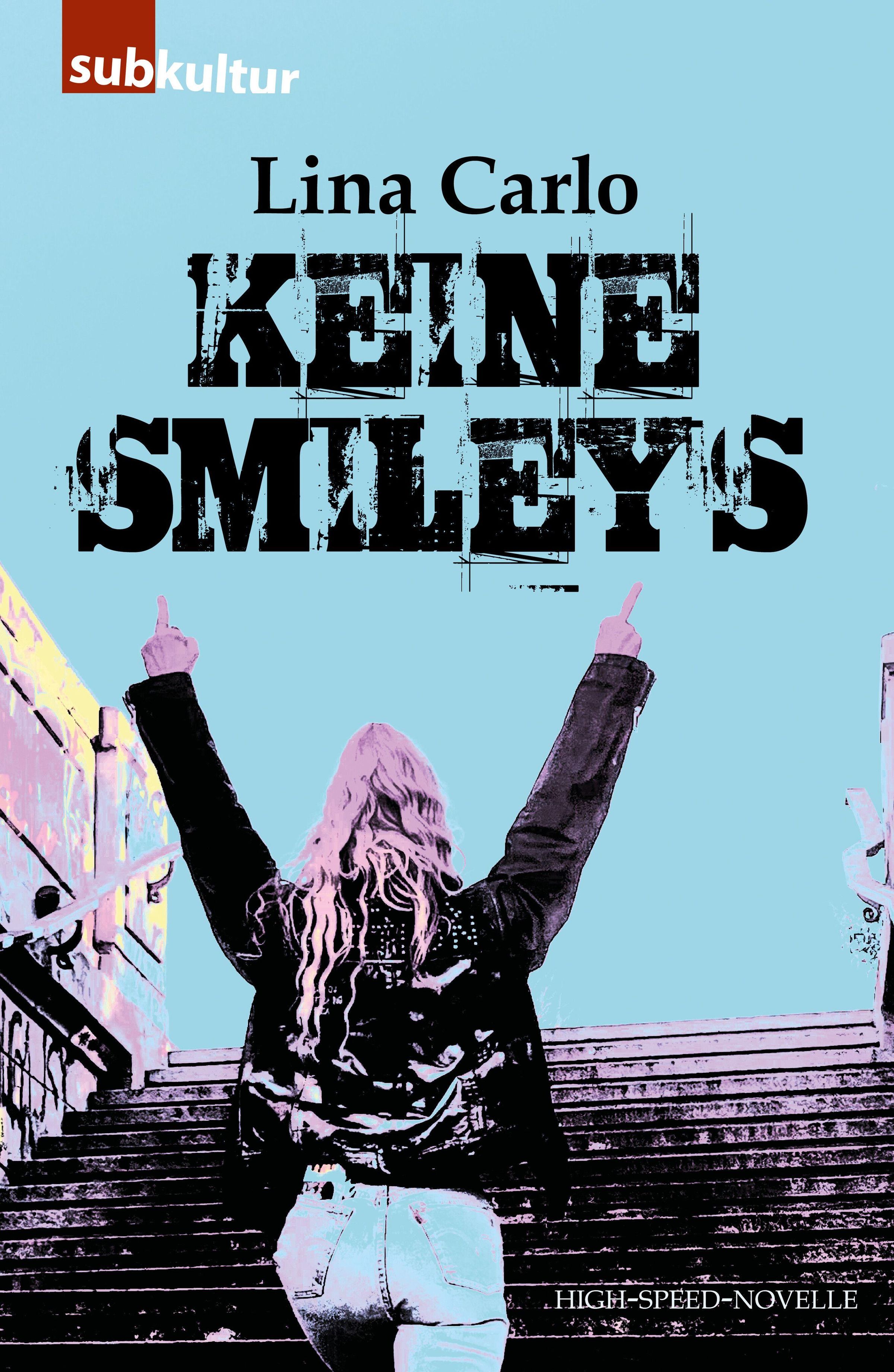 Text: "Lina Carlo, KEINE SMILEYS, HIGH-SPEED-NOVELLE, subkultur". Rückansicht einer Person auf Treppe, Arme hoch., Buch