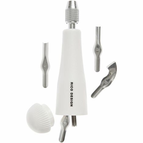 Das Linolschnittwerkzeug verfügt über einen handlichen Kunststoffgriff mit integrierter Aufbewahrung für die Klingen; ein Schraubverschluss fixiert die eingesetzte Klinge sicher. Zum Set gehören fünf Klingen für unterschiedliche Schnitte: Geißfuß, U-Form, Hohleisen 3 mm, Hohleisen 4 mm und Konturenmesser. Der Artikel ist für Rechts- und Linkshänder geeignet.