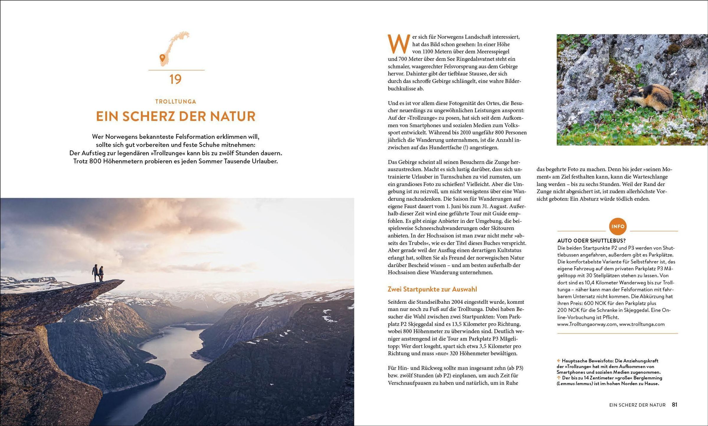 Dieser Reisebildband lässt Sie die unberührten, wilden und einzigartigen Naturorte des Landes kennenlernen und zeigt Ihnen unzählige Gründe Norwegen zu lieben. Beeindruckende Felsplattformen wie der Preikestolen oder die Trolltunga, raue Nationalparks wie der Dovrefjell, friedliche Fjorde und Bergebenen - all das und noch mehr finden Sie in Norwegen. Machen Sie eine Kajaktour durch den Lysefjord , gehen Sie surfen vor den Lofoten oder wandern Sie im Jotunheimen-Nationalpark . Norwegens wilde Seite hat unglaublich viel zu bieten!