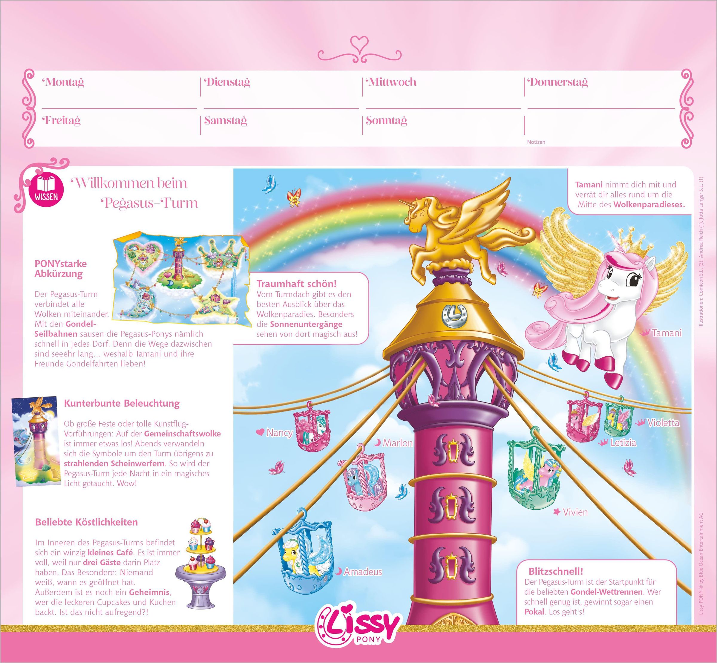 Text: „Lissy Pony Mein Kalender“, „Schuljahresbegleitender Wochenkalender“, „zum Basteln, Rätseln und vielem mehr“. Illustration: Bunte Ponys vor einem Regenbogen mit Flügeln und Kronen., Kalender