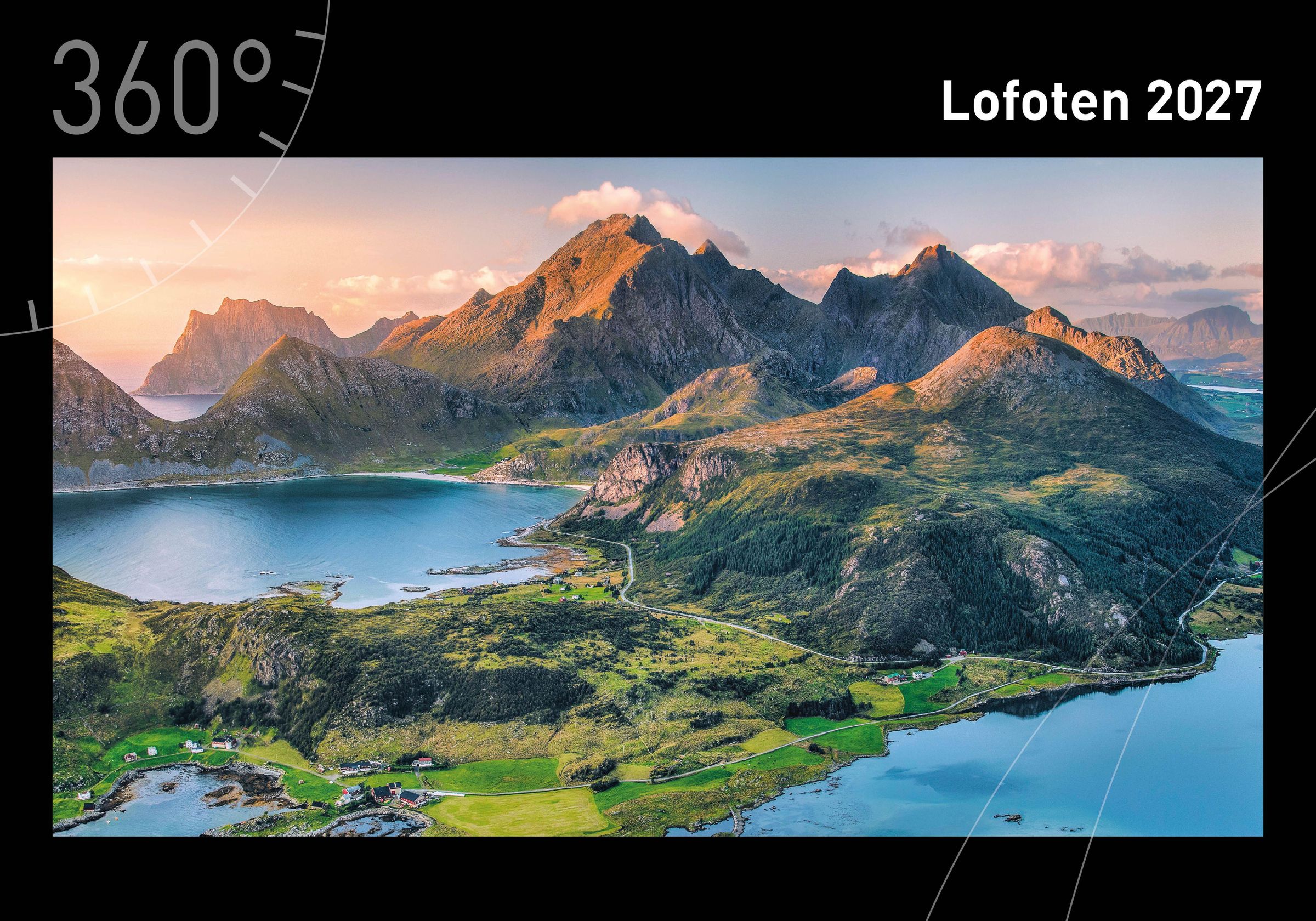 "Lofoten 2027" und "360°" stehen auf einem Foto von Bergen und Seen bei Sonnenuntergang, umgeben von einer schwarzen Umrandung., Kalender