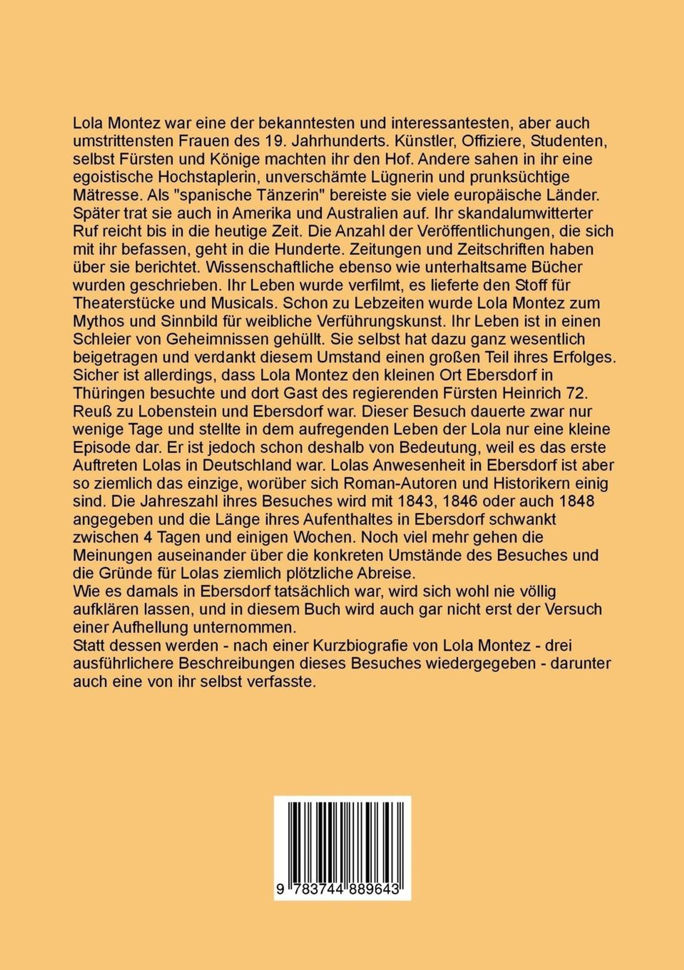 Lola Montez war eine der bekanntesten und interessantesten, aber auch umstrittensten Frauen des 19. Jahrhunderts. Künstler, Offiziere, Studenten, selbst Fürsten und Könige machten ihr den Hof. Andere sahen in ihr eine egoistische Hochstaplerin, unverschämte Lügnerin und prunksüchtige Mätresse. Als "spanische Tänzerin" bereiste sie viele europäische Länder. Später trat sie auch in Amerika und Australien auf. Ihr skandalumwitterter Ruf reicht bis in die heutige Zeit. Die Anzahl der Veröffentlichungen, die sich mit ihr befassen, geht in die Hunderte. Zeitungen und Zeitschriften haben über sie berichtet. Wissenschaftliche ebenso wie unterhaltsame Bücher wurden geschrieben. Ihr Leben wurde verfilmt, es lieferte den Stoff für Theaterstücke und Musicals. Schon zu Lebzeiten wurde Lola Montez zum Mythos und Sinnbild für weibliche Verführungskunst. Ihr Leben ist in einen Schleier von Geheimnissen gehüllt. Sie selbst hat dazu ganz wesentlich beigetragen und verdankt diesem Umstand einen großen Teil ihres Erfolges. Sicher ist allerdings, dass Lola Montez den kleinen Ort Ebersdorf in Thüringen besuchte und dort Gast des regierenden Fürsten Heinrich 72. Reuß zu Lobenstein und Ebersdorf war. Dieser Besuch dauerte zwar nur wenige Tage und stellte in dem aufregenden Leben der Lola nur eine kleine Episode dar. Er ist jedoch schon deshalb von Bedeutung, weil es das erste Auftreten Lolas in Deutschland war. Lolas Anwesenheit in Ebersdorf ist aber so ziemlich das einzige, worüber sich Roman-Autoren und Historikern einig sind. Die Jahreszahl ihres Besuches wird mit 1843, 1846 oder auch 1848 angegeben und die Länge ihres Aufenthaltes in Ebersdorf schwankt zwischen 4 Tagen und einigen Wochen. Noch viel mehr gehen die Meinungen auseinander über die konkreten Umstände des Besuches und die Gründe für Lolas ziemlich plötzliche Abreise. Wie es damals in Ebersdorf tatsächlich war, wird sich wohl nie völlig aufklären lassen, und in diesem Buch wird auch gar nicht erst der Versuch einer Aufhellung unternommen. Statt dessen werden - nach einer Kurzbiografie von Lola Montez - drei ausführlichere Beschreibungen dieses Besuches wiedergegeben - darunter auch eine von ihr selbst verfasste.