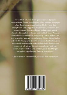 Menschlich ist... sich trotz gemeinsamer Sprache unverstanden fühlen. Anerkennen, dass jemand entgegen allen Bemühungen gleichgültig bleibt - und das akzeptieren und weggehen. Einsam sein, weil man mit seinen eigenen Schritten bisher unbetretene Wege erforscht. Sich selbst verlieren und im Blick eines Anderen wiederfinden. Das Gefühl, nie genug Zeit zu haben und sich beim älter werden zuzuschauen. Wahre Liebe finden und voll Hoffnung und Zweifel erwidern. Feststellen, dass man immer wieder fällt und Frieden damit finden. Das Leben mit all seinen Kämpfen annehmen und Mut fassen. Sich verlieben und erleben, dass das Morgen nach dem ewig langen Gestern jetzt da ist.