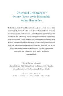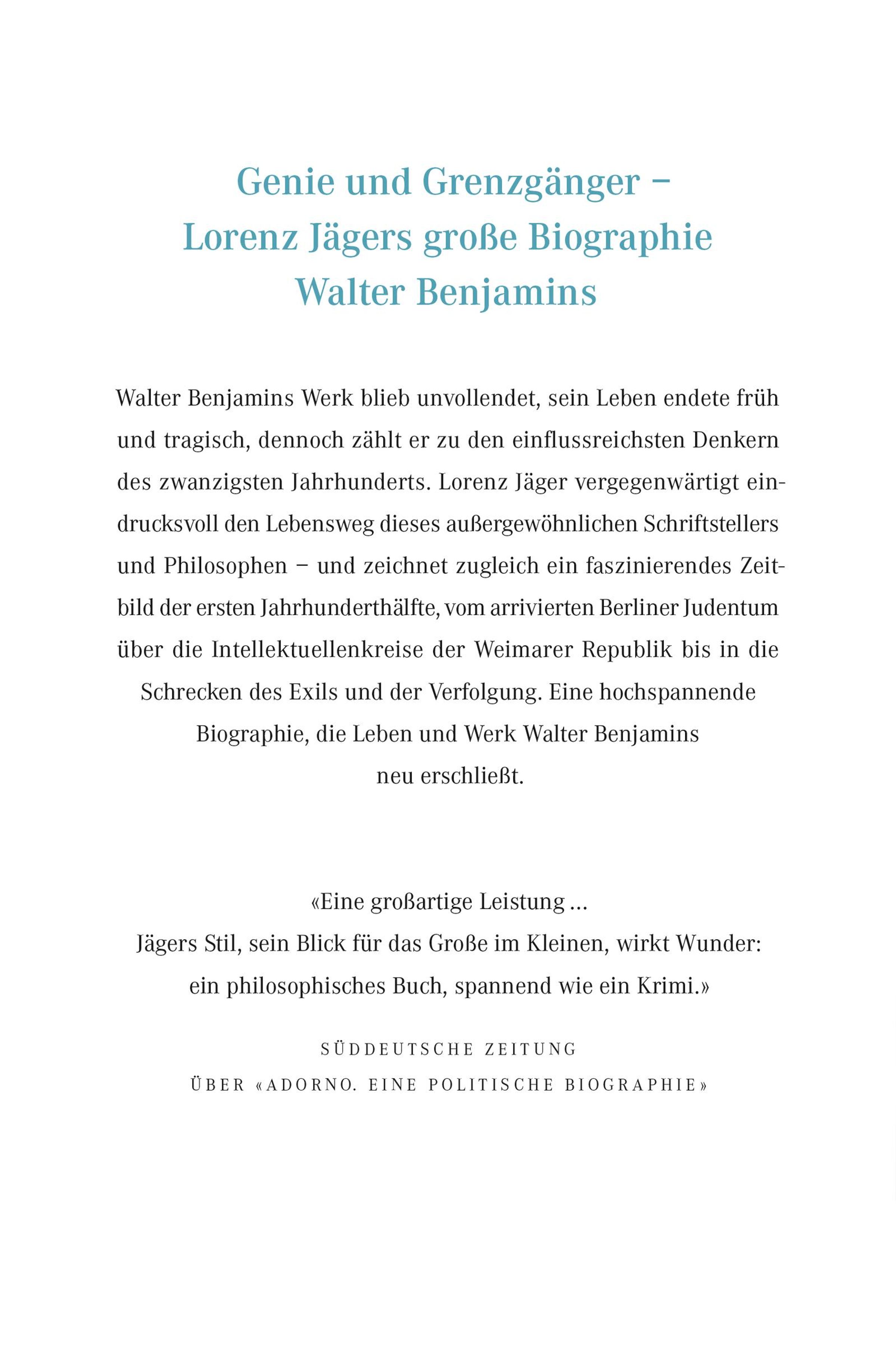 Walter Benjamin wollte in keine Schublade oder philosophische Schule passen, sein Werk blieb unvollendet - und doch zählt er zu den einflussreichsten Denkern des 20. Jahrhunderts, Intellektuelle wie Adorno und Kracauer bewunderten ihn als Genie. Lorenz Jäger erzählt das Leben des außergewöhnlichen Literaten: Er schildert Benjamins Kindheit in der Familie eines jüdischen Kunsthändlers, die Studienjahre in Freiburg und Berlin, wo die so anregende Freundschaft mit Gershom Scholem begann, die wechselhafte Beziehung zur Frankfurter Schule. Benjamin reiste nach Moskau, wo er sich vorsichtig der kommunistischen Bewegung näherte; im Pariser Exil diskutierte er mit Hannah Arendt und arbeitete am großen <<Passagen-Werk>>, das Fragment blieb. 1940 floh er vor der Gefahr, nach Deutschland ausgeliefert zu werden, in das spanische Portbou, wo er sich das Leben nahm - ein Ende, rätselhaft wie vieles in Benjamins Leben und Schreiben.