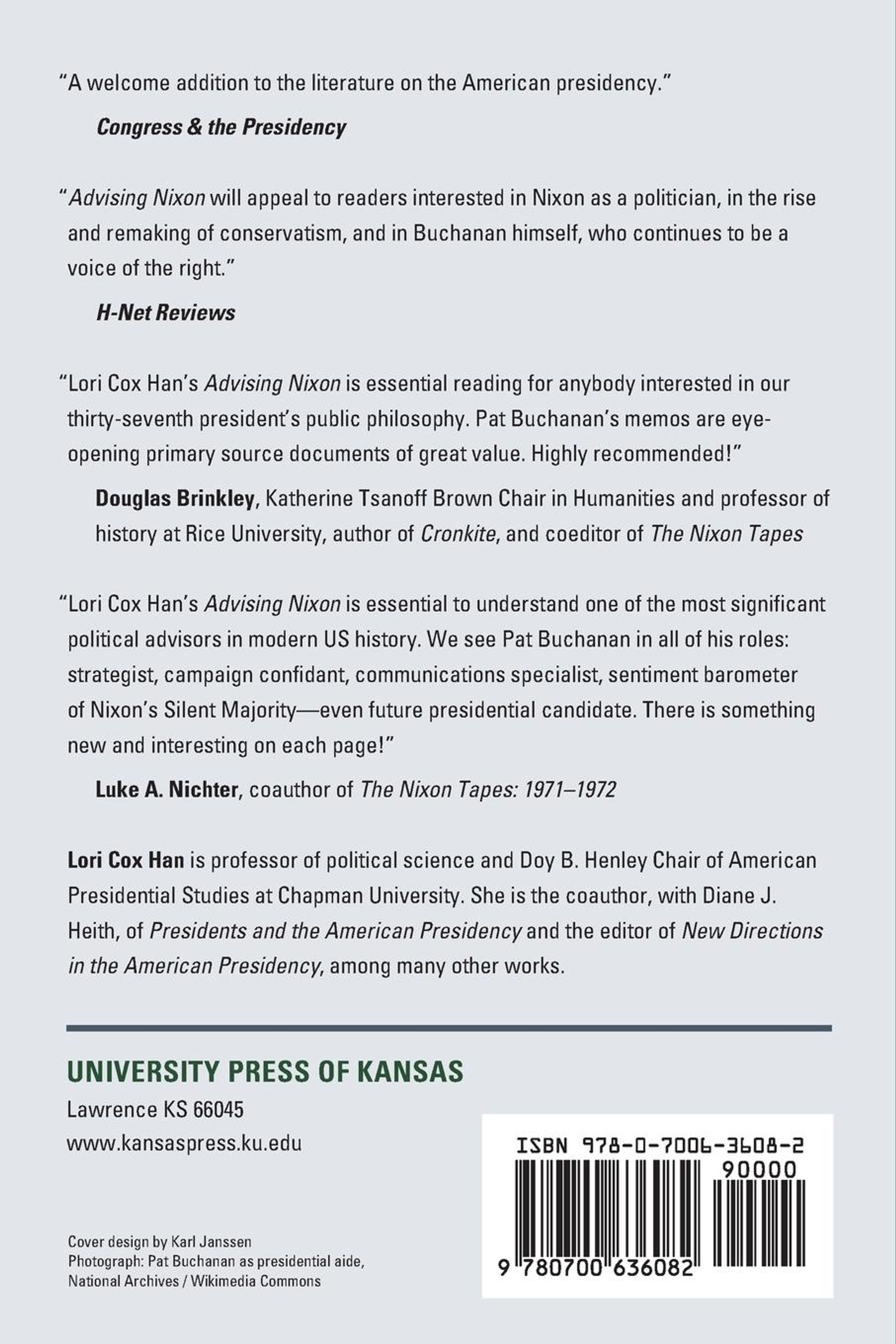In 1966 Richard Nixon hired Patrick J. Buchanan, a young editorial writer at the St. Louis Globe-Democrat, to help lay the groundwork for his presidential campaign. Fiercely conservative and a whiz at messaging and media strategy, Buchanan continued with Nixon through his tenure in office, becoming one of the president's most important and trusted advisors, particularly on public matters. The copious memos he produced over this period, counseling the president on press relations, policy positions, and political strategy, provide a remarkable behind-the-scenes look into the workings of the Nixon White House--and a uniquely informed perspective on the development and deployment of ideas and practices that would forever change presidential conduct and US politics. Of the thousand housed at the Richard Nixon Presidential Library, presidential scholar Lori Cox Han has judiciously selected 135 of Buchanan's memos that best exemplify the significant nature and reach of his influence in the Nixon administration. Here, in his now-familiar take-no-prisoners style, Buchanan can be seen advancing his deeply conservative agenda, counterpunching against advisors he considered too moderate, and effectively guiding the president and his administration through a changing, often hostile political environment. On every point of policy and political issue--foreign and domestic--through two successful campaigns, Nixon's first term, and the fraught months surrounding the Watergate debacle, Buchanan presses his advantage, all the while honing the message that would push conservatism ever rightward in the following years. Expertly edited and annotated by Han, Advising Nixon: The White House Memos of Patrick J. Buchanan offers rare insight into the decision-making and maneuvering of some of the most powerful figures in government--with lasting consequences for American public life.