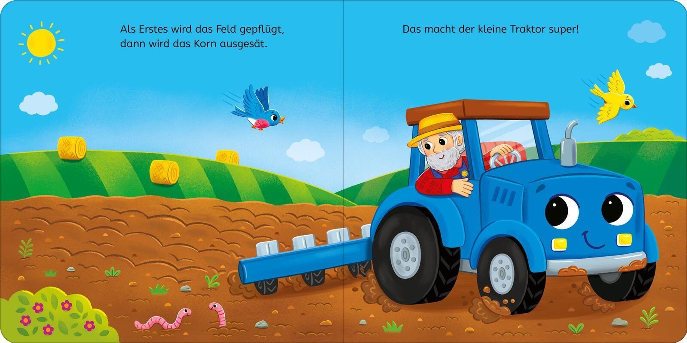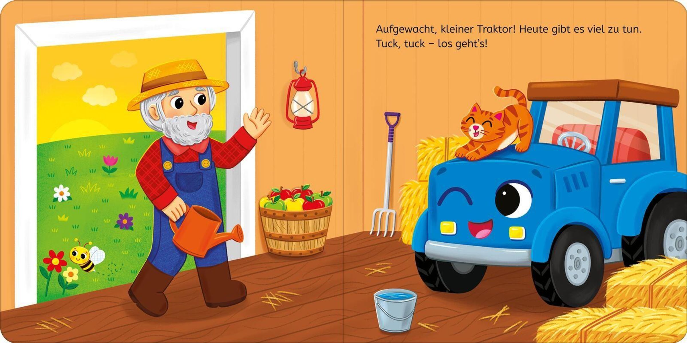 Nanu, wer ist denn da so früh aufgewacht? Es ist der kleine Traktor, der sich gleich mit dem Bauern an die Arbeit macht. Das Feld muss gepflügt werden und das Pferd möchte vom Tierarzt abgeholt werden. Nach dem langen Tag hat der Traktor seiner Freundin Katze viel zu erzählen.