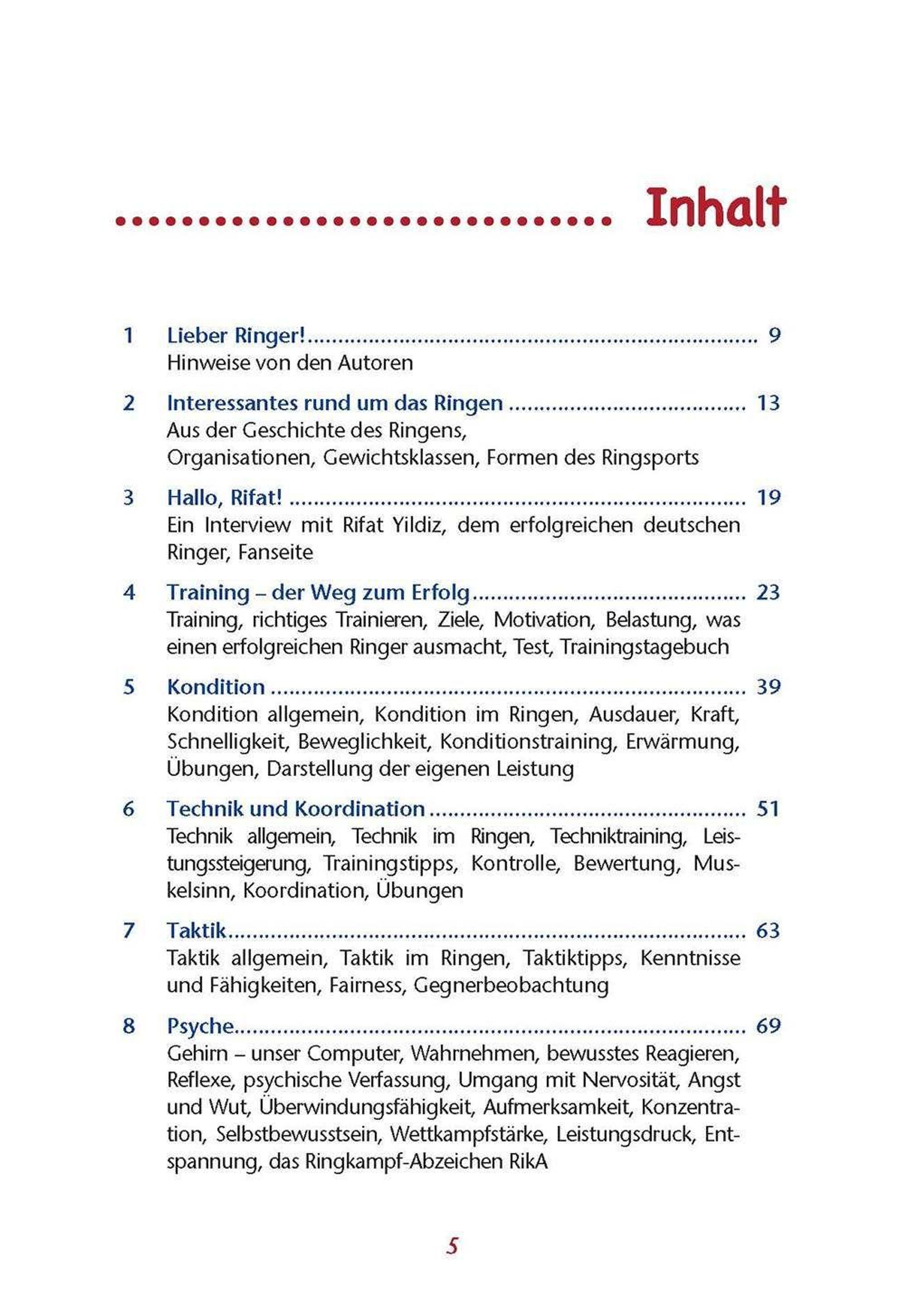 Hier erfährst du auch, warum Ausdauer, Kraft, Beweglichkeit und Schnelligkeit so wichtig sind, wie du deine konditionellen Fähigkeiten verbessern und deine Leistungsentwicklung dokumentieren kannst. Sicher interessierst du dich auch dafür, wie du im Kampf taktisch klug vorgehst und mit Wettkampfdruck fertig wirst. Dazu kommt viel Interessantes rund um den Ringkampfsport sowie Tipps für eine gesunde Ernährung und zur Wettkampfvorbereitung