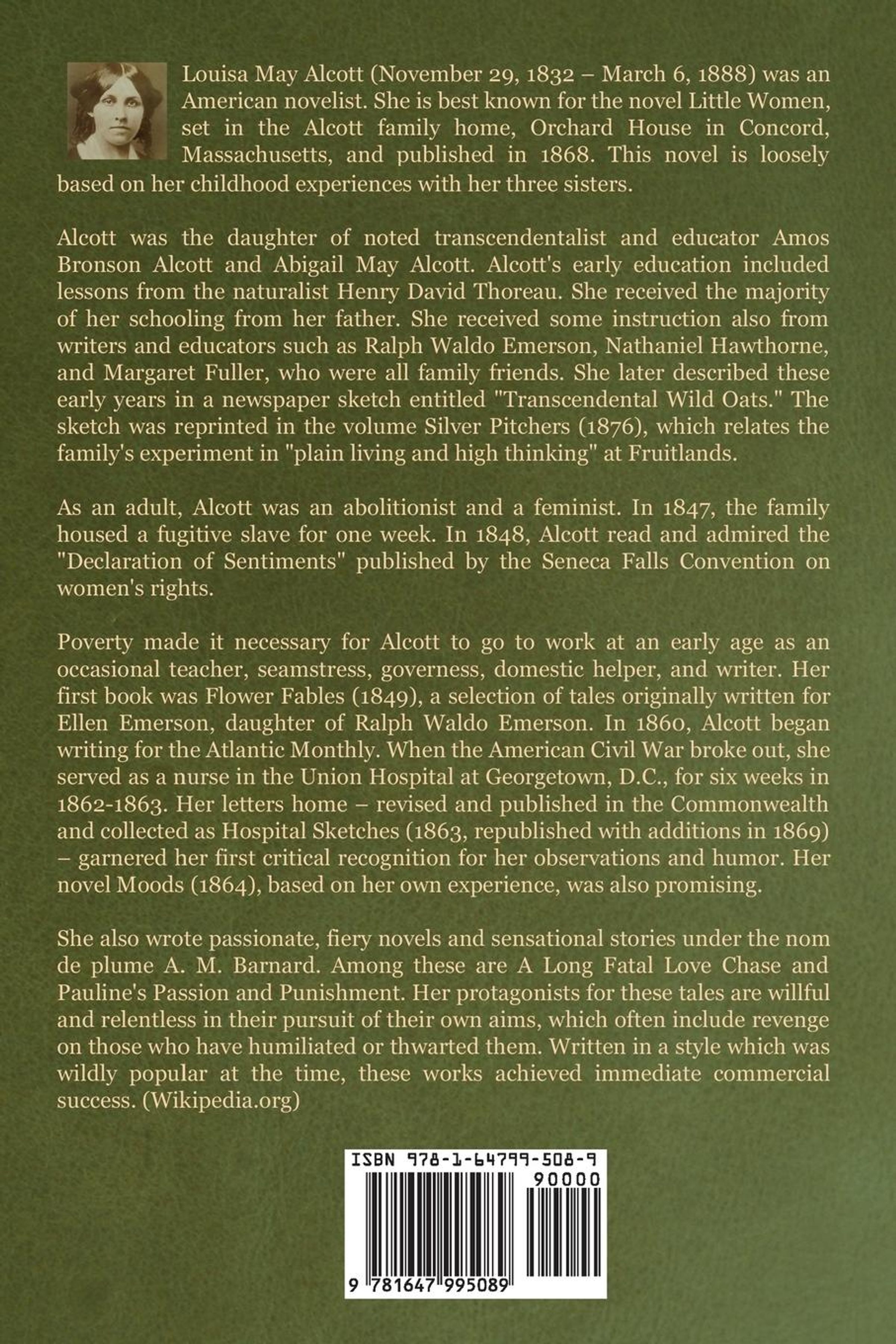 Louisa May Alcott (November 29, 1832 - March 6, 1888) was an American novelist. She is best known for the novel Little Women, set in the Alcott family home, Orchard House in Concord, Massachusetts, and published in 1868. This novel is loosely based on her childhood experiences with her three sisters. Alcott was the daughter of noted transcendentalist and educator Amos Bronson Alcott and Abigail May Alcott. Alcott's early education included lessons from the naturalist Henry David Thoreau. She received the majority of her schooling from her father. She received some instruction also from writers and educators such as Ralph Waldo Emerson, Nathaniel Hawthorne, and Margaret Fuller, who were all family friends. She later described these early years in a newspaper sketch entitled "Transcendental Wild Oats." The sketch was reprinted in the volume Silver Pitchers (1876), which relates the family's experiment in "plain living and high thinking" at Fruitlands. As an adult, Alcott was an abolitionist and a feminist. In 1847, the family housed a fugitive slave for one week. In 1848, Alcott read and admired the "Declaration of Sentiments" published by the Seneca Falls Convention on women's rights. Poverty made it necessary for Alcott to go to work at an early age as an occasional teacher, seamstress, governess, domestic helper, and writer. Her first book was Flower Fables (1849), a selection of tales originally written for Ellen Emerson, daughter of Ralph Waldo Emerson. In 1860, Alcott began writing for the Atlantic Monthly. When the American Civil War broke out, she served as a nurse in the Union Hospital at Georgetown, D. C., for six weeks in 1862-1863. Her letters home - revised and published in the Commonwealth and collected as Hospital Sketches (1863, republished with additions in 1869) - garnered her first critical recognition for her observations and humor. Her novel Moods (1864), based on her own experience, was also promising. She also wrote passionate, fiery novels and sensational stories under the nom de plume A. M. Barnard. Among these are A Long Fatal Love Chase and Pauline's Passion and Punishment. Her protagonists for these tales are willful and relentless in their pursuit of their own aims, which often include revenge on those who have humiliated or thwarted them. Written in a style which was wildly popular at the time, these works achieved immediate commercial success. (Wikipedia. org)