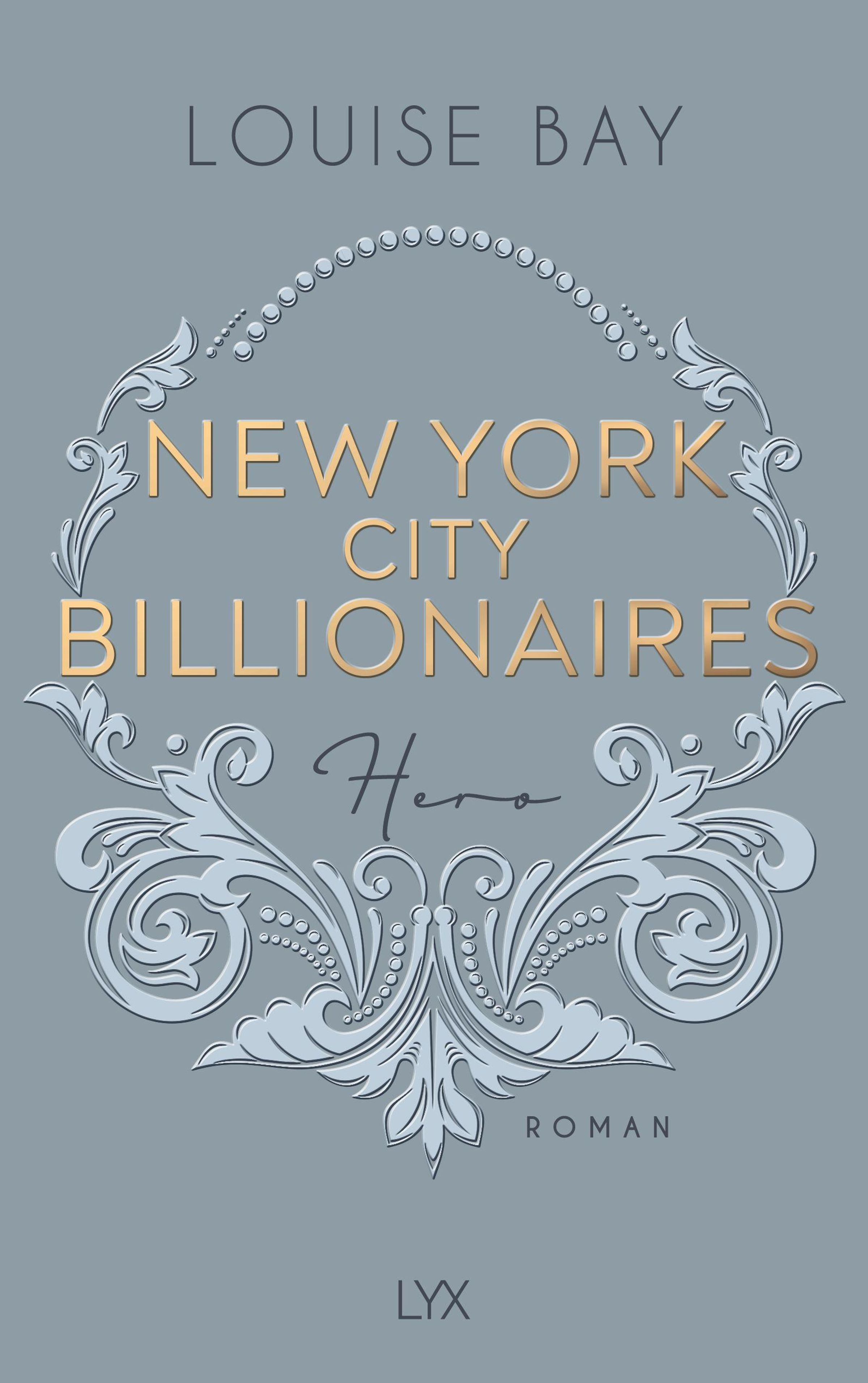 LOUISE BAY, NEW YORK CITY BILLIONAIRES, Hero, ROMAN, LYX. Verschnörkeltes, elegantes Muster in Blau und Gold., Buch
