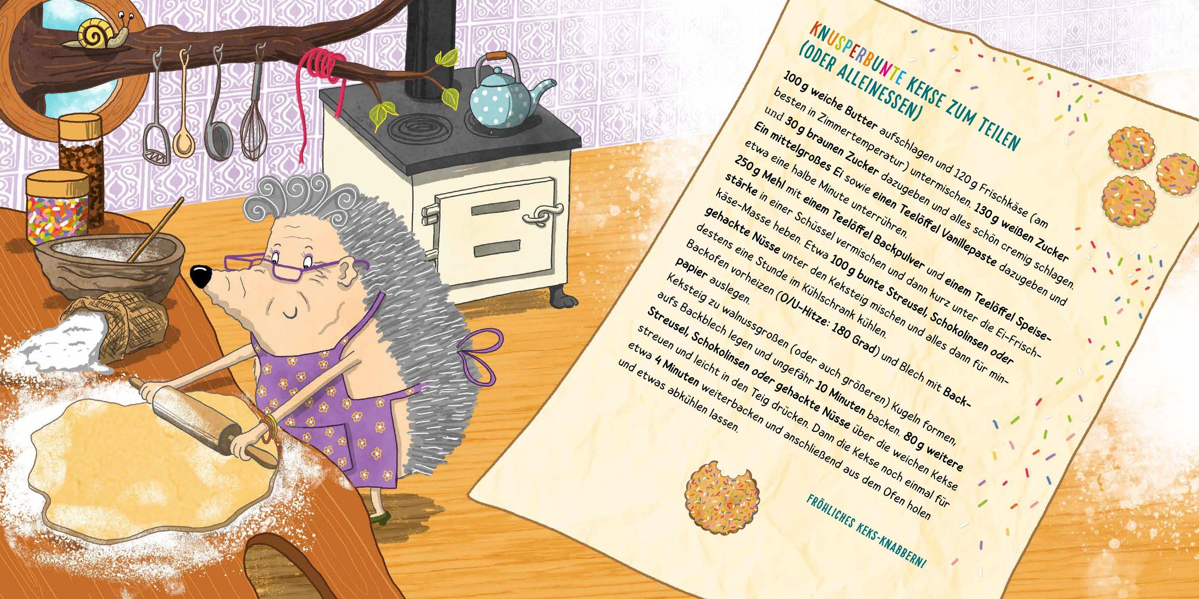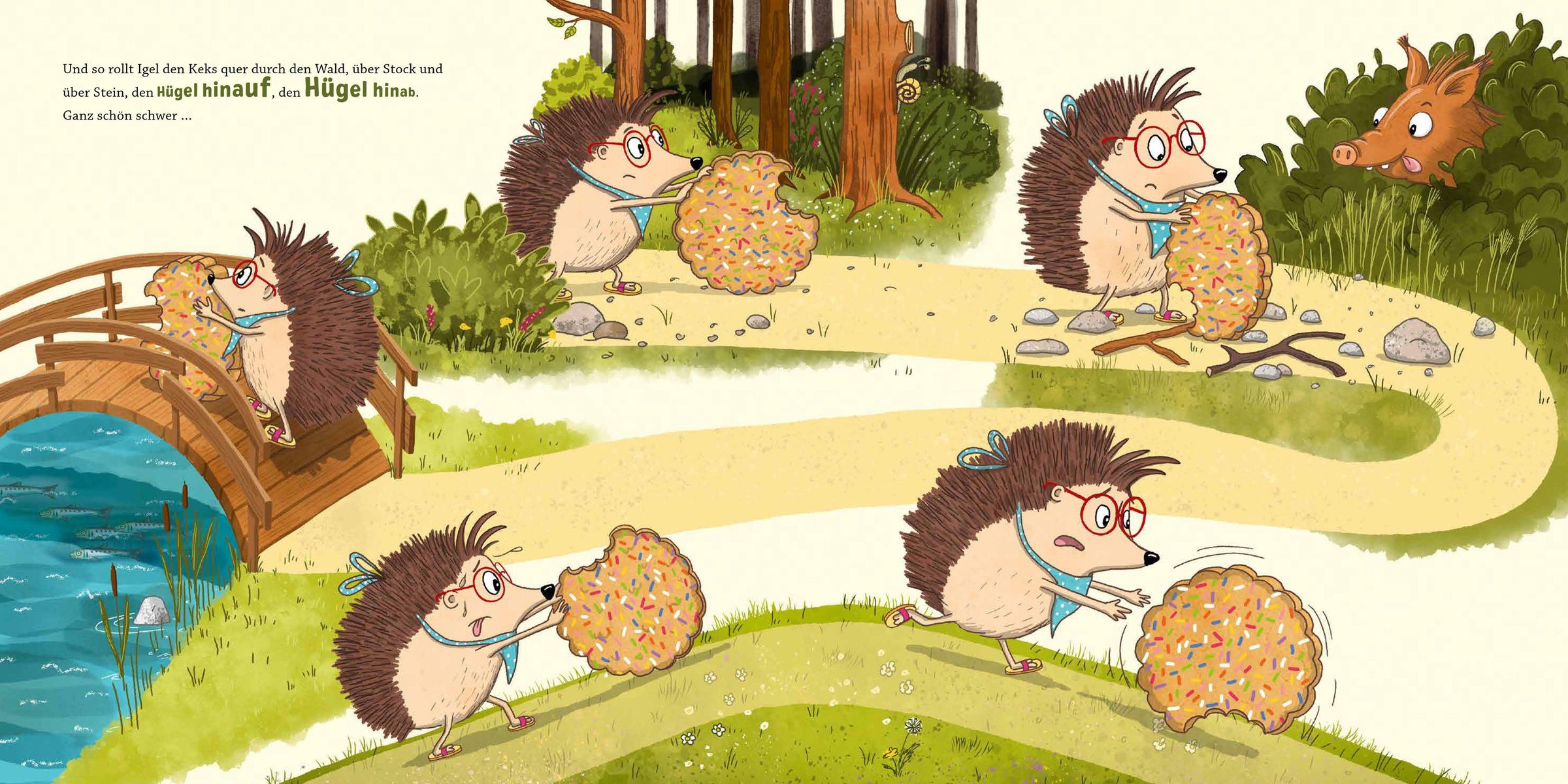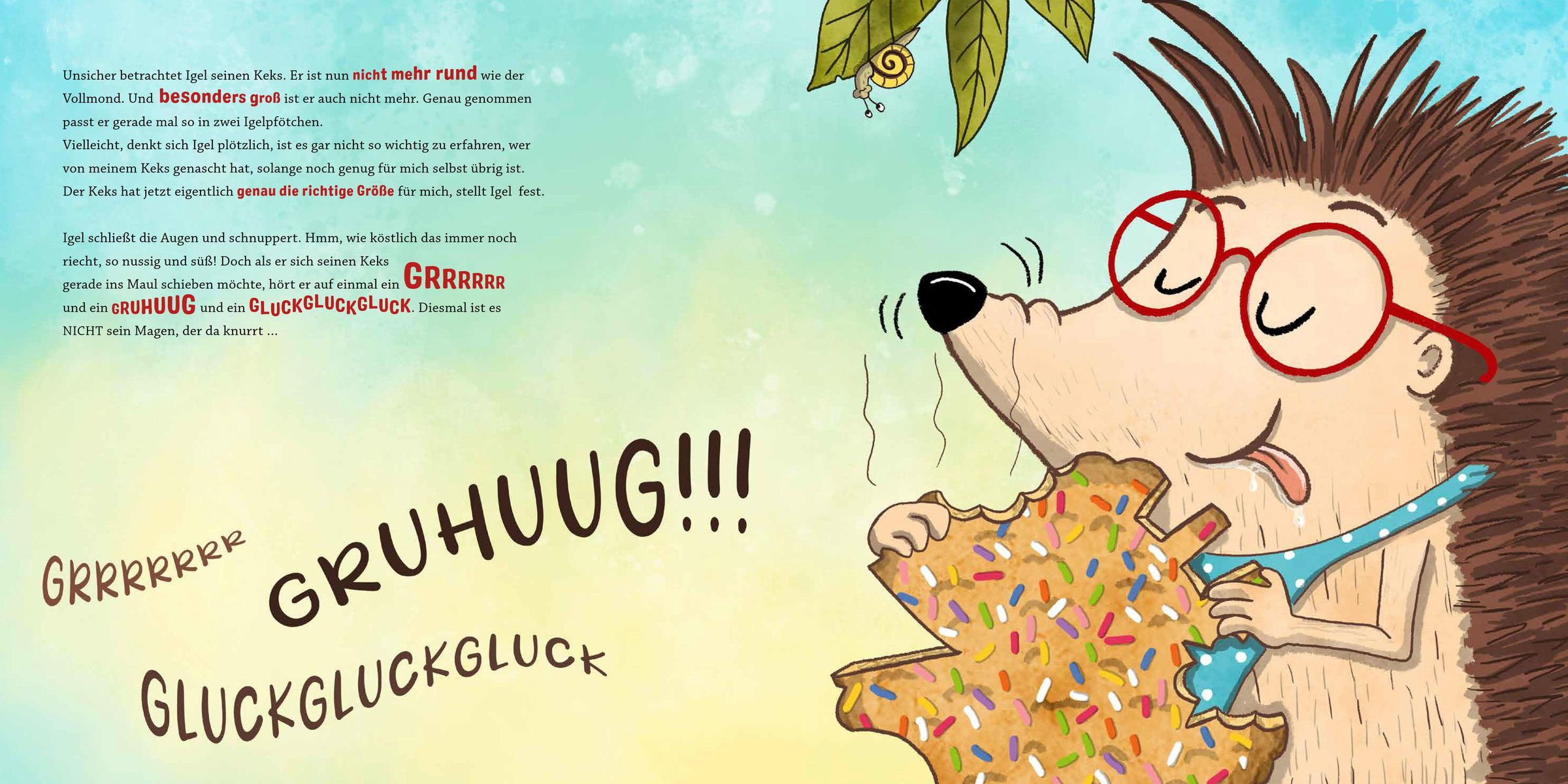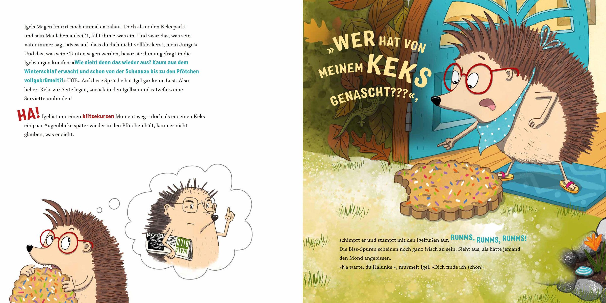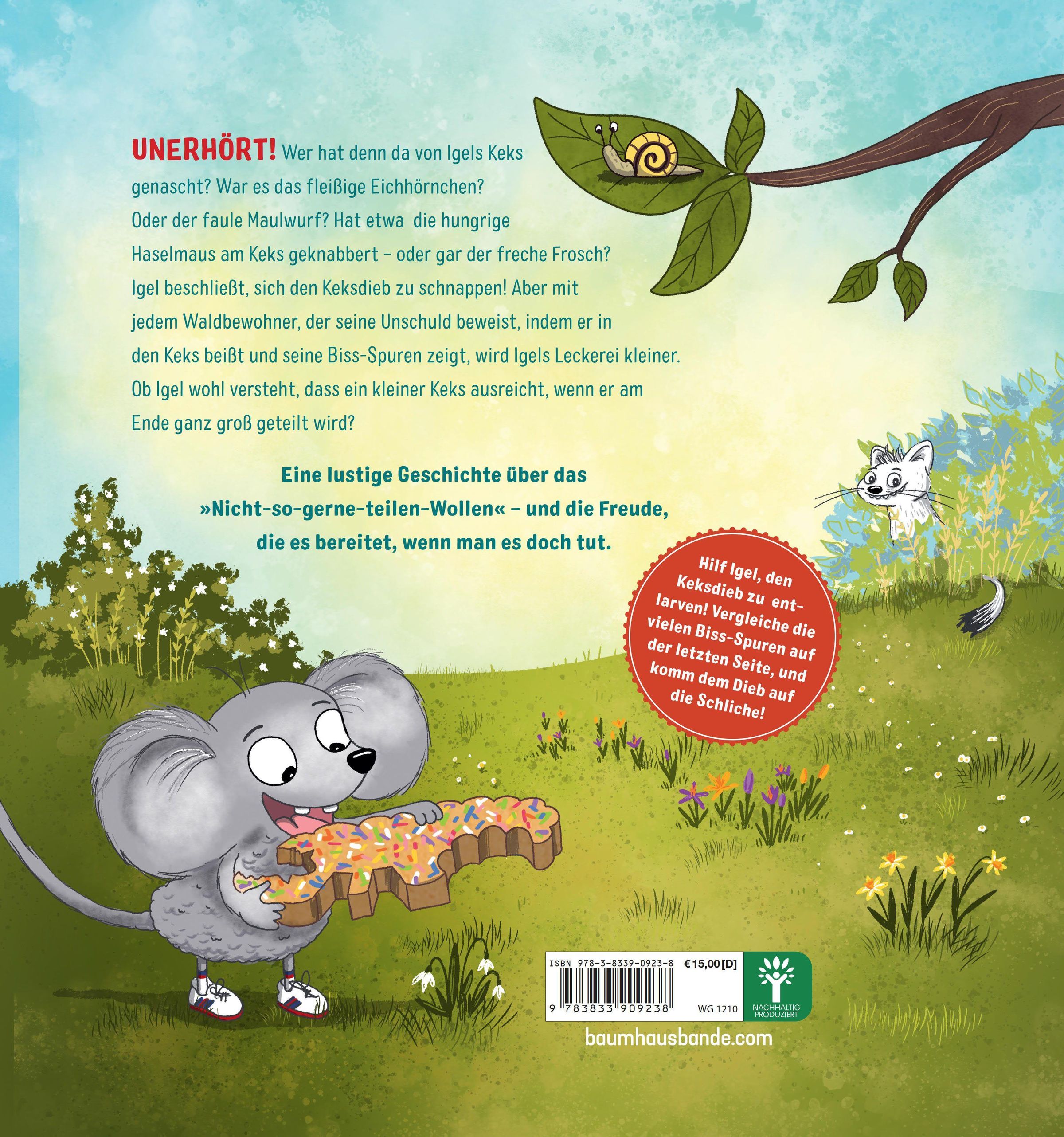Igel traut seinen Augen kaum: Da liegt der leckerste Keks der Welt, direkt vor seiner Haustür. Heute muss sein Glückstag sein! Doch als er kurz in seinem Bau verschwindet, nascht doch tatsächlich jemand von seiner Leckerei - unerhört! Die Bissspuren sind deutlich zu erkennen, und Igel beschließt, sich den Keksdieb zu schnappen! Aber mit jedem Waldbewohner, der seine Unschuld beweisen will, indem er in den Keks beißt und seine Bissspuren zeigt, wird Igels Keks kleiner. Ob er wohl versteht, dass ein kleiner Keks ausreicht, wenn er am Ende ganz groß geteilt wird?