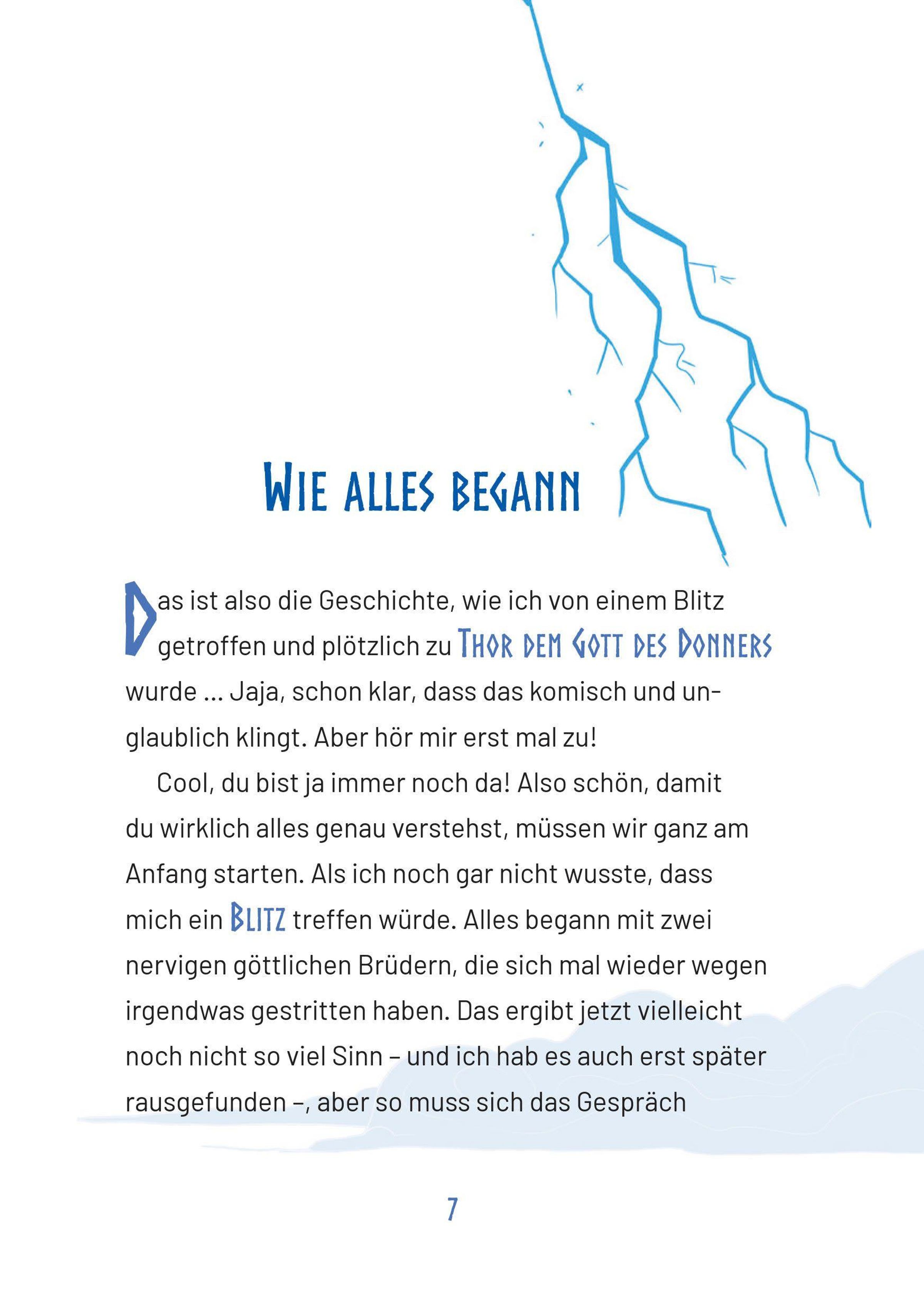 Auf der neuen Schule will Tom endlich zu den Coolen gehören und mit seiner Band den Talentwettbewerb gewinnen! Doch dann wird Tom mitten in der Probe vom Blitz getroffen, und plötzlich faselt eine Stimme ihm zu, dass er von nun an Thor der Donnergott sei. Na klar! Aber als er mit zig Hämmern im Bett aufwacht, ihm über Nacht ein Bart wächst und er Blitzschläge per High Five verteilt, fängt Tom an, die Geschichte zu glauben. Dann taucht auch noch ein Schüler auf, der sich als sein göttlicher Bruder Loki vorstellt. Er will Tom helfen, seine Kräfte in den Griff zu bekommen, sonst kann der sein Pausenbrot bald ganz allein auf dem Schulklo essen ... Aber ob Loki mit offenen Karten spielt?