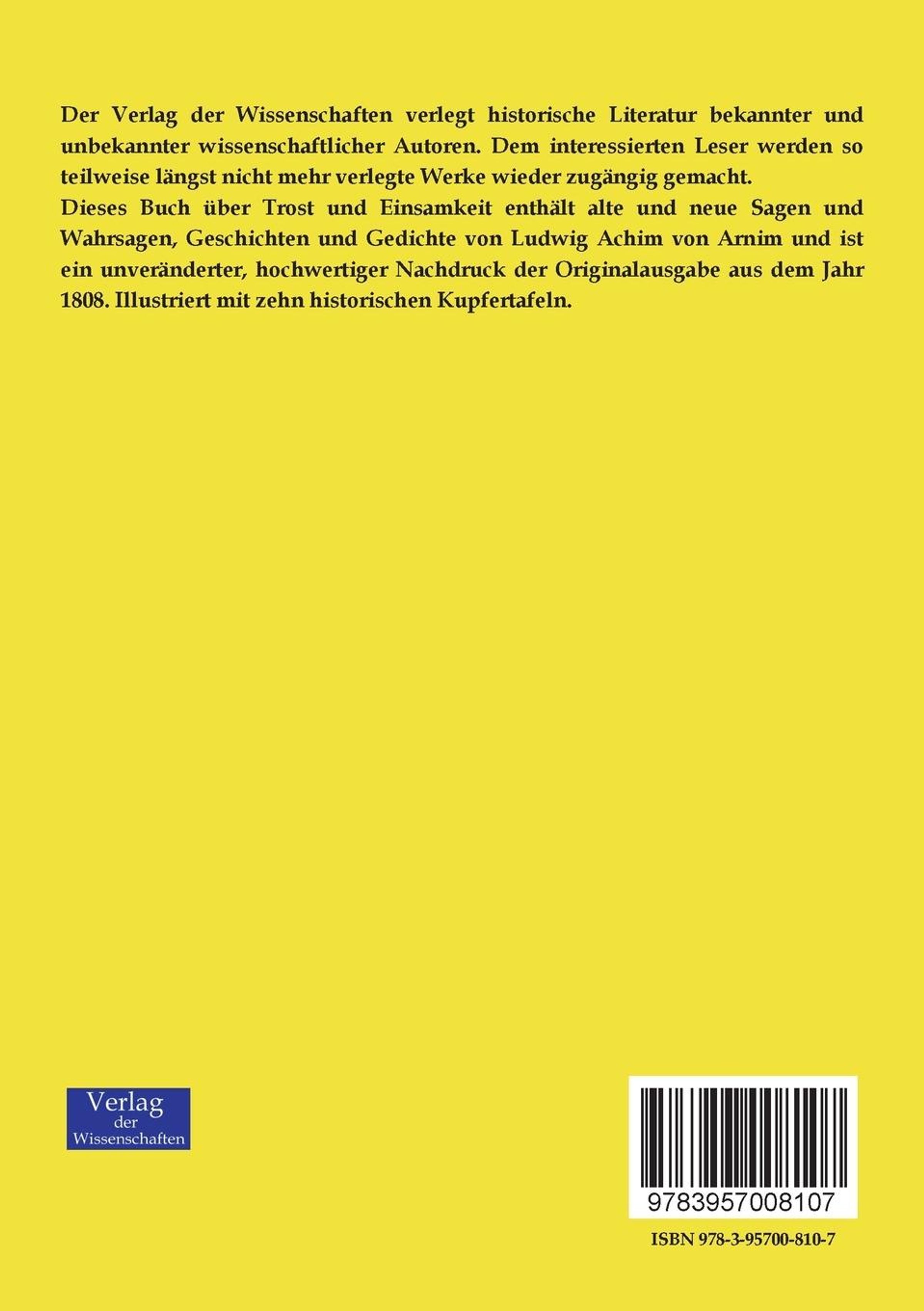Der Verlag der Wissenschaften verlegt historische Literatur bekannter und unbekannter wissenschaftlicher Autoren. Dem interessierten Leser werden so teilweise längst nicht mehr verlegte Werke wieder zugängig gemacht. Dieses Buch über Trost und Einsamkeit enthält alte und neue Sagen und Wahrsagen, Geschichten und Gedichte von Ludwig Achim von Arnim und ist ein unveränderter, hochwertiger Nachdruck der Originalausgabe aus dem Jahr 1808. Illustriert mit zehn historischen Kupfertafeln.
