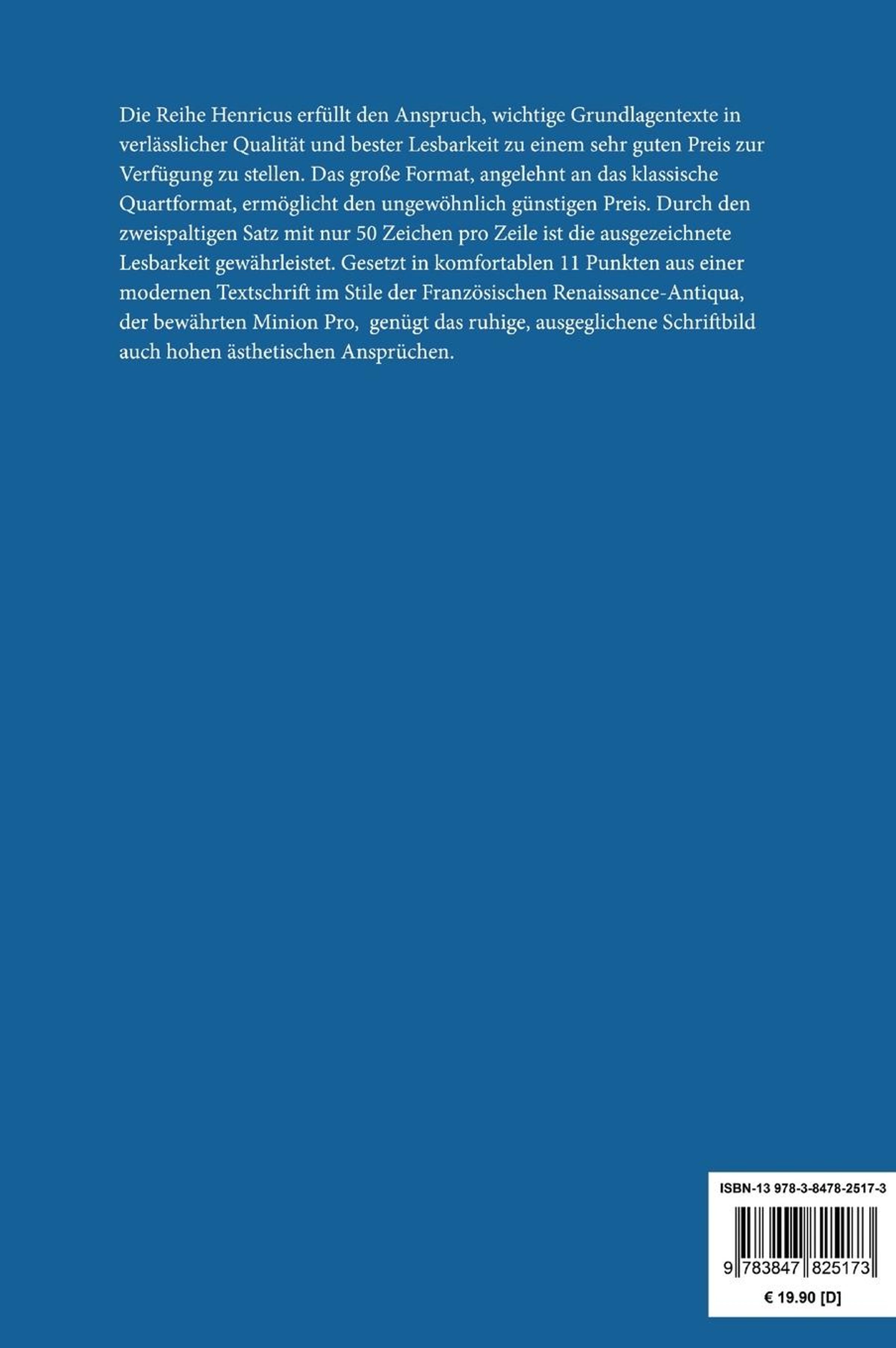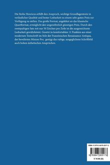 Die Reihe Henricus erfüllt den Anspruch, wichtige Grundlagentexte in verlässlicher Qualität und bester Lesbarkeit zu einem sehr guten Preis zur Verfügung zu stellen. Das große Format, angelehnt an das klassische Quartformat, ermöglicht den ungewöhnlich günstigen Preis. Durch den zweispaltigen Satz mit nur 50 Zeichen pro Zeile ist die ausgezeichnete Lesbarkeit gewährleistet. Gesetzt in komfortablen 11 Punkten aus einer modernen Textschrift im Stile der Französischen Renaissance-Antiqua, der bewährten Minion Pro, genügt das ruhige, ausgeglichene Schriftbild auch hohen ästhetischen Ansprüchen.