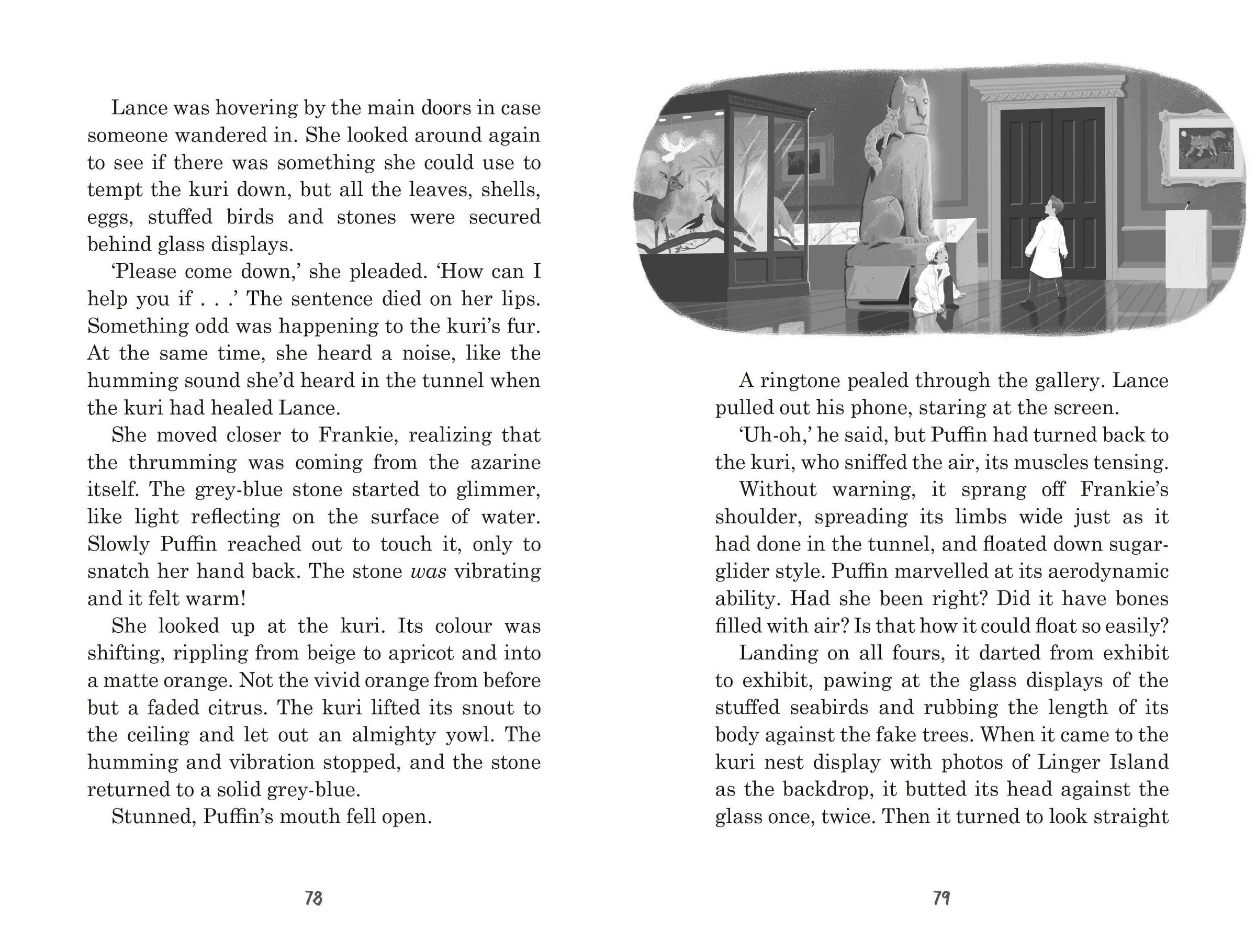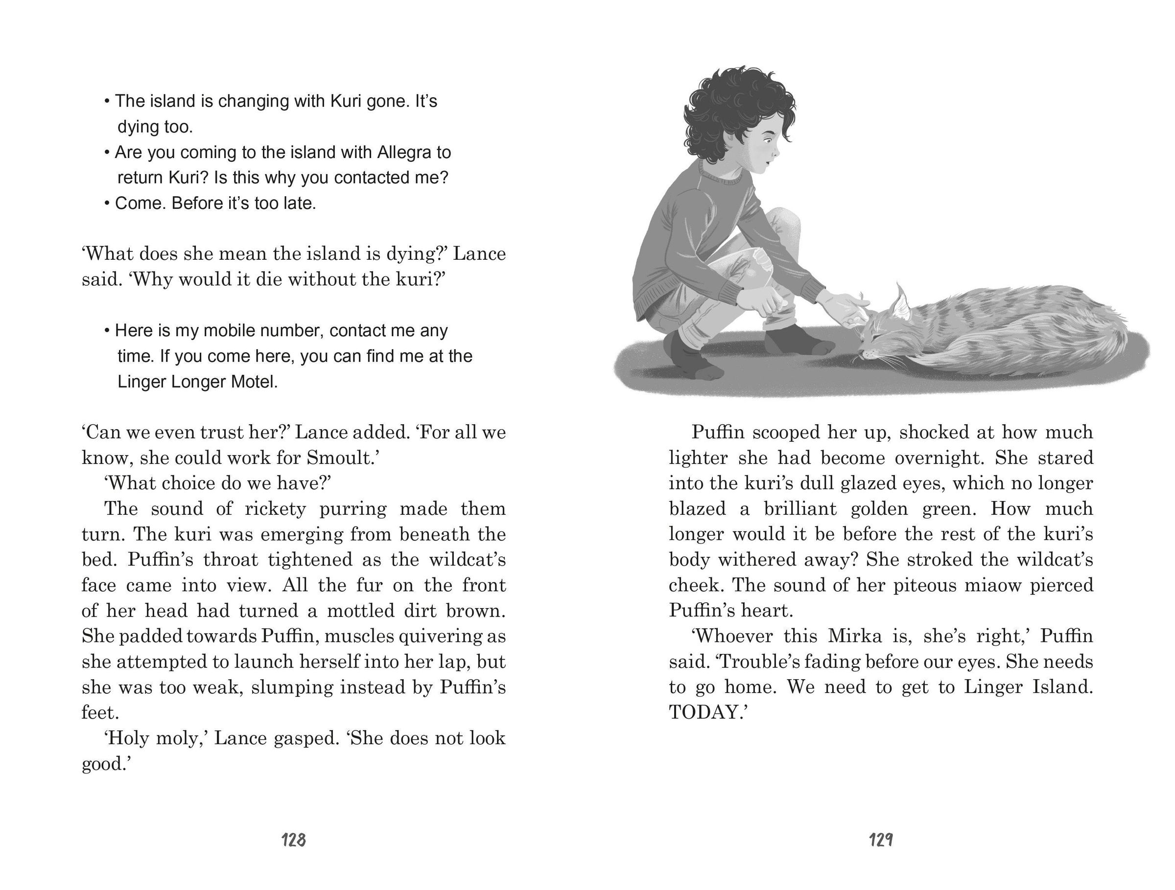 But standing in her way is the ominous Professor Smoult, a money-hungry scientist who wants to capture the kuri and steal its magic. Faced with a mammoth journey to the faraway Linger Island, Puffin and her best friend Lance must evade the professor and save the last wildcat before it's too late . . .