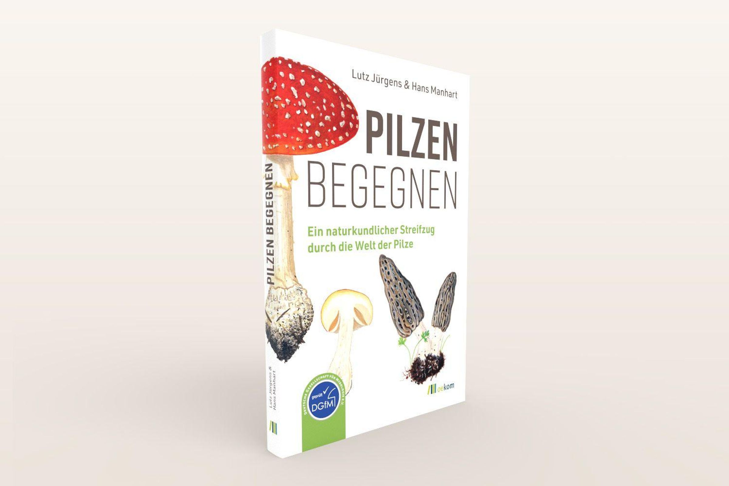 Text: "Lutz Jürgens & Hans Manhart, PILZEN BEGEGNEN, Ein naturkundlicher Streifzug durch die Welt der Pilze". Illustrationen von Pilzen, DGfM-Logo., Buch