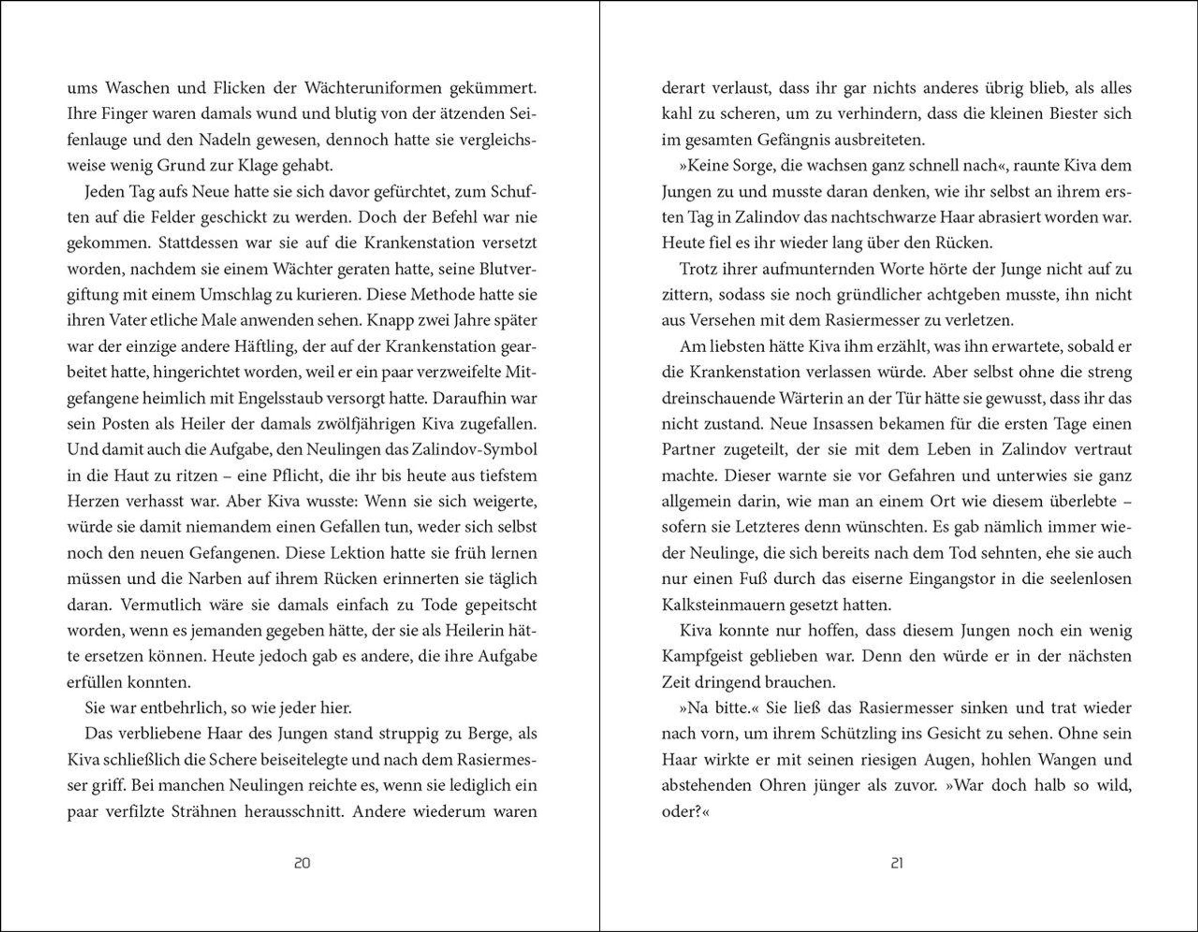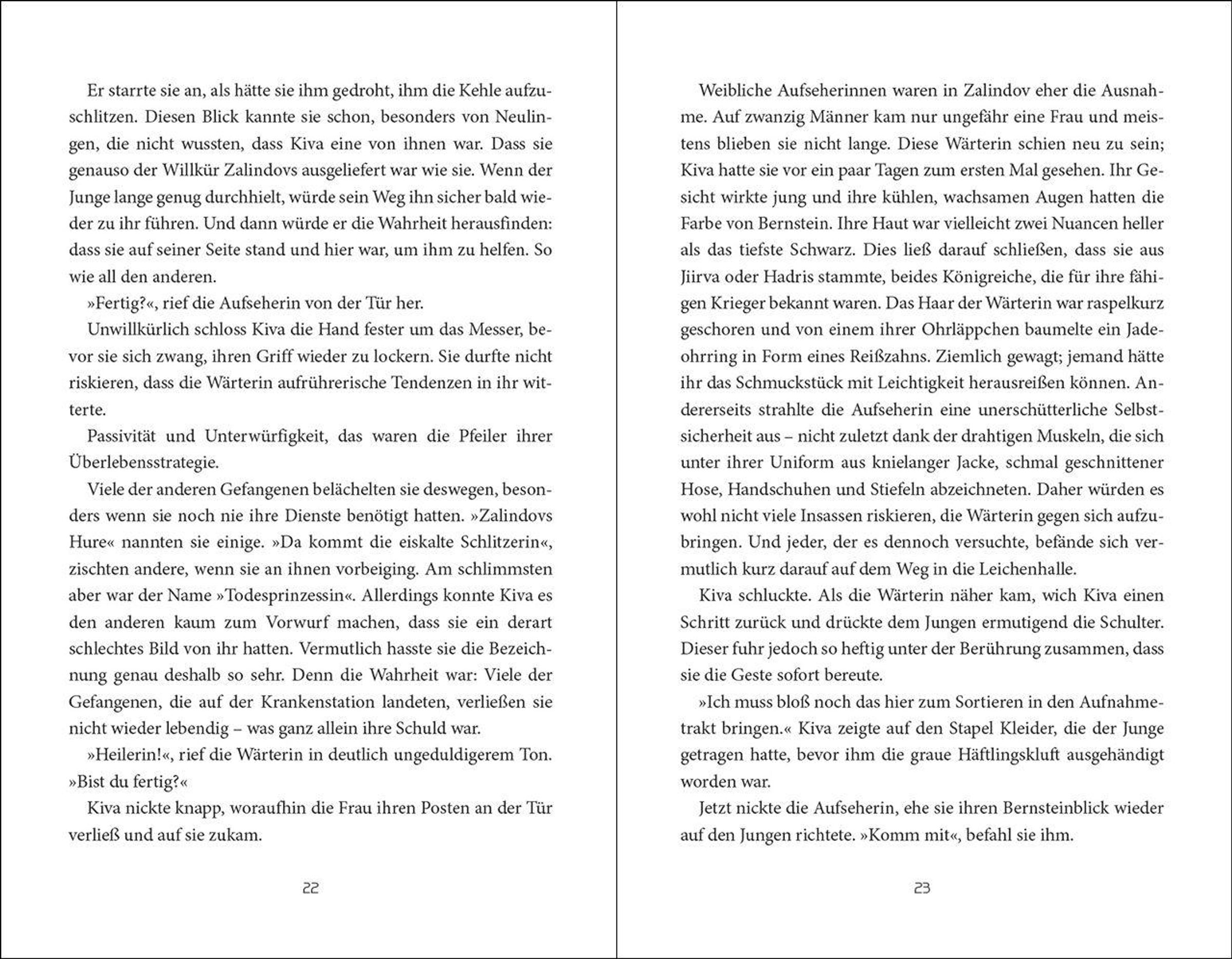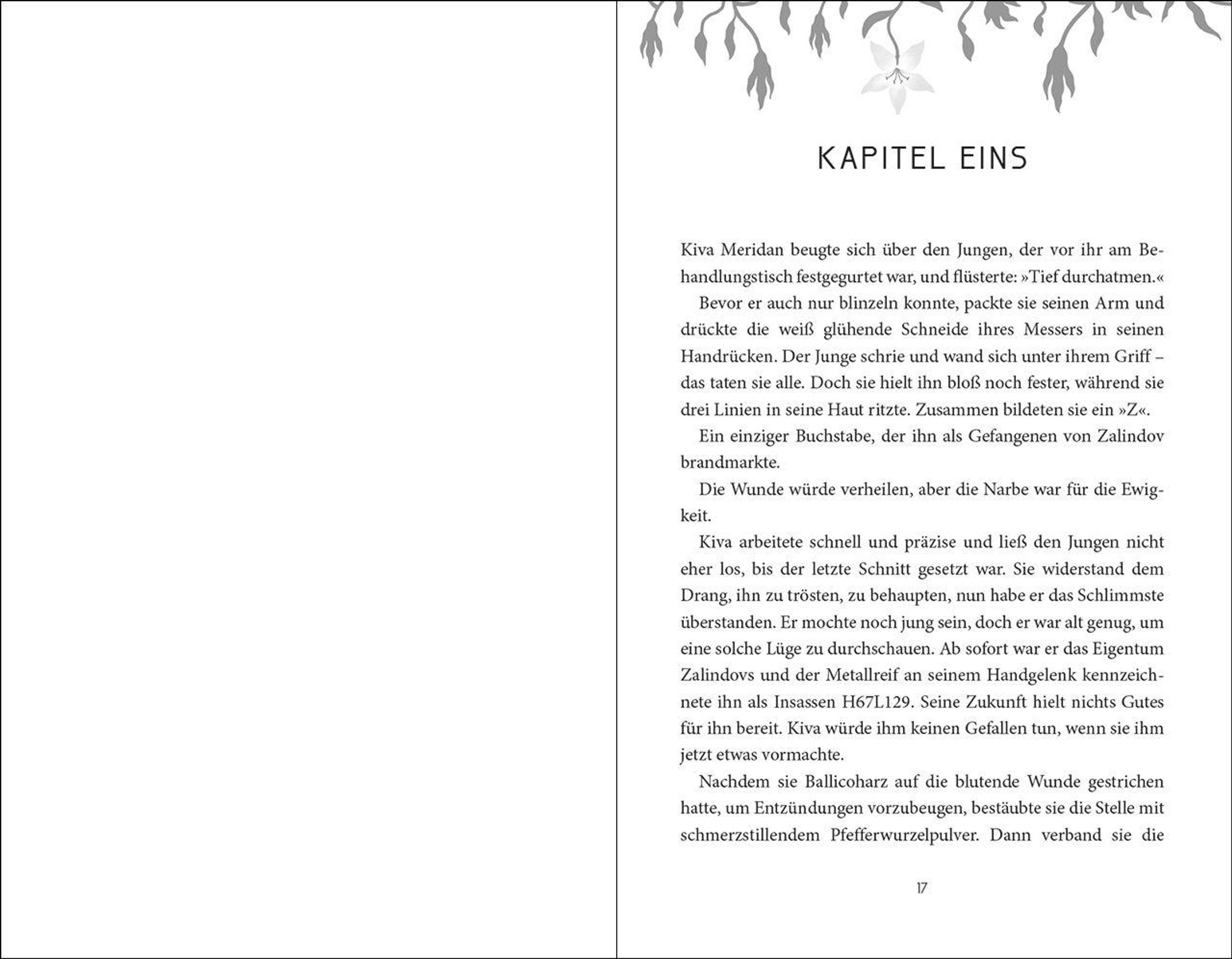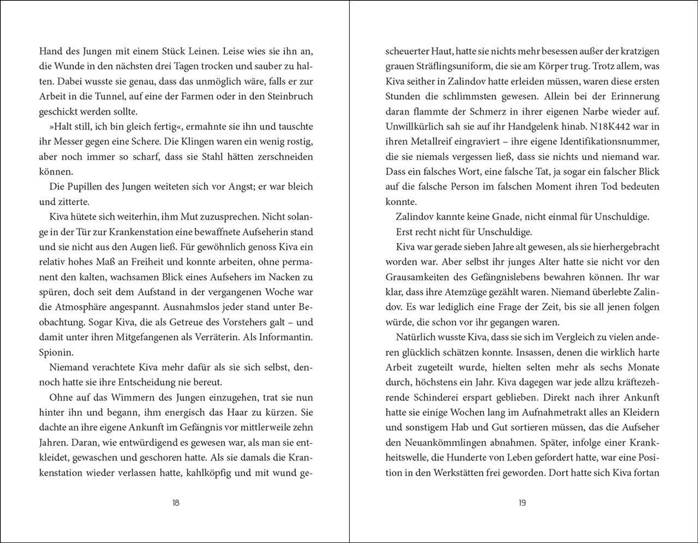 Ihre Aufgabe ist es, Leben zu retten. Doch was, wenn sie dafür ihr eigenes aufs Spiel setzen muss? Seit ihrer Kindheit lebt die siebzehnjährige Kiva in Zalindov - dem brutalsten Gefängnis von Wenderall. Als Heilerin kümmert sie sich um alle Insassen. Doch um die Rebellenkönigin zu retten, muss Kiva nicht nur herausfinden, woran Tilda erkrankt ist, sondern sich auch an ihrer Stelle dem Elementarurteil unterziehen: vier Prüfungen, um Tildas Unschuld zu beweisen. Besteht Kiva, sind beide frei. Sollte sie scheitern, stirbt nicht nur die Rebellenkönigin, sondern auch Kiva selbst ...