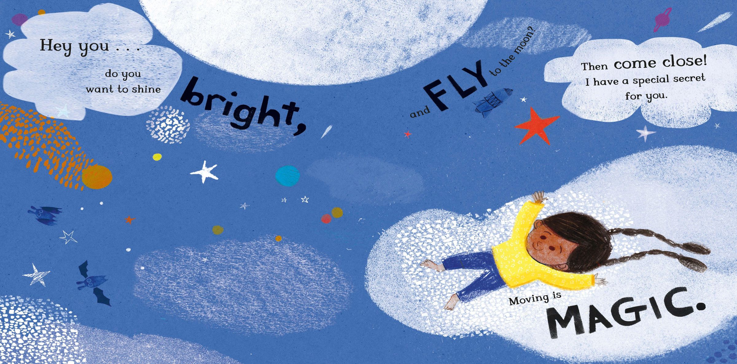 Did you know that your body is magic? You can be anything if you just move. Embark on a joyous journey to the moon and back again in this uplifting, encouraging story about the joy of moving in your own way.
