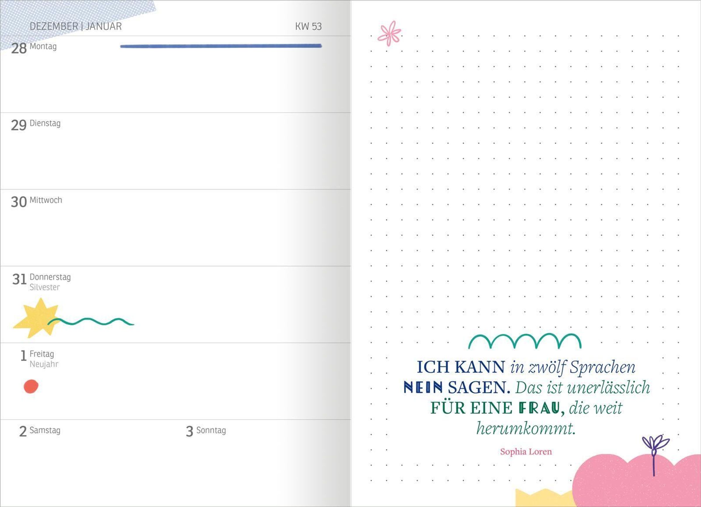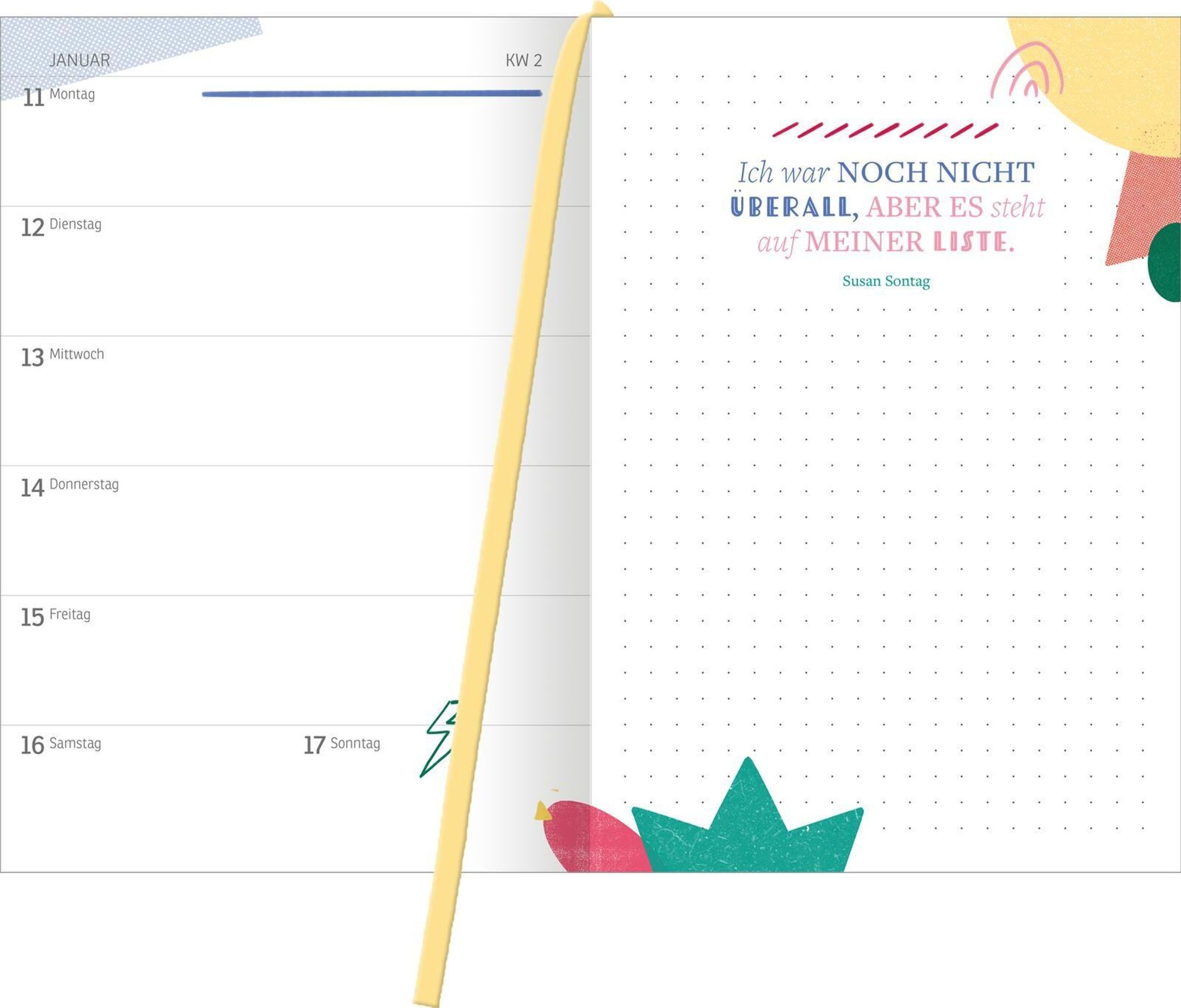- Buchkalender voller Lebensfreude, auch für die Handtasche: Übersichtlicher Wochenkalender 2027 mit einer Kalenderwoche plus einer Seite für Notizen pro Doppelseite, schön gestalteten Trennseiten und im DIN-A5-Format (14, 7 x 21, 2 cm)