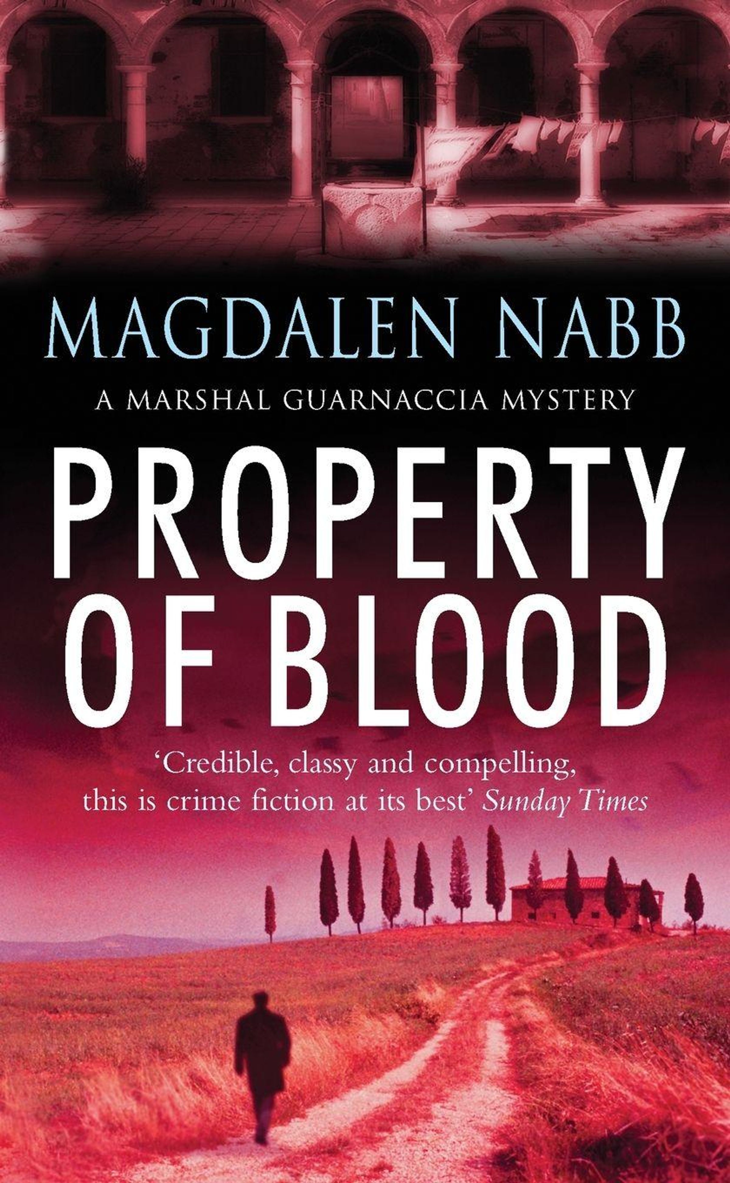 "PROPERTY OF BLOOD" – Ein Kriminalroman von Magdalen Nabb. Ein Mann geht auf einem Feldweg Richtung Zypressen und Gebäude., Buch