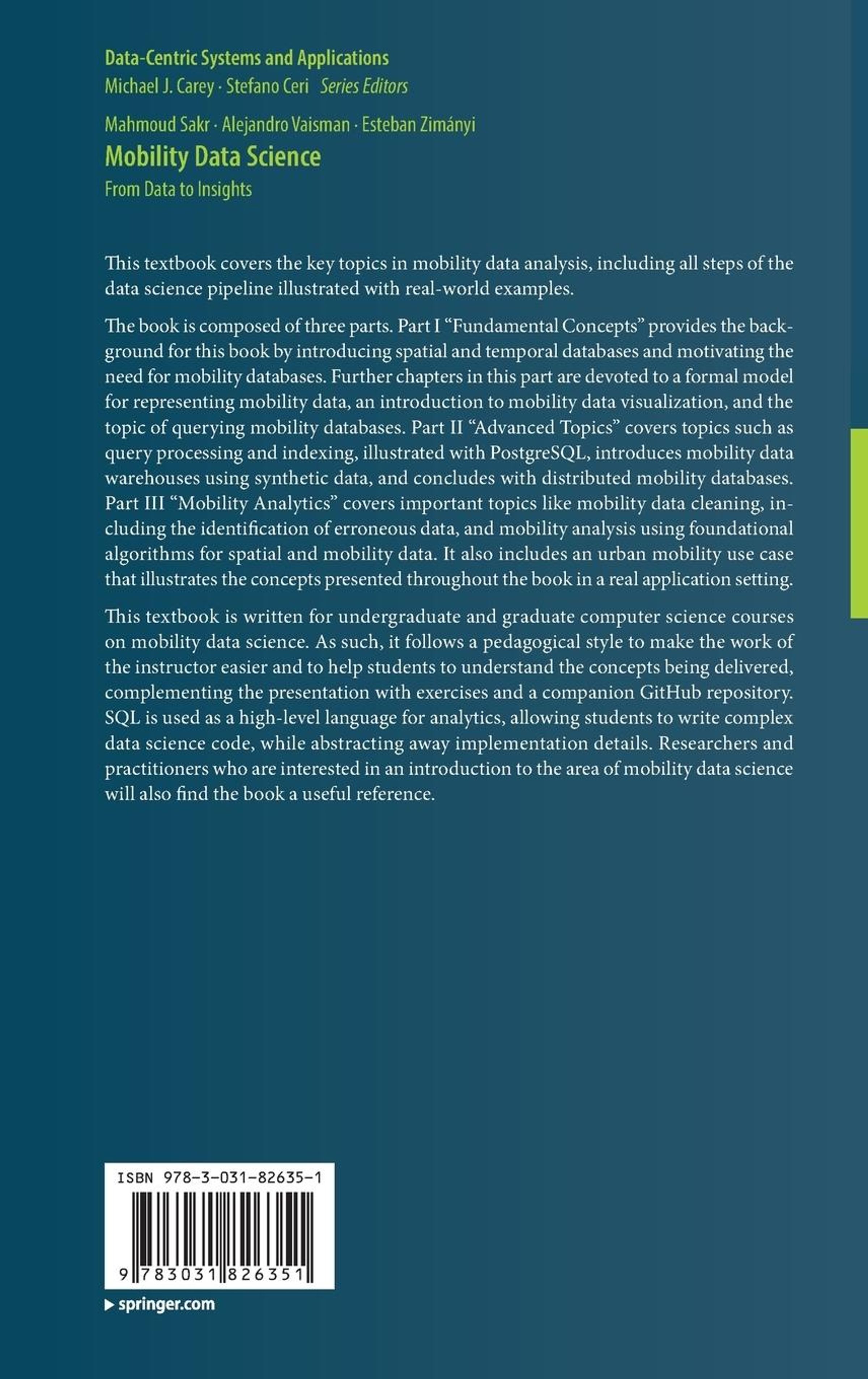 Preface .- Part I Fundamental Concepts 1 Mobility Data Science 2 Spatial, Temporal, and Mobility Databases 3 Mobility Data Representation 4 Mobility Data Visualization 5 Querying Mobility Databases .- Part II Advanced Topics 6 Query Processing and Indexing 7 Mobility Data Warehouses 8 Distributed Mobility Databases .- Part III Mobility Analytics 9 Mobility Data Cleaning 10 Mobility Data Analysis 11 Urban Mobility Use Case 12 Concluding Remarks.