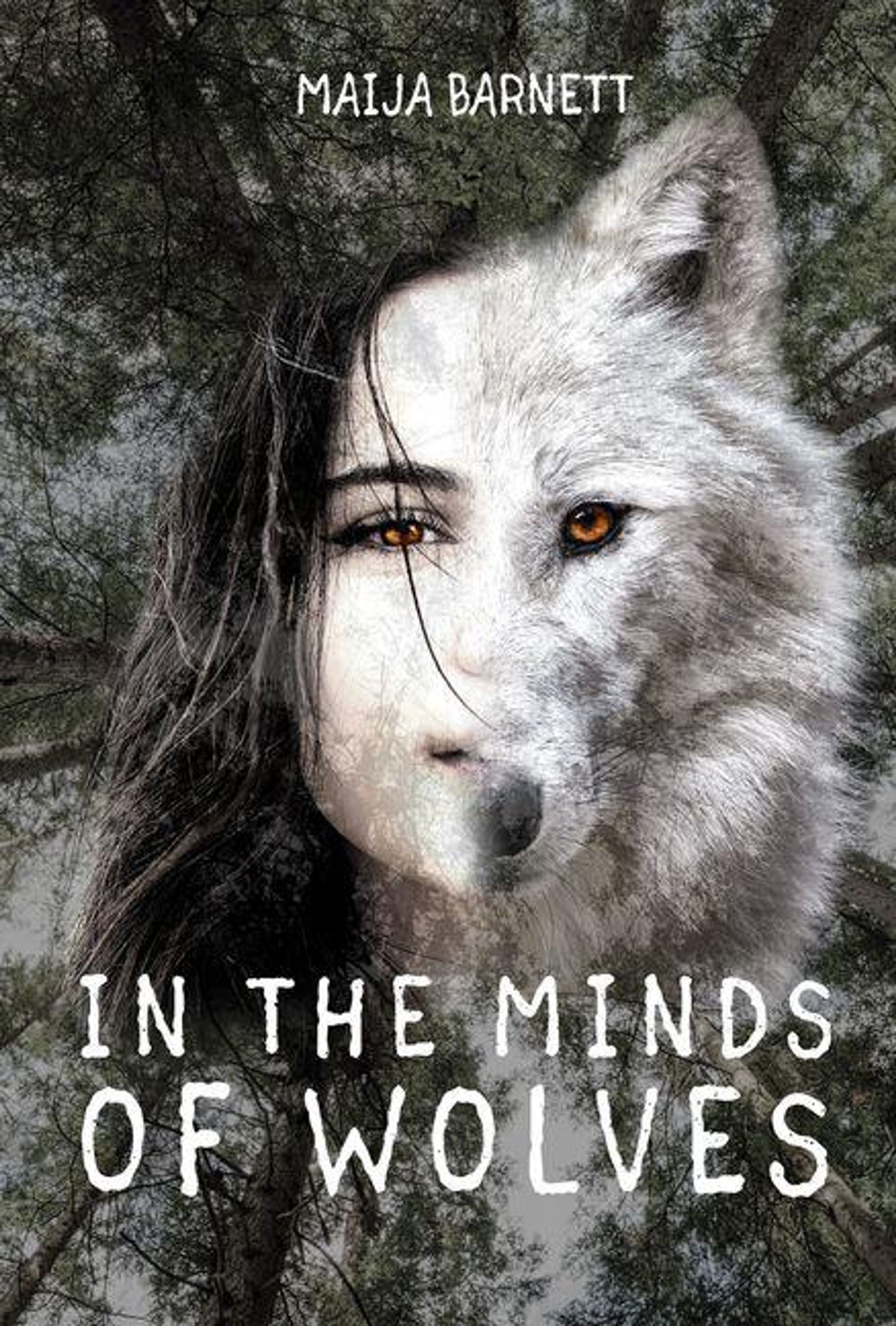 Oben steht "Maija Barnett", unten "In the Minds of Wolves". Gesicht einer Frau verschmilzt mit einem Wolf, im Wald., Buch