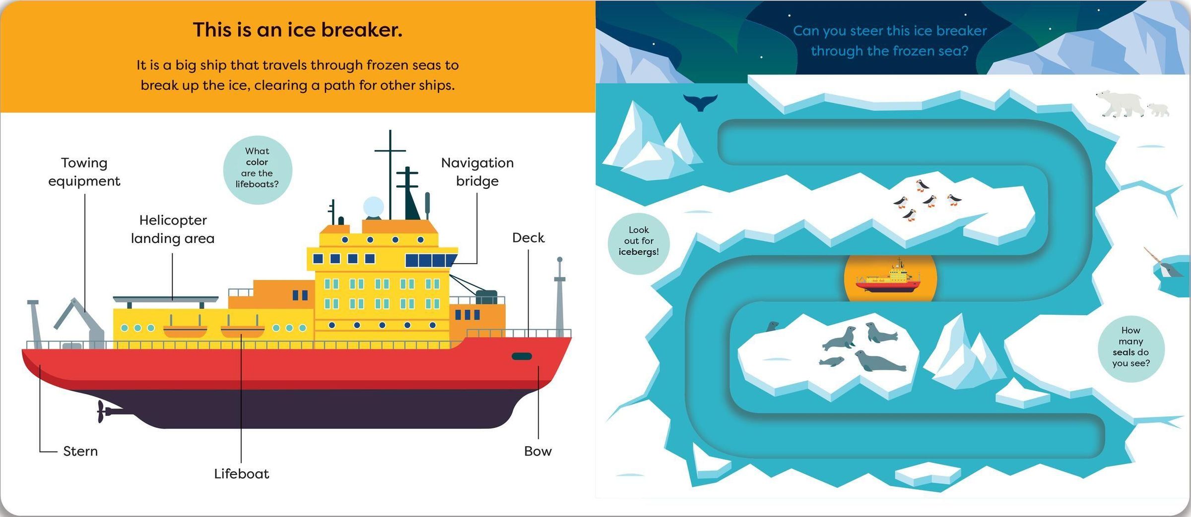 In this interactive series with easy-to-use, durable sliders, your toddler can steer a snowplow, a snowmobile, an icebreaker, and a bobsled! Perfect for helping toddlers develop hand-eye coordination, while also encouraging interaction with simple winter-themed first words, with clear diagrams, and helpful discussion prompts to learn through play.