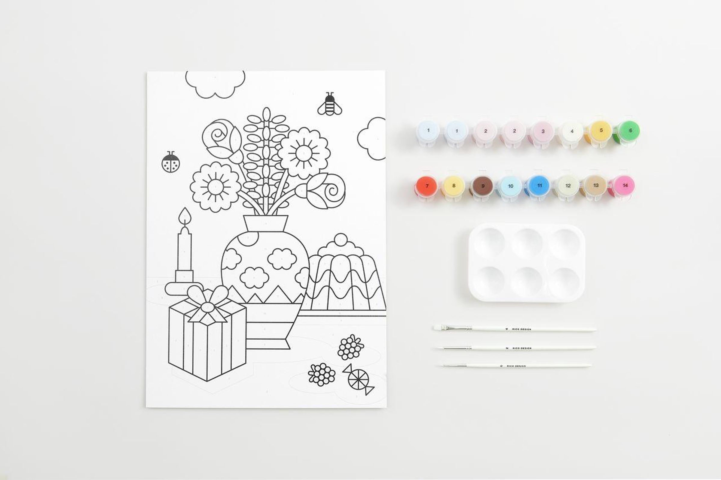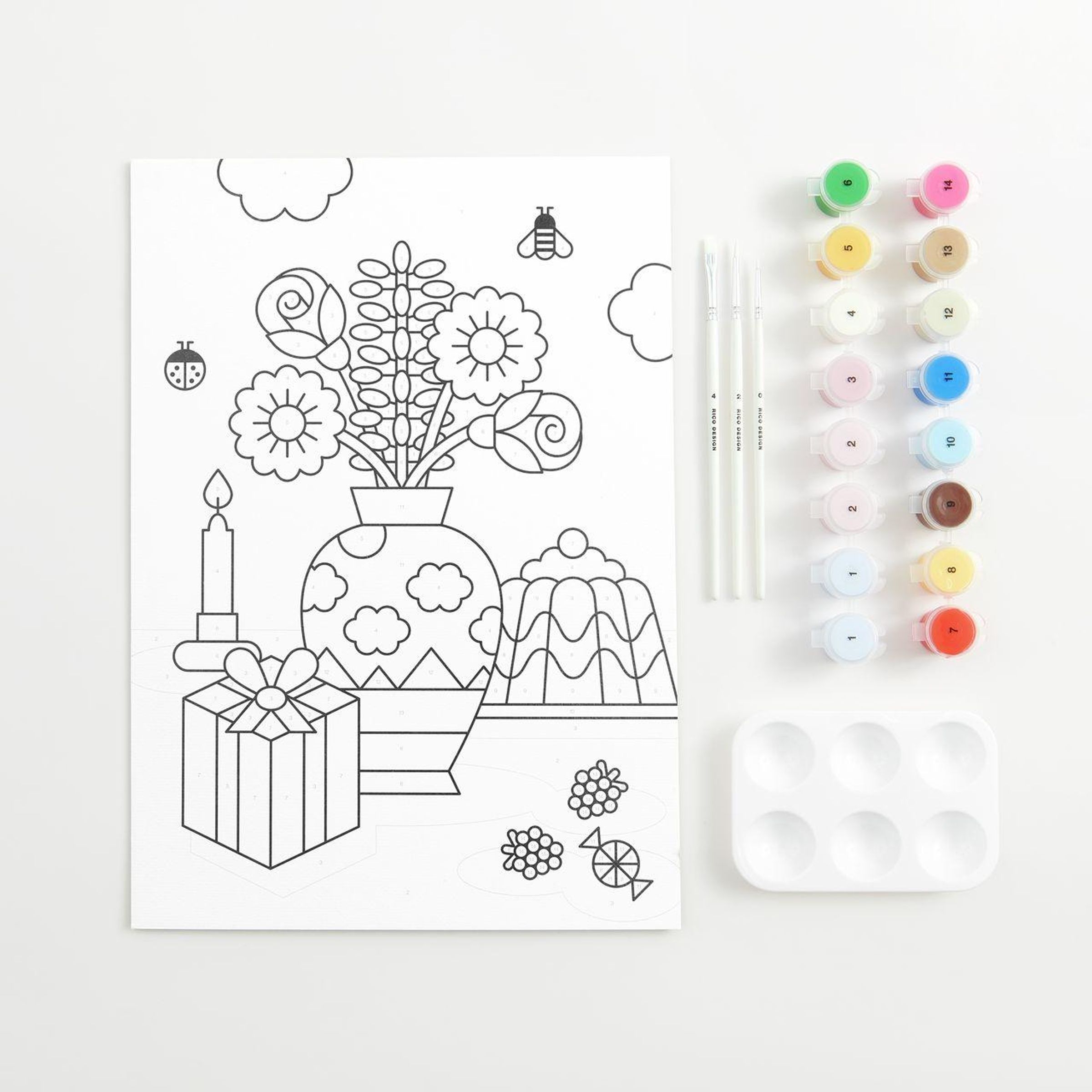 - Inhalt: 16 Farbtöpfe à 3, 65 ml, 1 Malkarton und 3 Pinsel