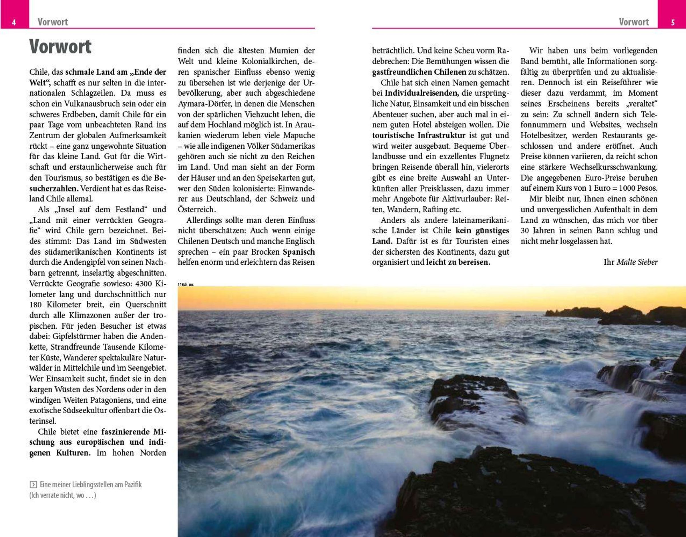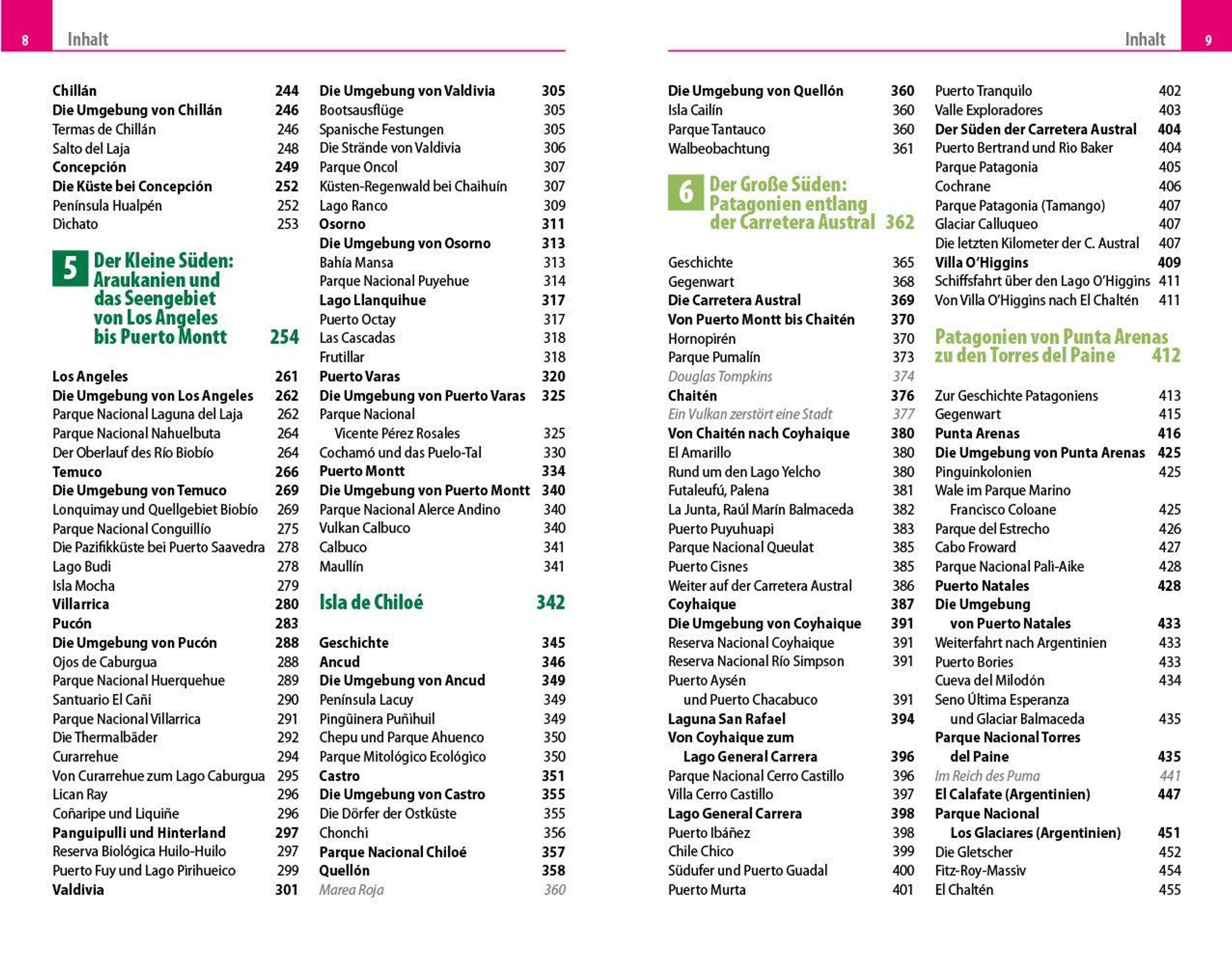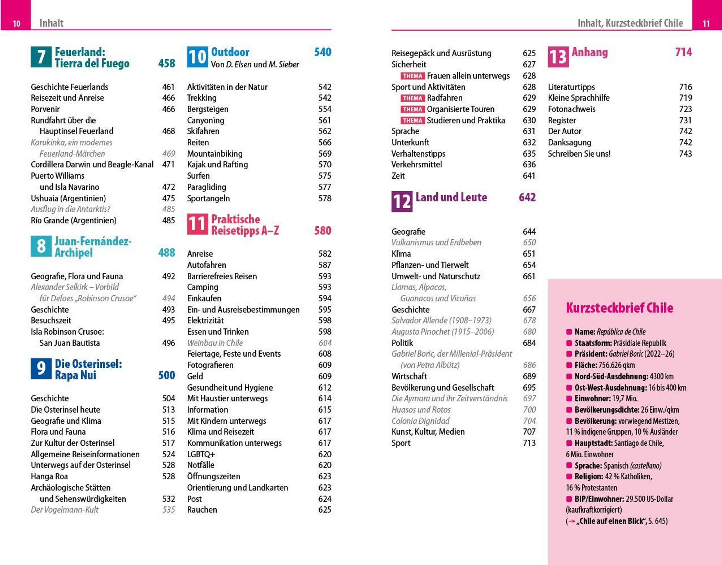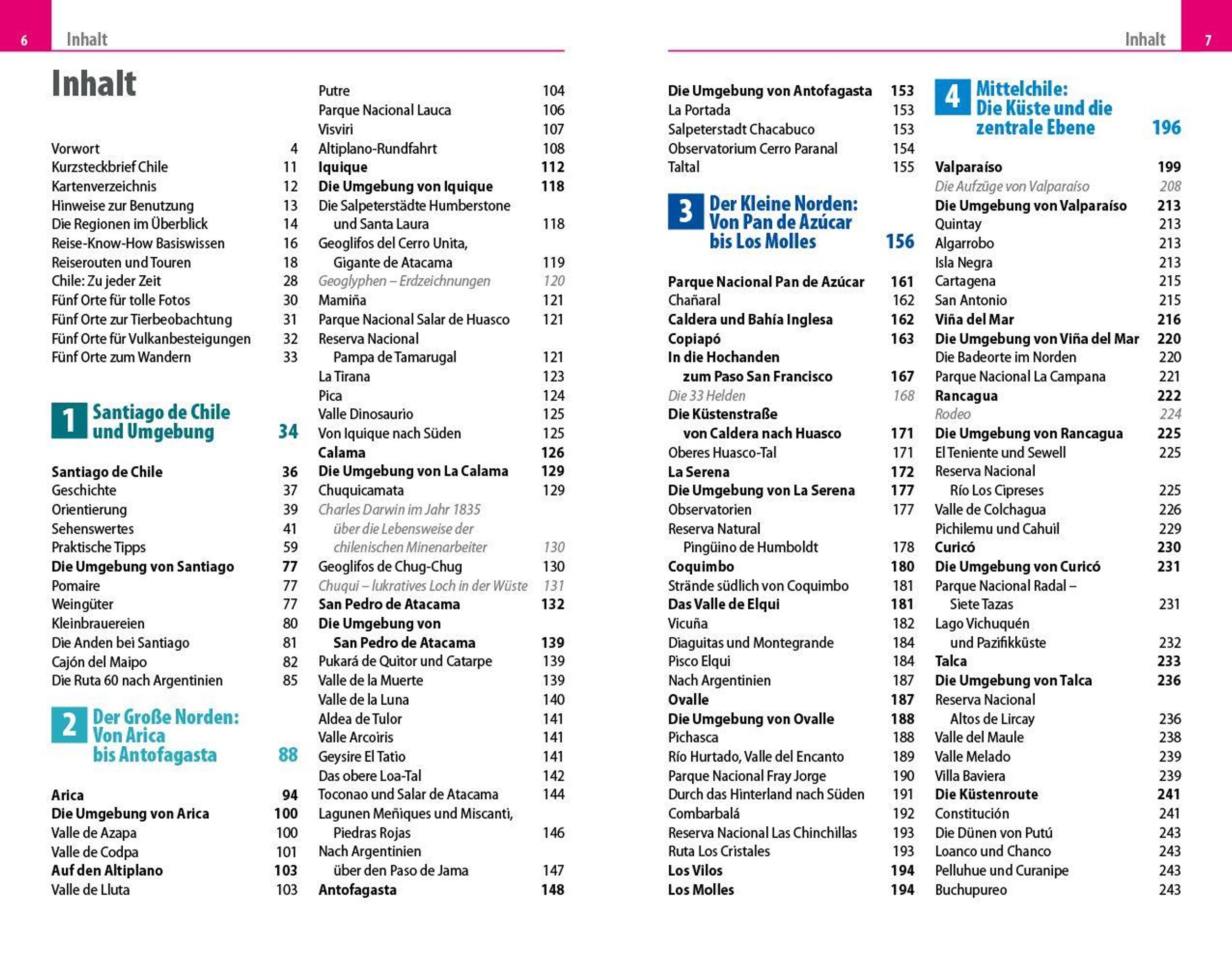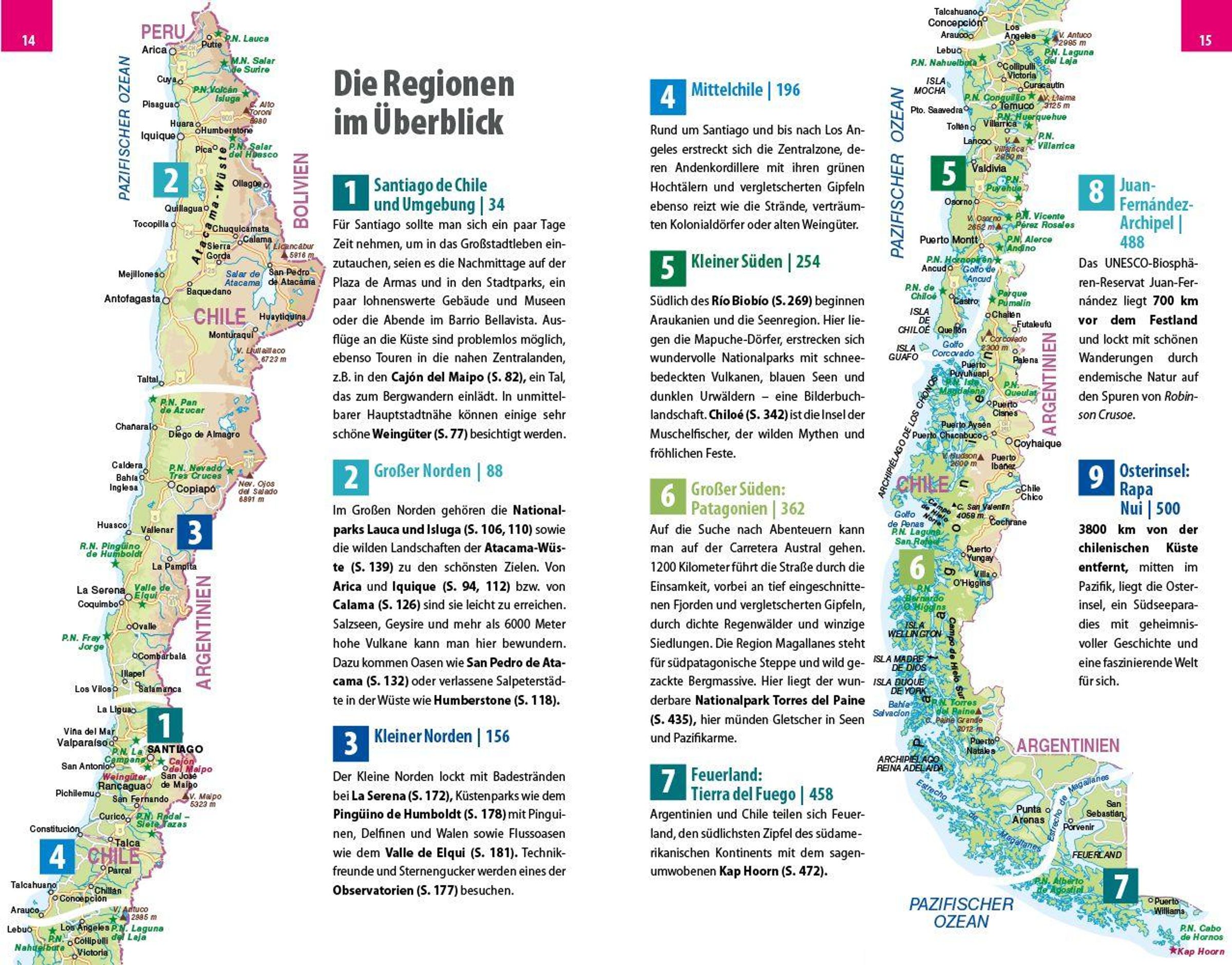 Übersichtsseiten mit den bedeutendsten Regionen im Überblick: Santiago de Chile und Umgebung, Großer Norden, Kleiner Norden, Mittelchile, Kleiner Süden, Patagonien, das Feuerland Tierra del Fuego, Juan-Fernández-Archipel und die Osterinsel Rapa Nui