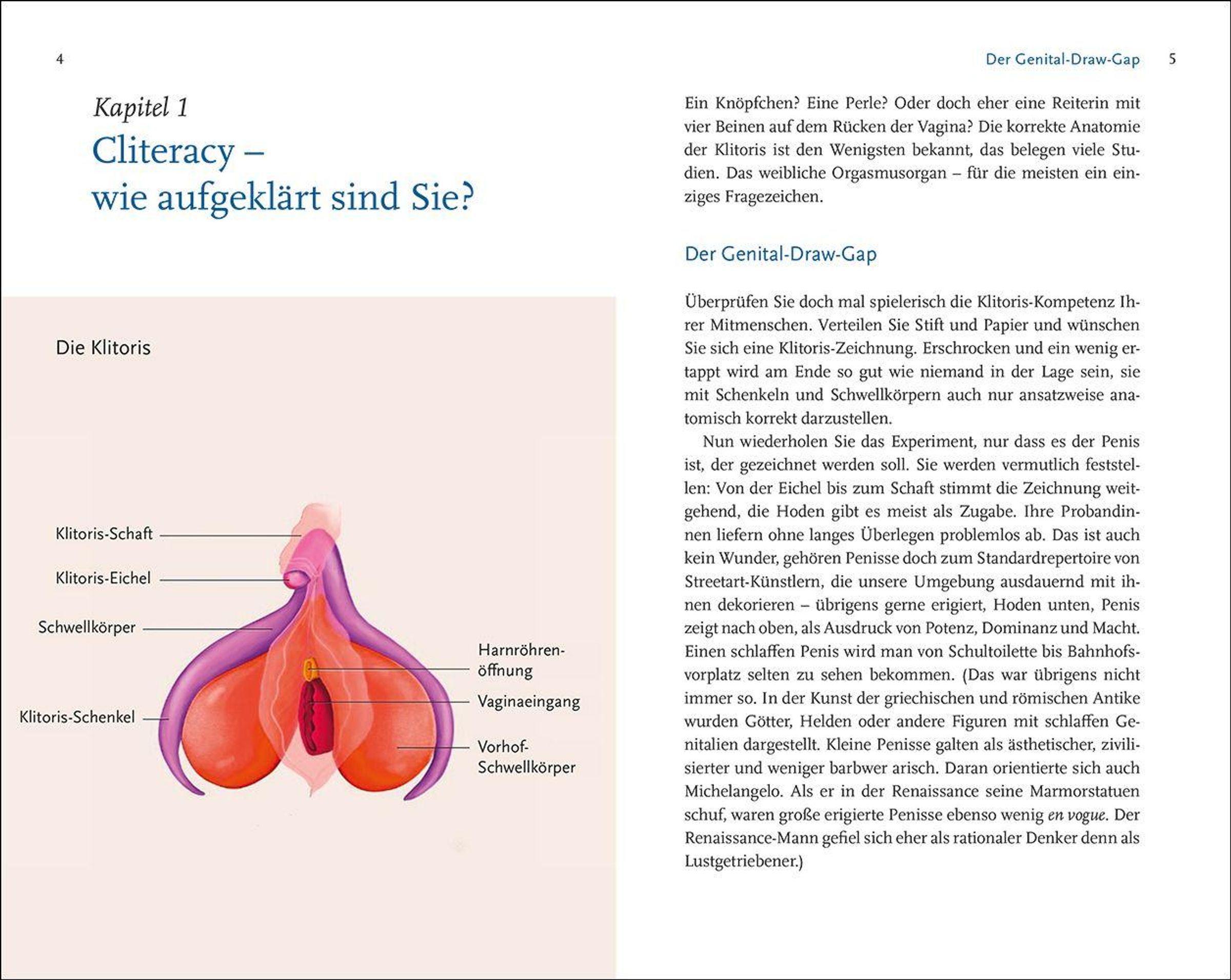 Wüssten Sie, wie man eine Klitoris zeichnet? Wenn nicht - Sie sind nicht allein. Über das weibliche Lustorgan ist viel zu wenig bekannt. Doch im 19. Jahrhundert wusste man es noch: Die Klitoris ist mindestens so groß wie der Penis beziehungsweise der durchschnittliche Penis sogar etwas kleiner als die Klitoris. Sie hat eine äußerlich sichtbare Eichel - und darüber hinaus vier mit Schwellkörpern gefüllte Schenkel. Danach wurde das Wissen um das potente weibliche Orgasmusorgan über Jahrzehnte ignoriert, mit weitreichenden Folgen für die Wahrnehmung weiblicher Lust. Doch Frauen wollen nicht weniger Sex als Männer, sie wollen oft nur nicht den, der ihnen geboten wird. Nicht Penis und Vagina sind einander entsprechende Organe, wie unsere auf Penetration fixierte Kultur uns glauben macht, sondern Penis und Klitoris: Sie entstehen aus denselben embryonalen Anlagen.