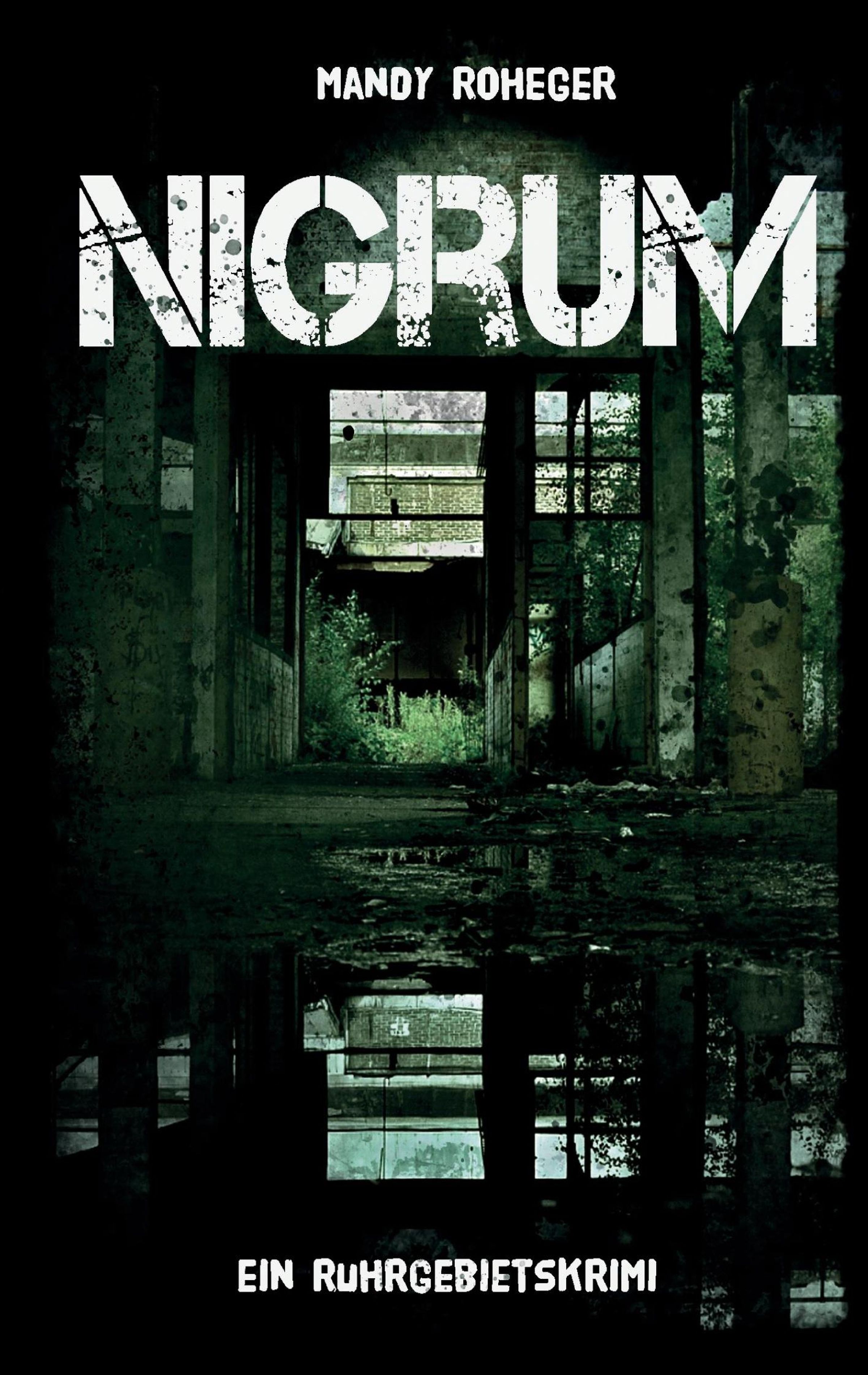 „MANDY ROHEGER NIGRUM. Ein Ruhrgebietskrimi.“ Verlassene Fabrik, düstere Töne, Pflanzen wachsen wild., Buch